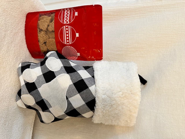 Kickoff the holidays by hanging your beloved pup's Stocking filled with homemade dog treats! This black and white paw shaped stocking has a hang tag on it and at the longest part is about 12 inches tall. This dog stocking comes with your choice of Homemade Dog Treats! You can select the flavor of treats below. The Peanut Butter treats are made with whole wheat flour, peanut butter, eggs and honey. The pumpkin treats are made with whole wheat flour, 100% pumpkin puree, eggs, peanut butter and cinnamon. The Bacon, Egg and Cheese treats are made with Bacon, Egg, Cheese and Oat Flour. The Grain Free Gluten Free Treats are dairy free and made with 100%Pumpkin Puree, Coconut Flour, Cage Free Eggs, Turmeric, and Cinnamon. For all our products that contain cinnamon, we only use the cinnamon identified by Consumer Reports as the safest grocery store cinnamon brand.