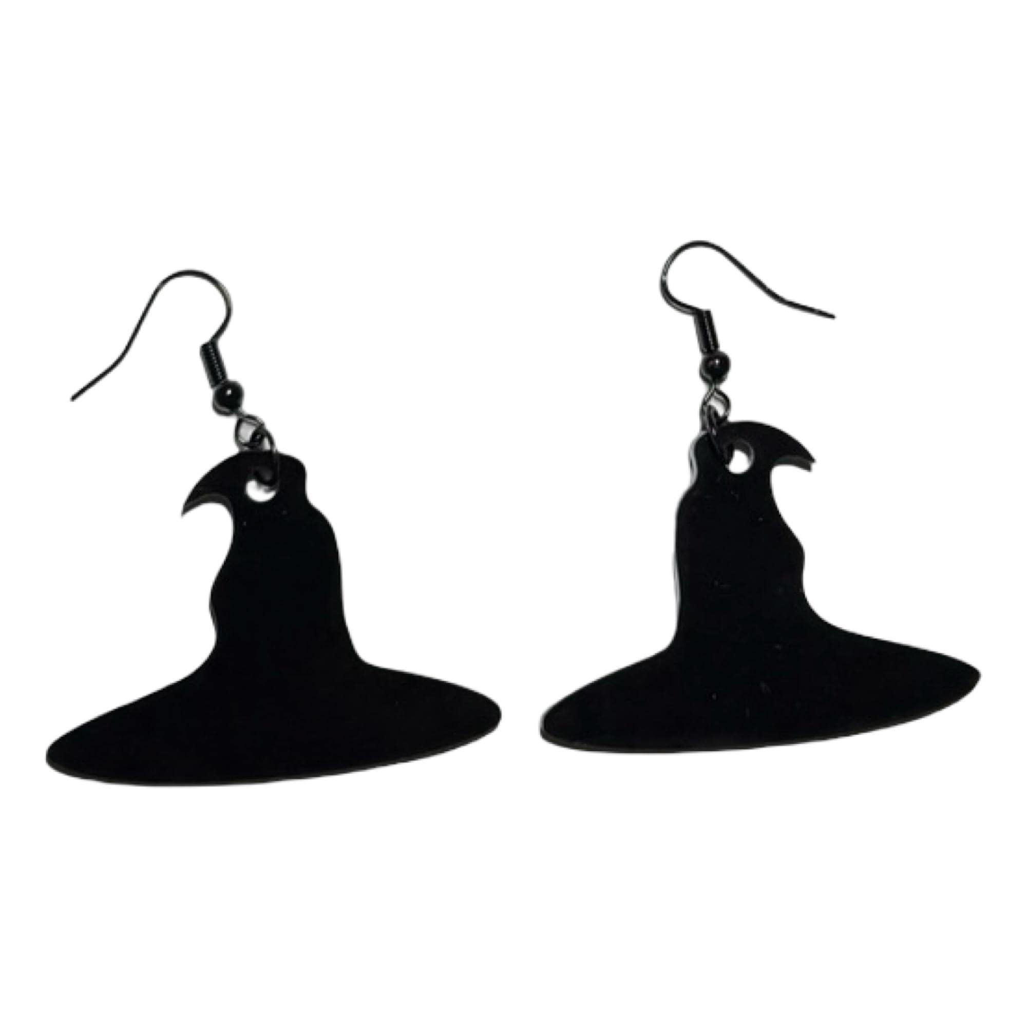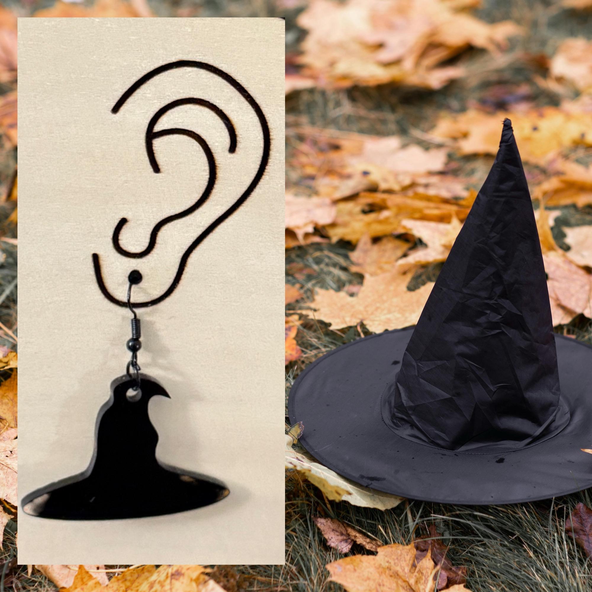 These are a pair of black witch hat laser cut lightweight acrylic earrings. They are made from 1/8 in thick medium black acrylic. They are on ear wires. All metal components are silver, gold, or brass plated, or black alloy, nickel & lead free, and hypoallergenic. They are approx. 1.25" long. Backs not included but available upon request.