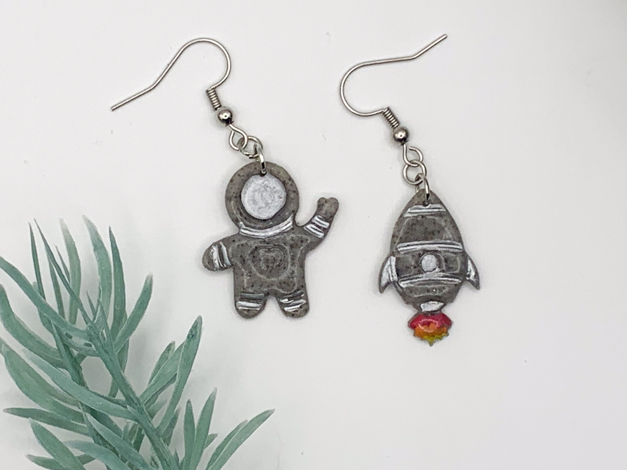 Adventure awaits! These mismatched earrings feature a gray astronaut and a rocket with fiery details for a playful, space-inspired design.