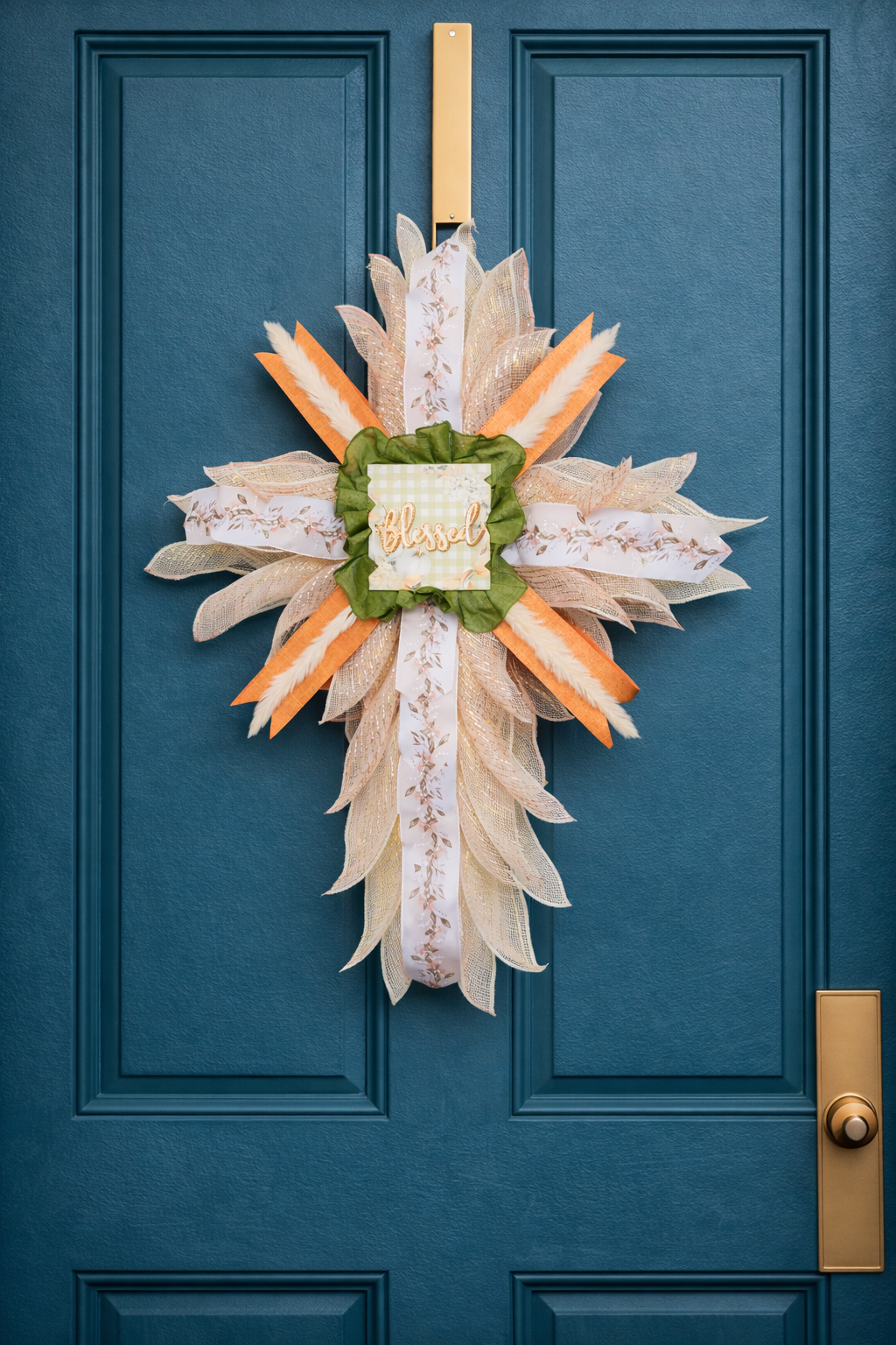 Welcome guests with faith and gratitude using this beautifully handcrafted cross wreath. Designed with layered neutral mesh, soft cream tones, and warm accents, this piece features a charming “Blessed” centerpiece framed by greenery and coordinated ribbon details. The dimensional design creates a graceful, uplifting statement for your front door or wall.