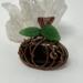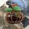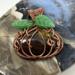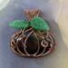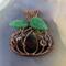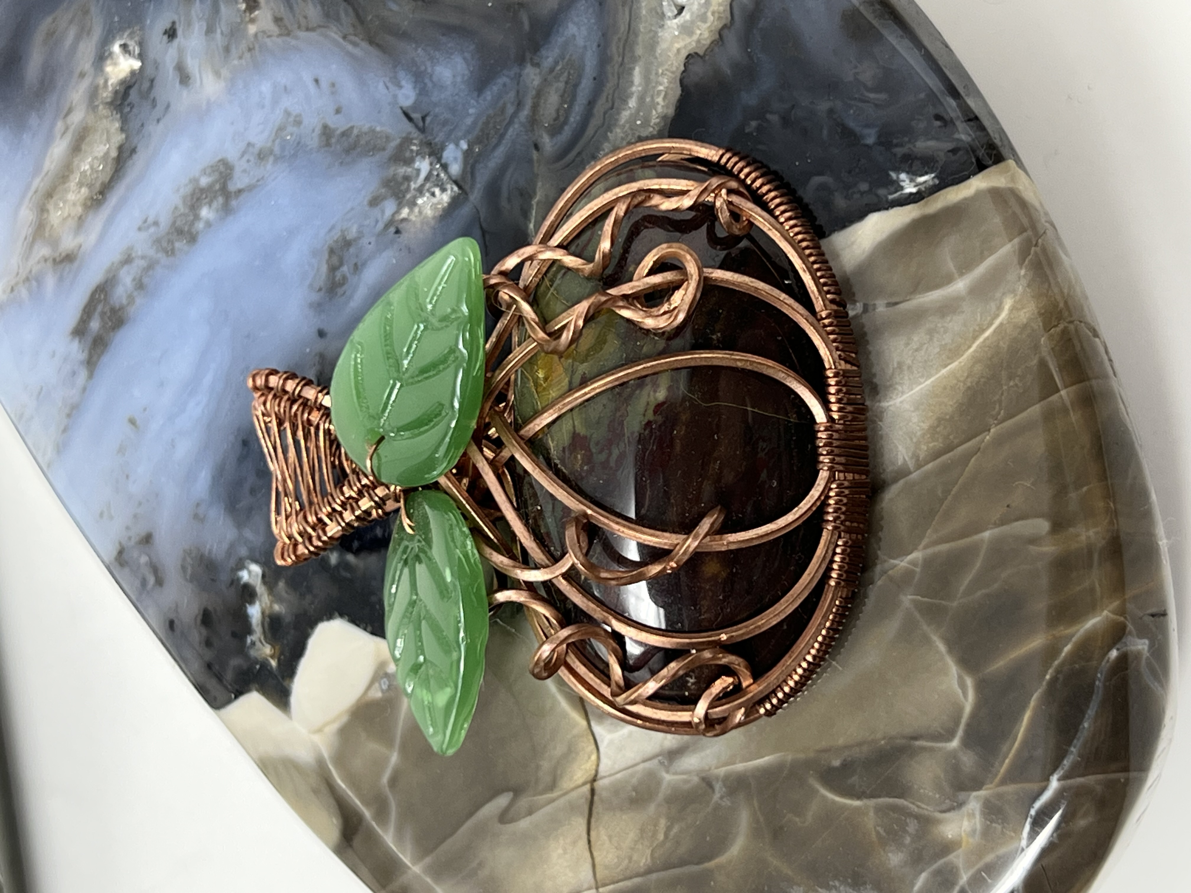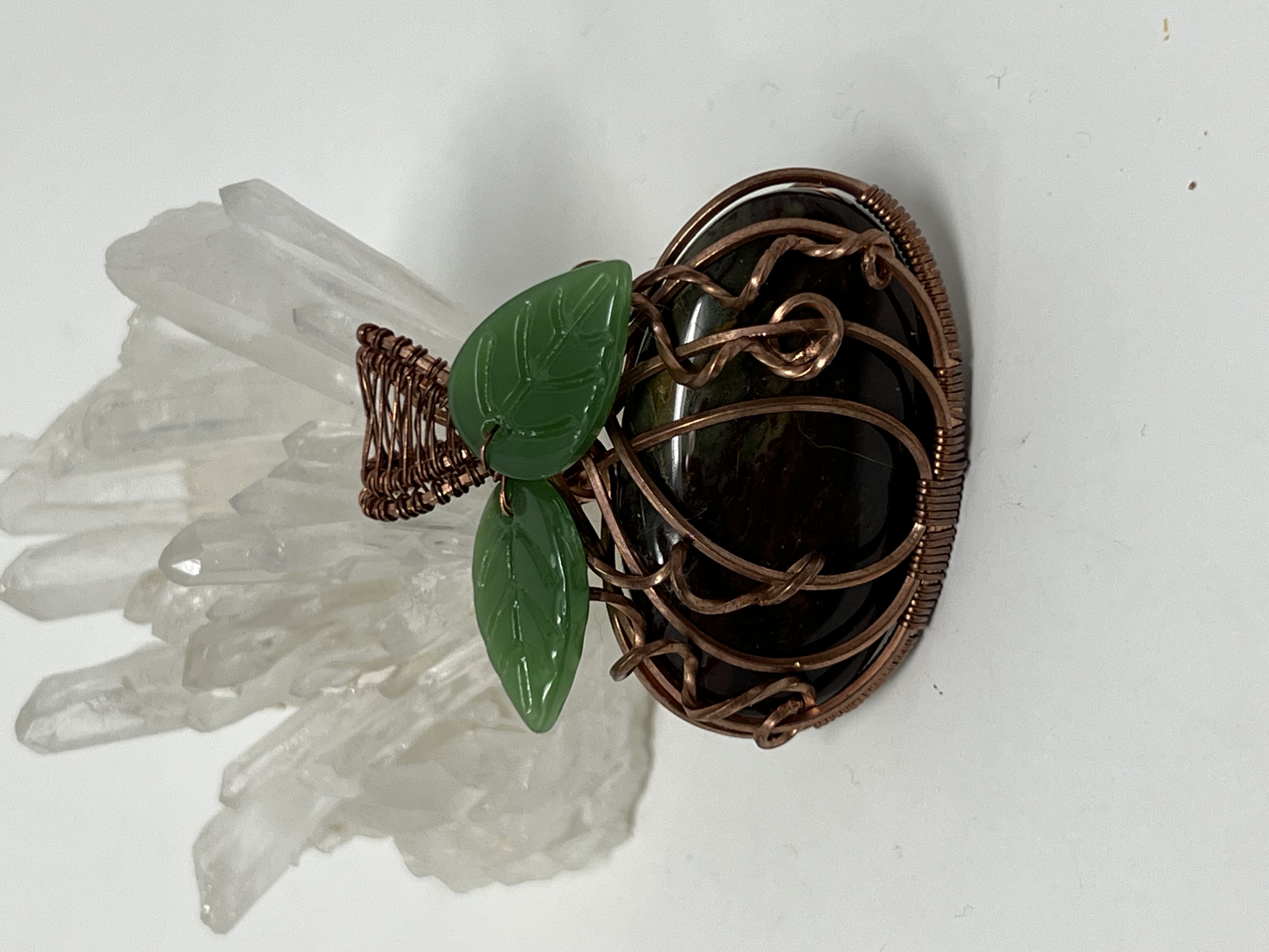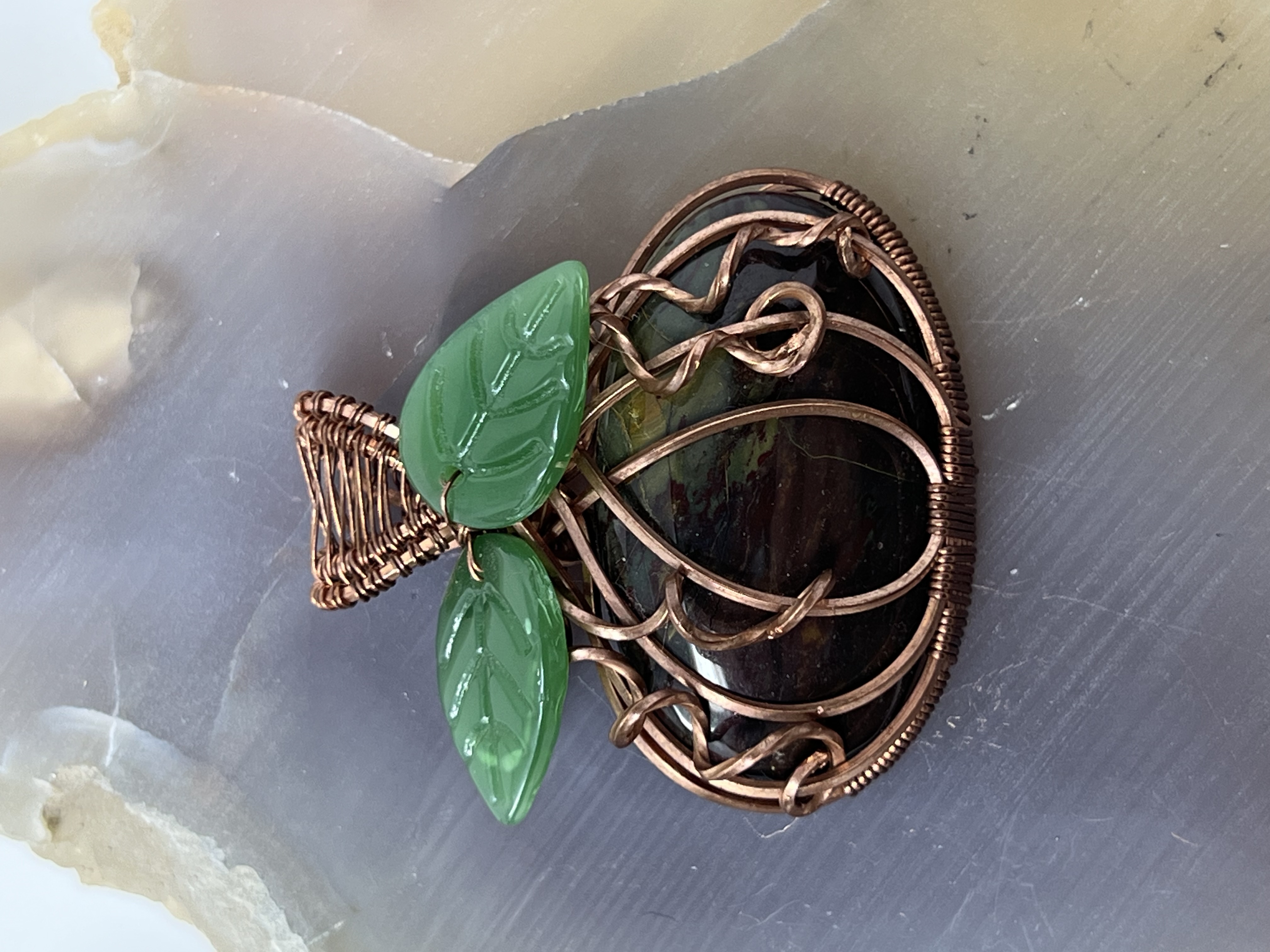 This simple pendant features a bloodstone cabochon that has been wrapped in copper wire to make the pumpkin shape. I used 5 pieces of 20 gauge square copper wire for the pumpkin frame and the vines. I twisted some of the pieces to give it a little more dimension. The wires are connected at the bottom with 24 gauge half round copper wire. The bail is made by wrapping a piece of 28 gauge round copper wire around 4 pieces of the 20 gauge square copper wire. This piece is handmade in Minnesota.