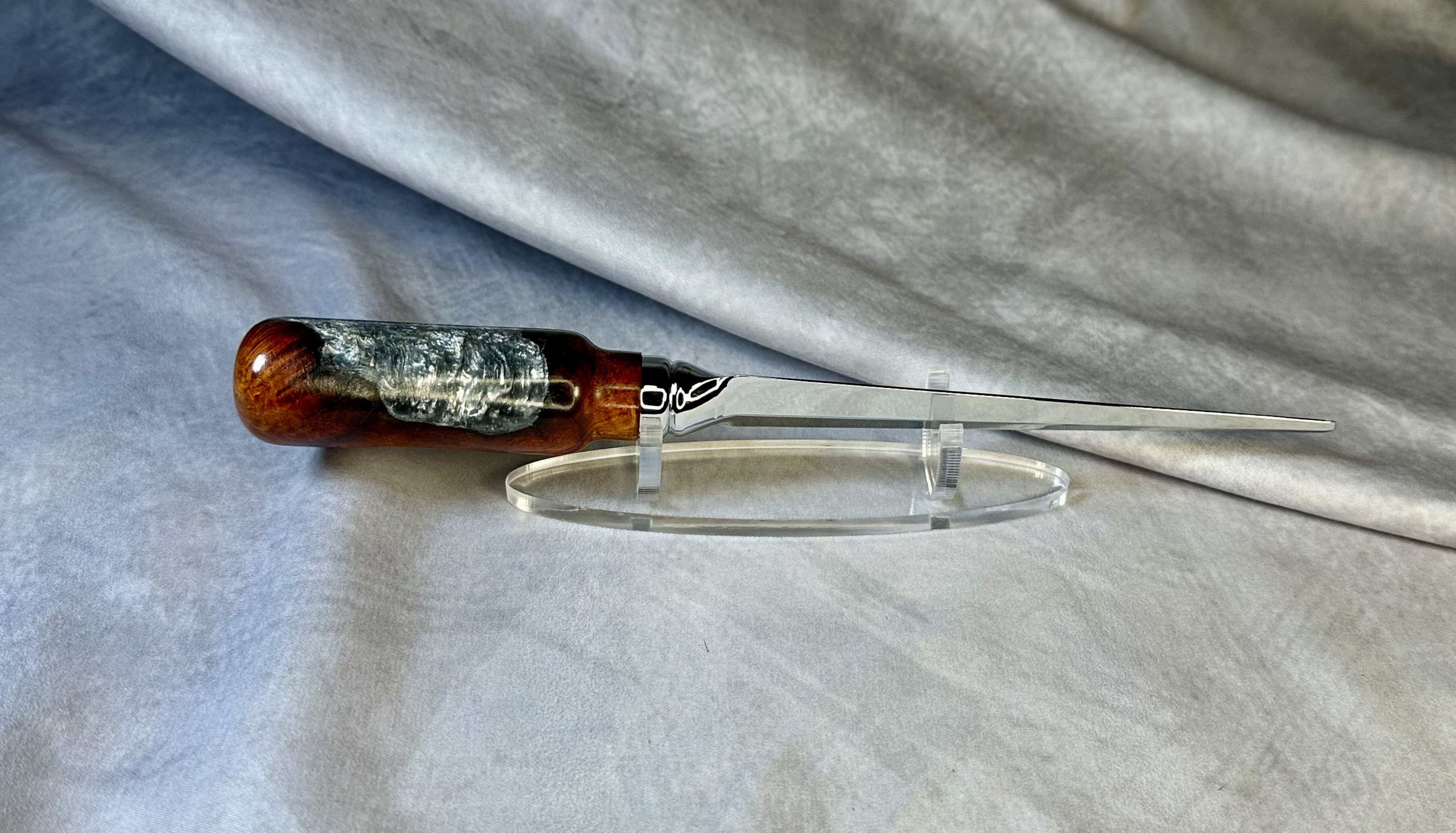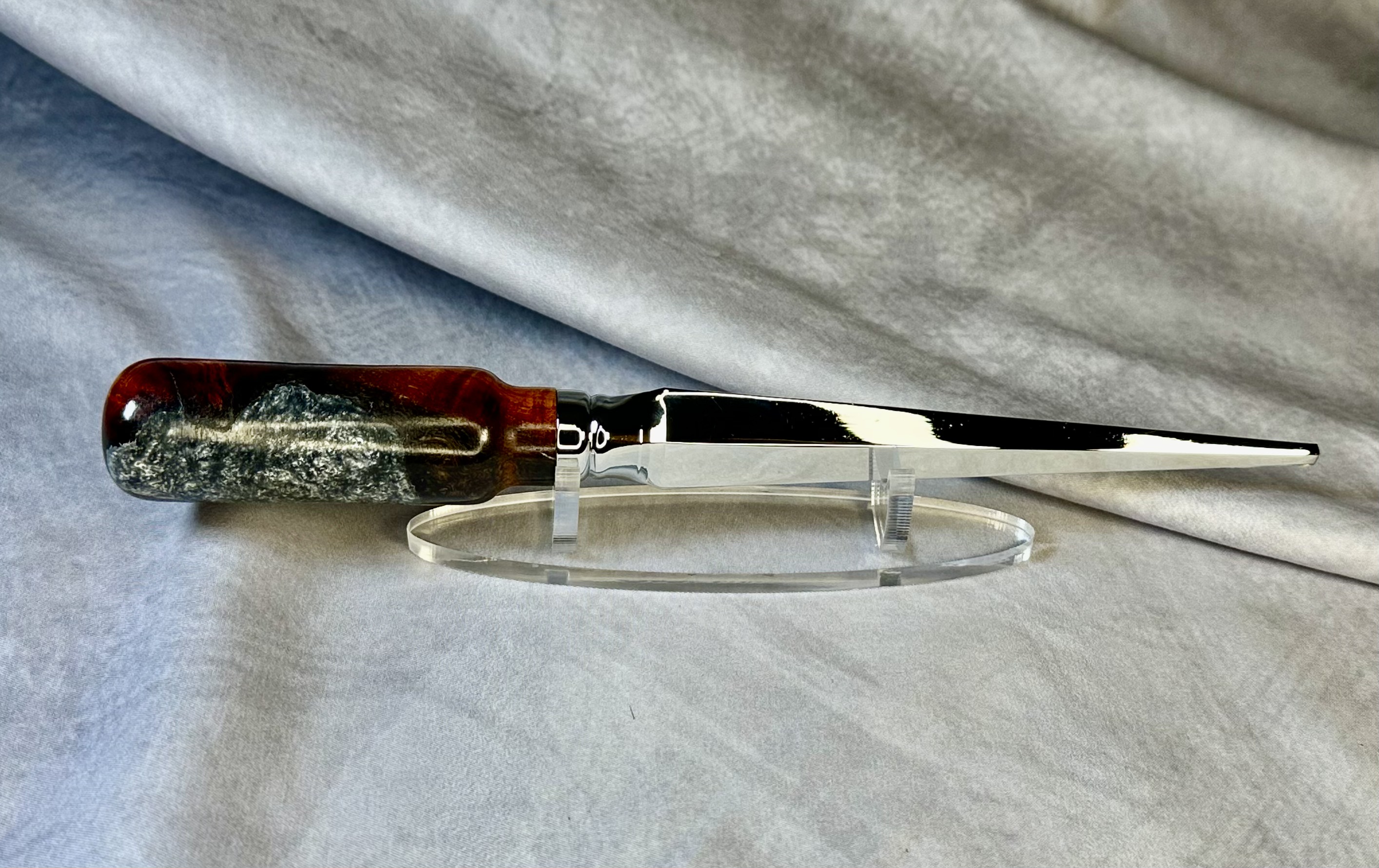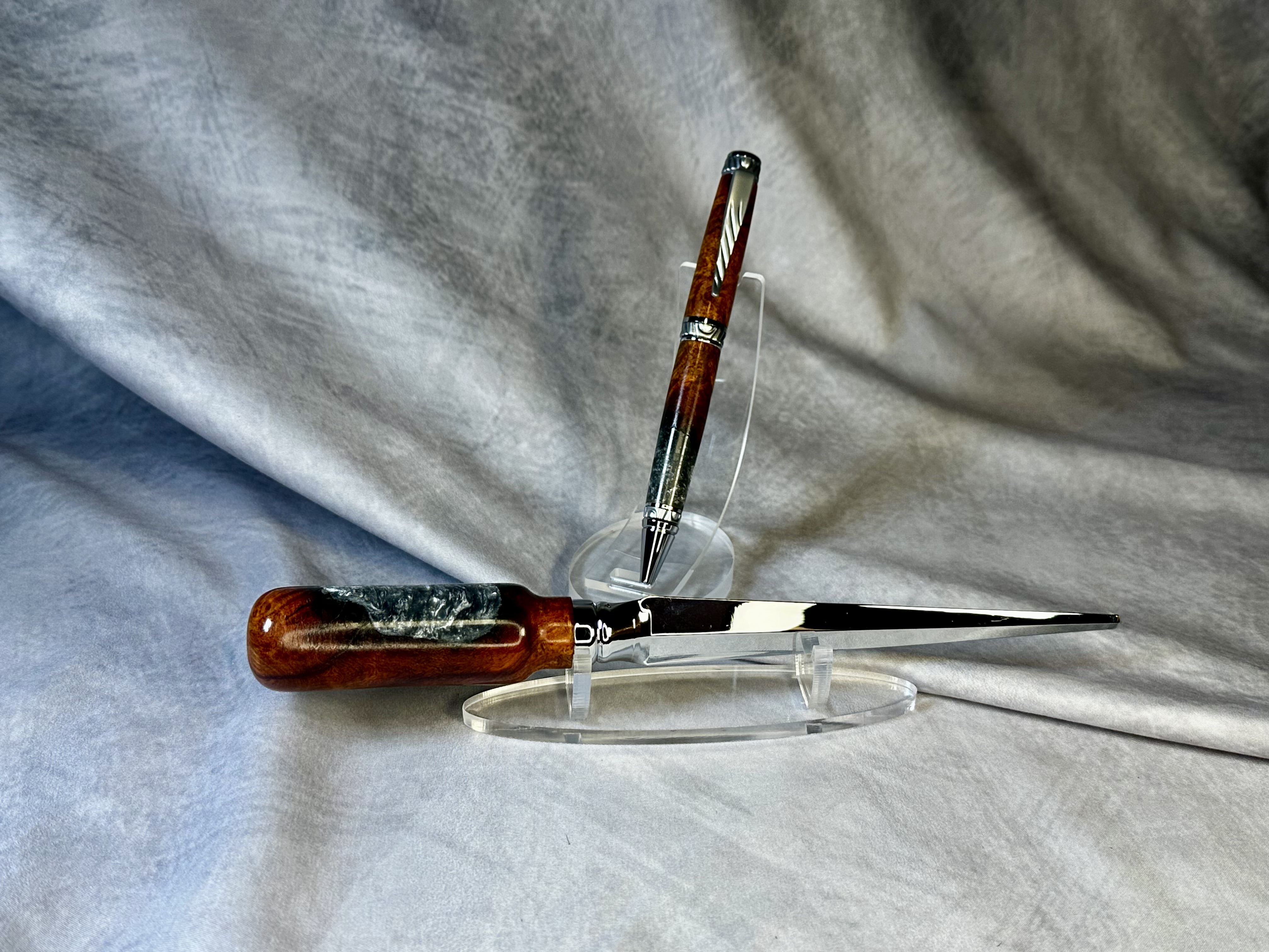 This set is made from a single block of Bloodwood burl that I cast in shimmering silver resin. The block is cut, drilled, tubed, and hand-turned on a wood lathe into a perfectly matched pen and letter opener. After shaping, each piece is sanded through progressively finer grits and polished to a high-gloss finish that highlights the burl figure and silver resin. Both pieces share identical resin flow and burl figuring because they were turned from the same cast, making them a true matching set.