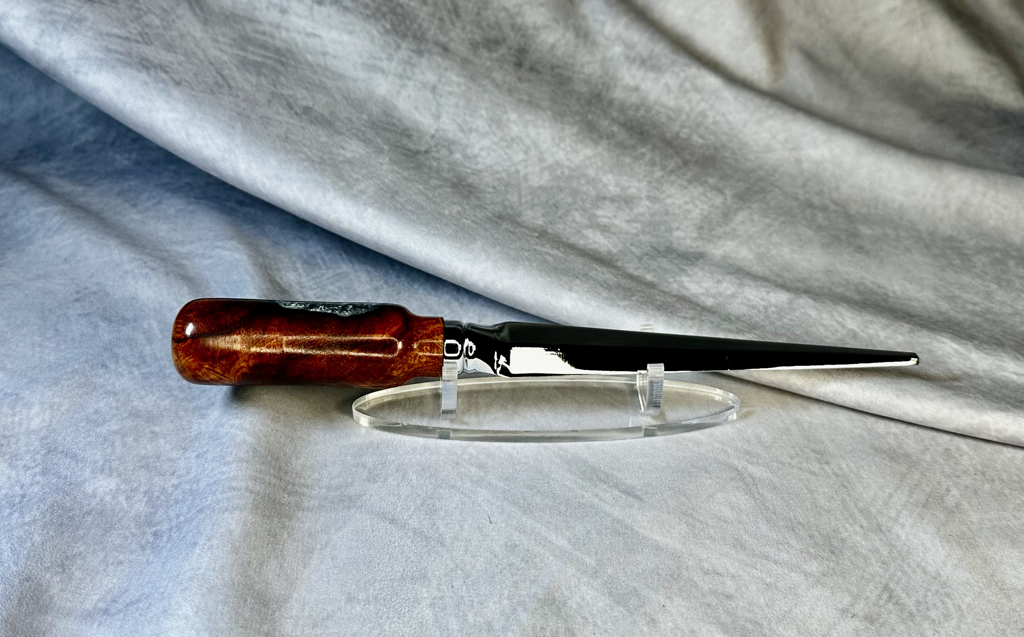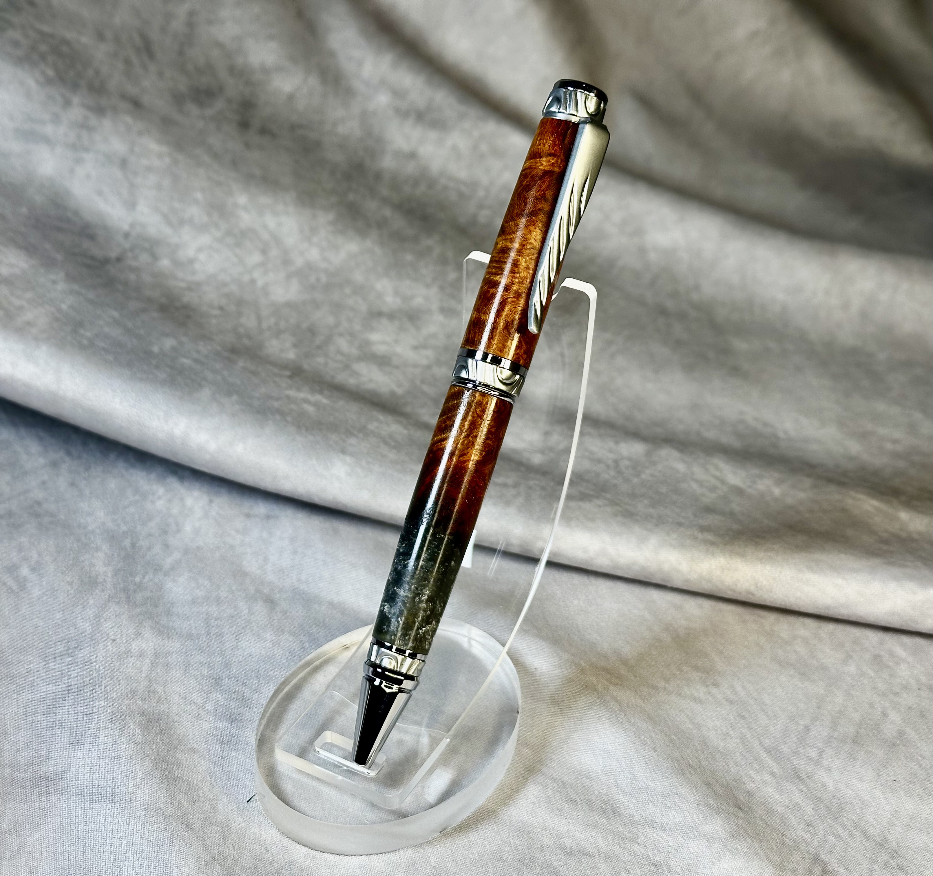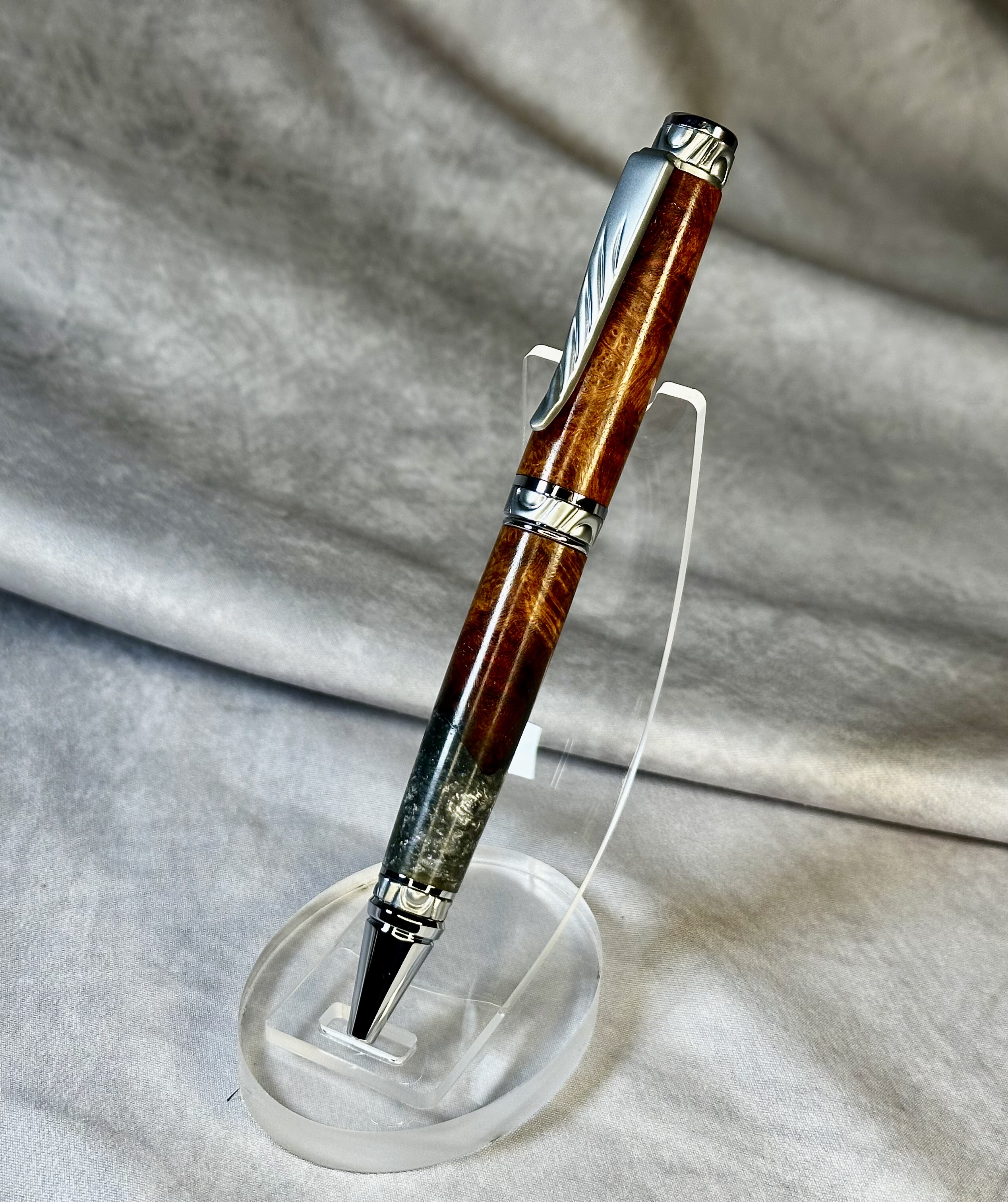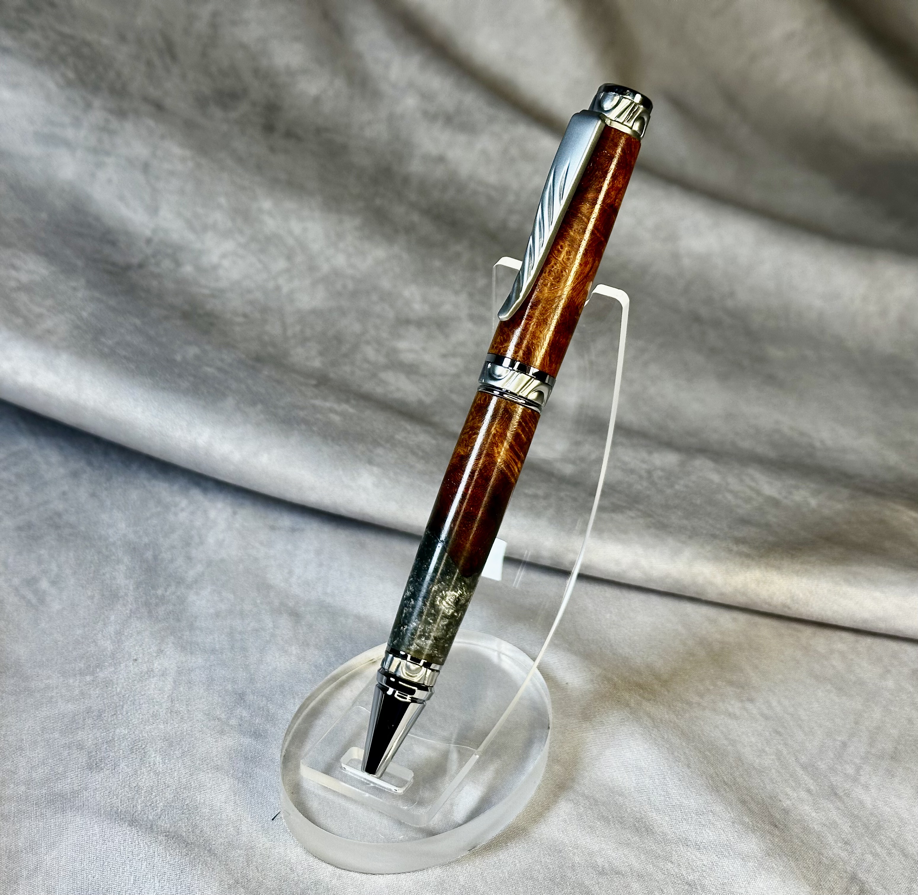 This set is made from a single block of Bloodwood burl that I cast in shimmering silver resin. The block is cut, drilled, tubed, and hand-turned on a wood lathe into a perfectly matched pen and letter opener. After shaping, each piece is sanded through progressively finer grits and polished to a high-gloss finish that highlights the burl figure and silver resin. Both pieces share identical resin flow and burl figuring because they were turned from the same cast, making them a true matching set.