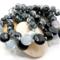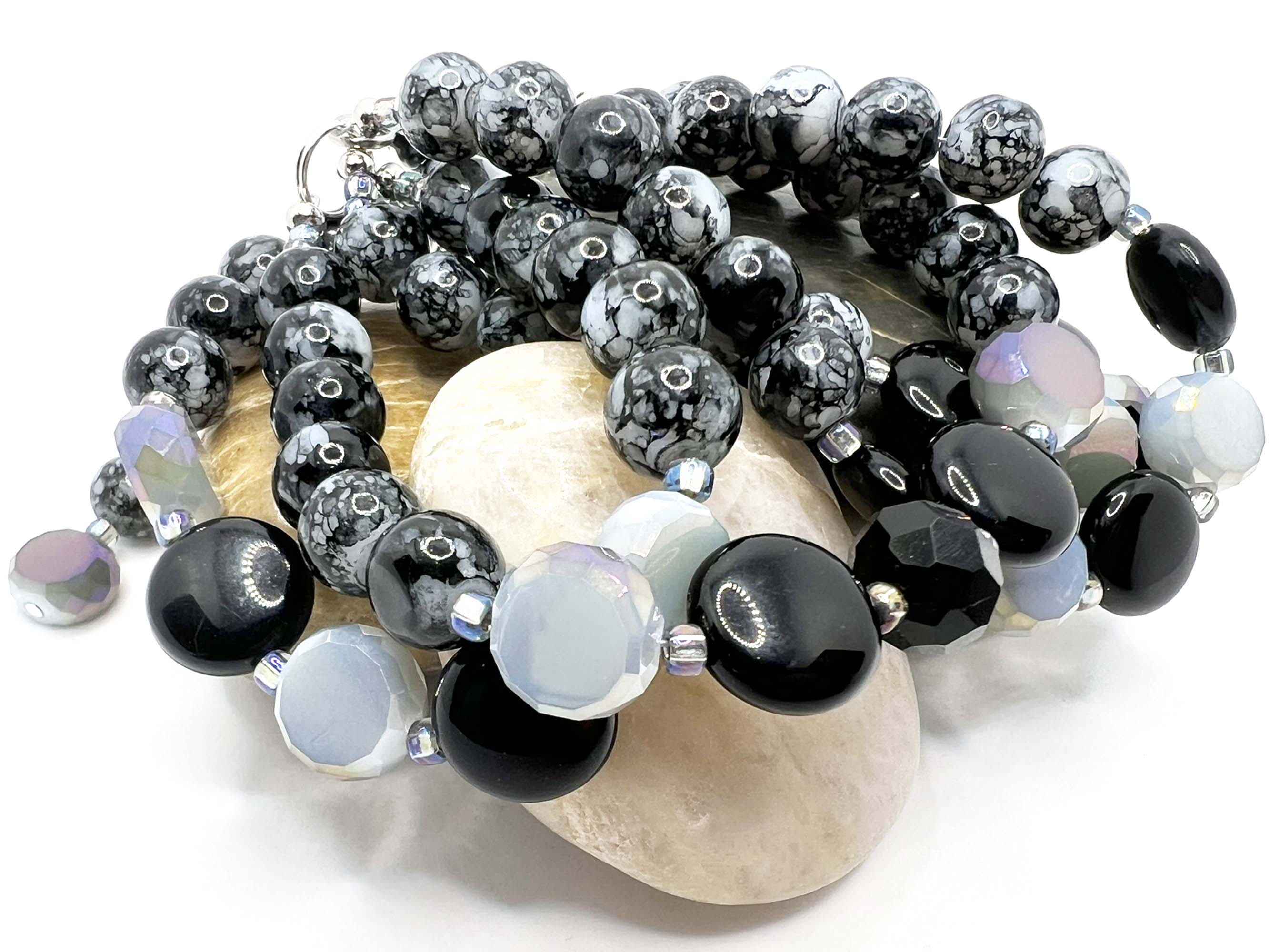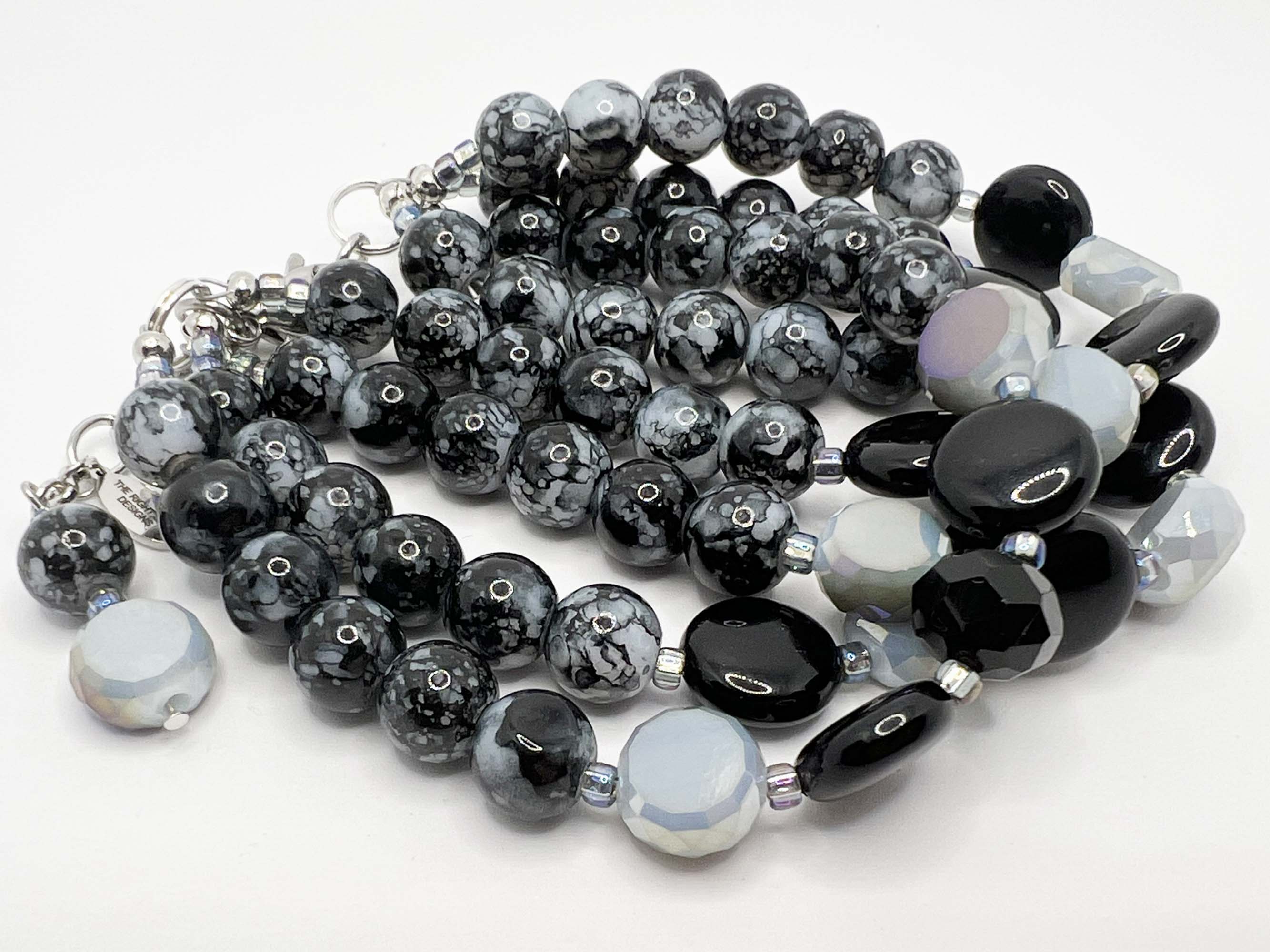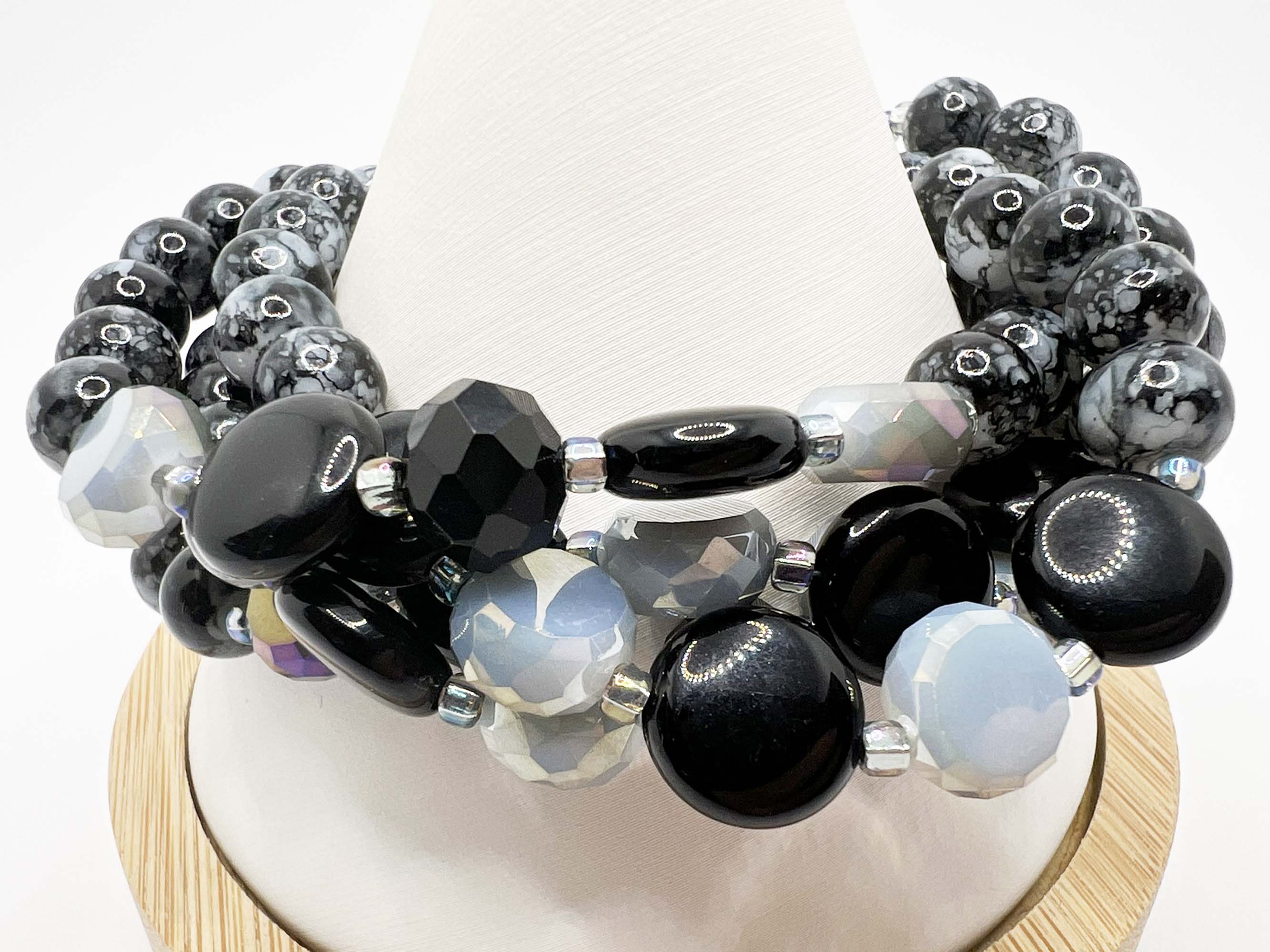 This bold four-strand bracelet combines style and versatility with a mix of 8mm black and blue glass beads. The center strands feature striking 10mm black acrylic disks and 9mm iridescent blue glass disks, accented with shimmering blue glass seed beads. Strung on high-quality filament for durability, it’s finished with a silver-toned lobster claw clasp and an adjustable length from 7-3/4" to 9-1/4" (M–XL). A statement piece that’s both elegant and versatile.