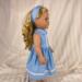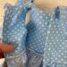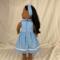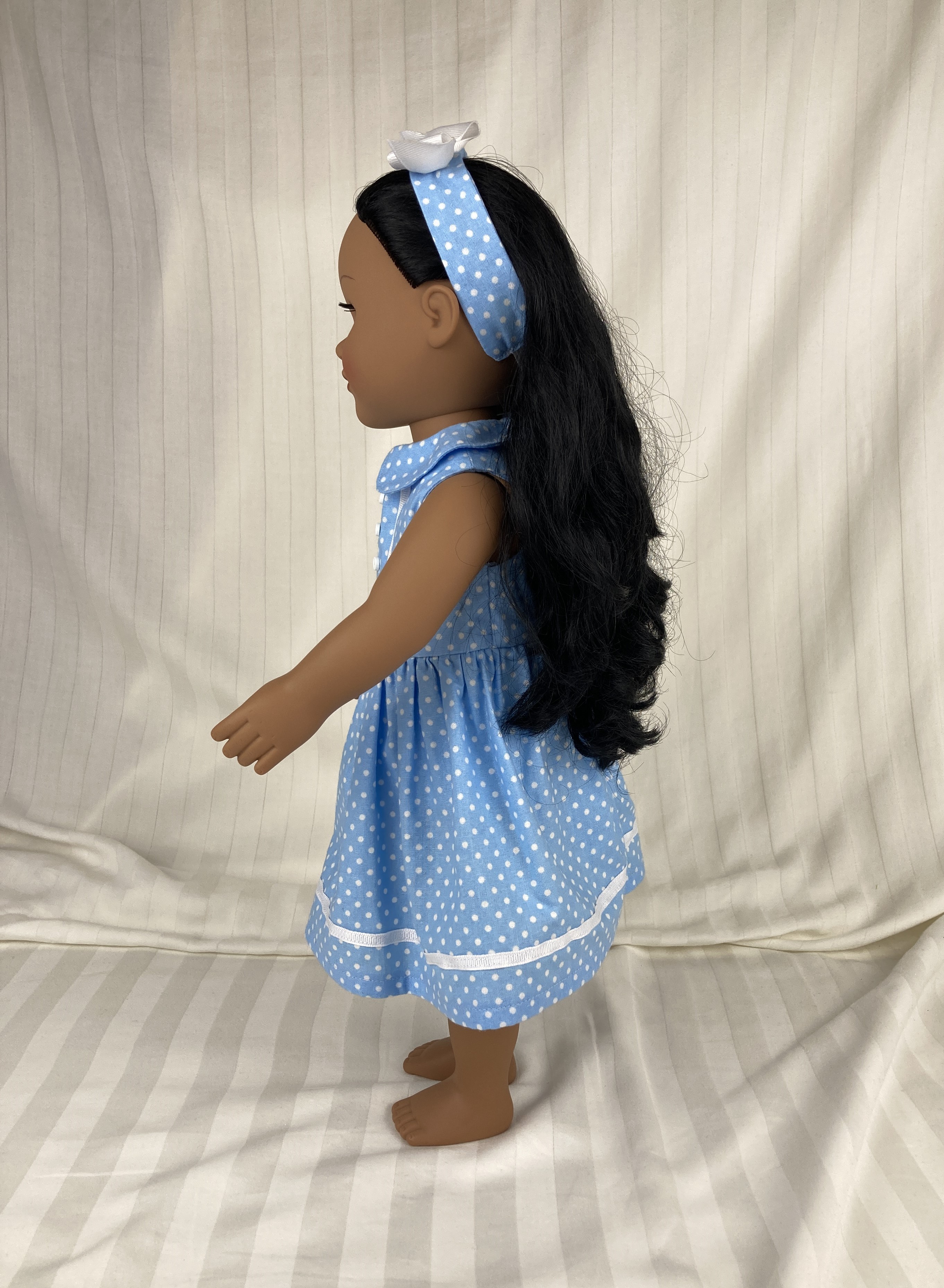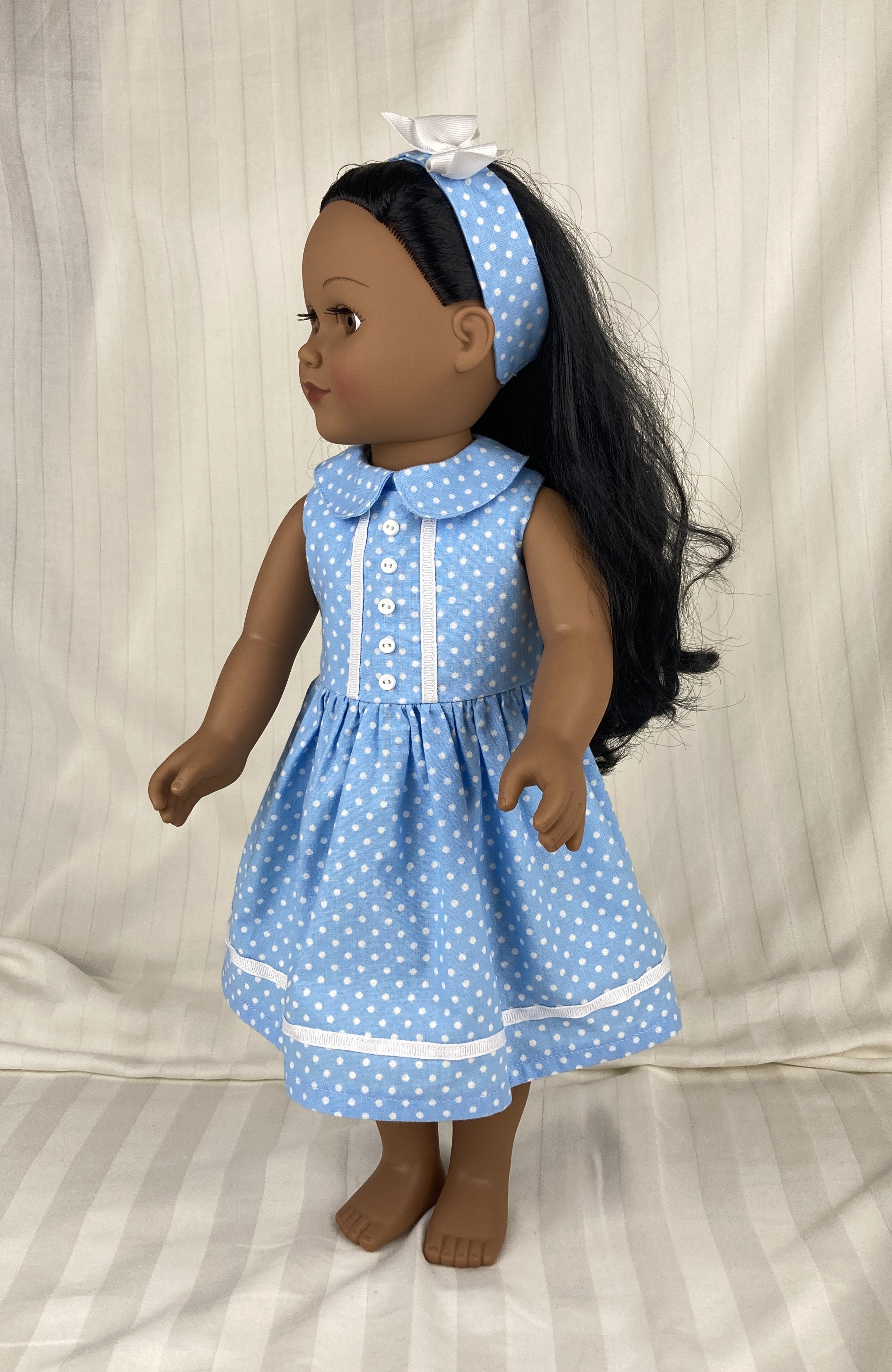 This adorable summer sundress is made from a baby blue and white small polka dot cotton fabric. The dress is sleeveless and has a peter pan collar. The bodice front features a ribbon and five tiny white buttons detailing that creates a faux placket look. The skirt is gathered and falls mid-calf. More of the grosgrain white ribbon detailing is found along the bottom of the skirt. The matching headband is made from the same fabric as the dress and has medium white grosgrain ribbon bow, perched slightly off center. The back closure for the dress is hook and loop. Bodice is lined.