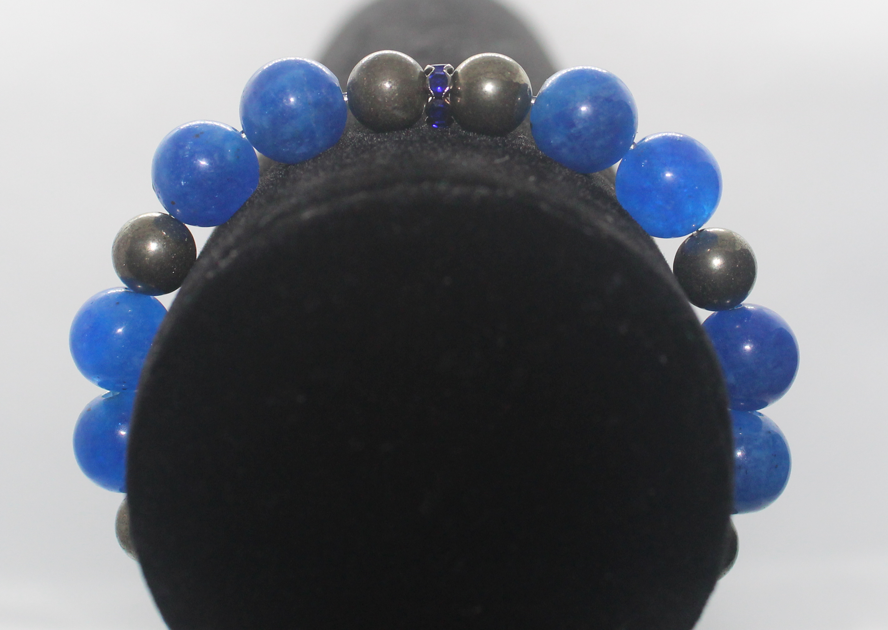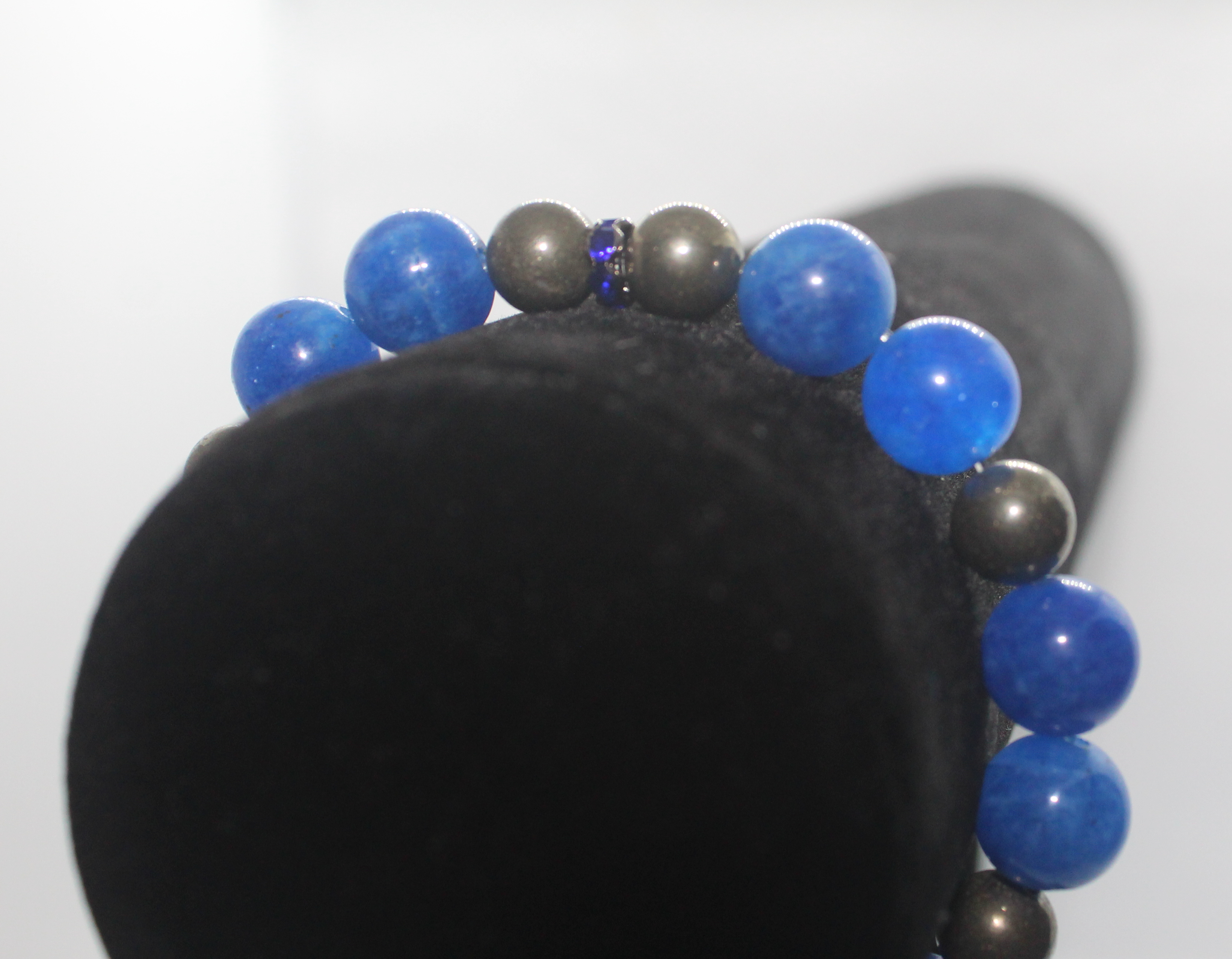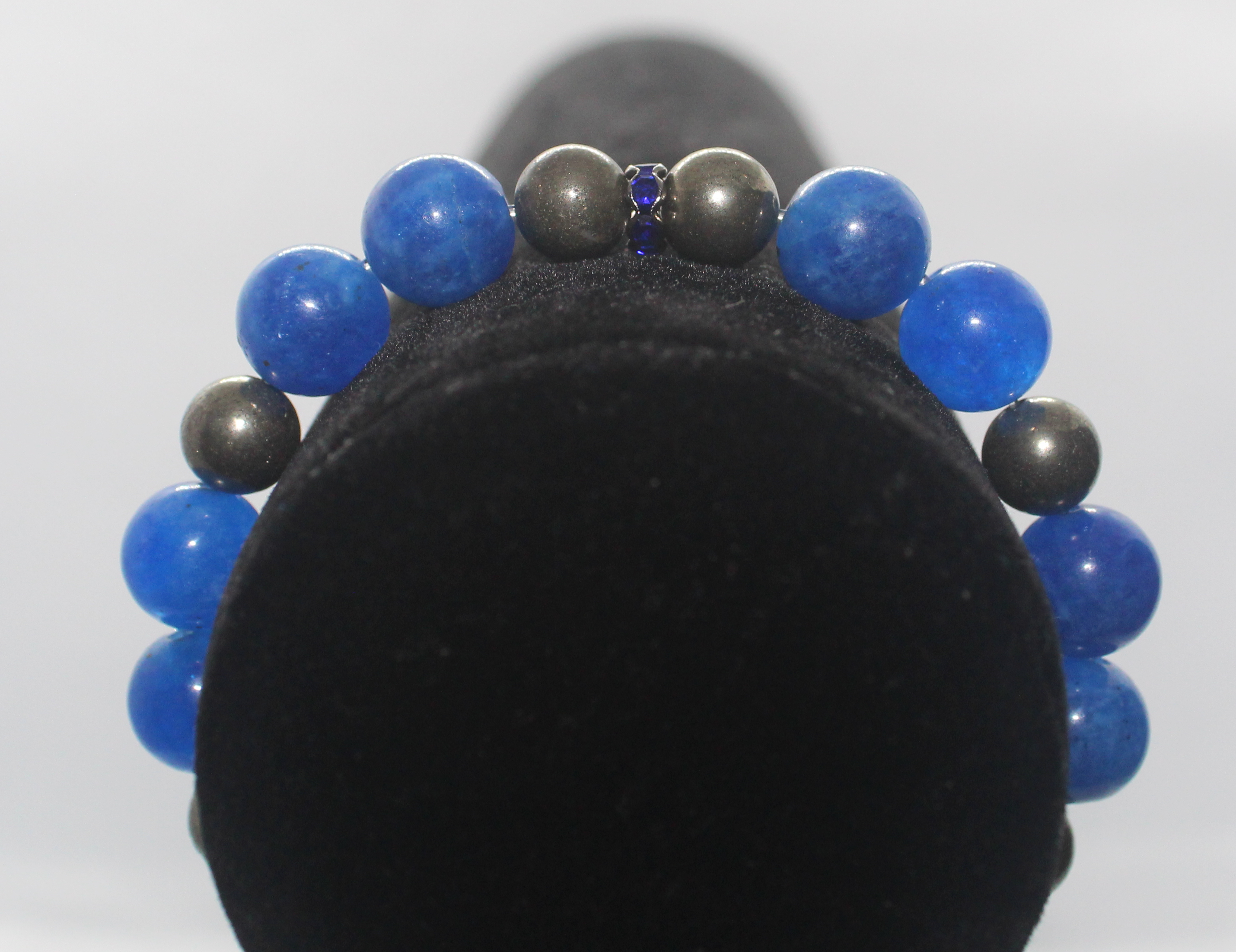 This stunning bracelet features a captivating design composed of vibrant blue dolomite jasper and Pyrite. The rich blue color is reminiscent of a dark ocean sea, making it a perfect accessory for both casual and formal occasions.