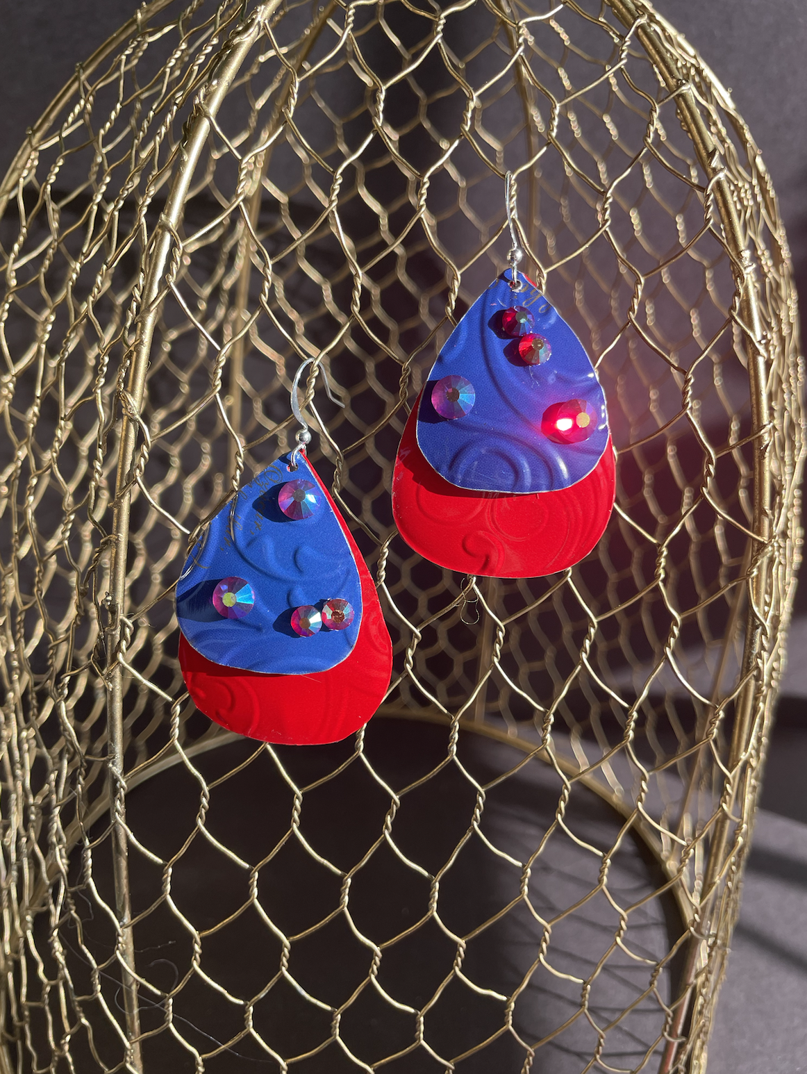Playing with shapes, colors, rhinestones and embossing. These earrings have silver-plated earring findings and a rubber stopper on the back so they won't fall out of your ears.
