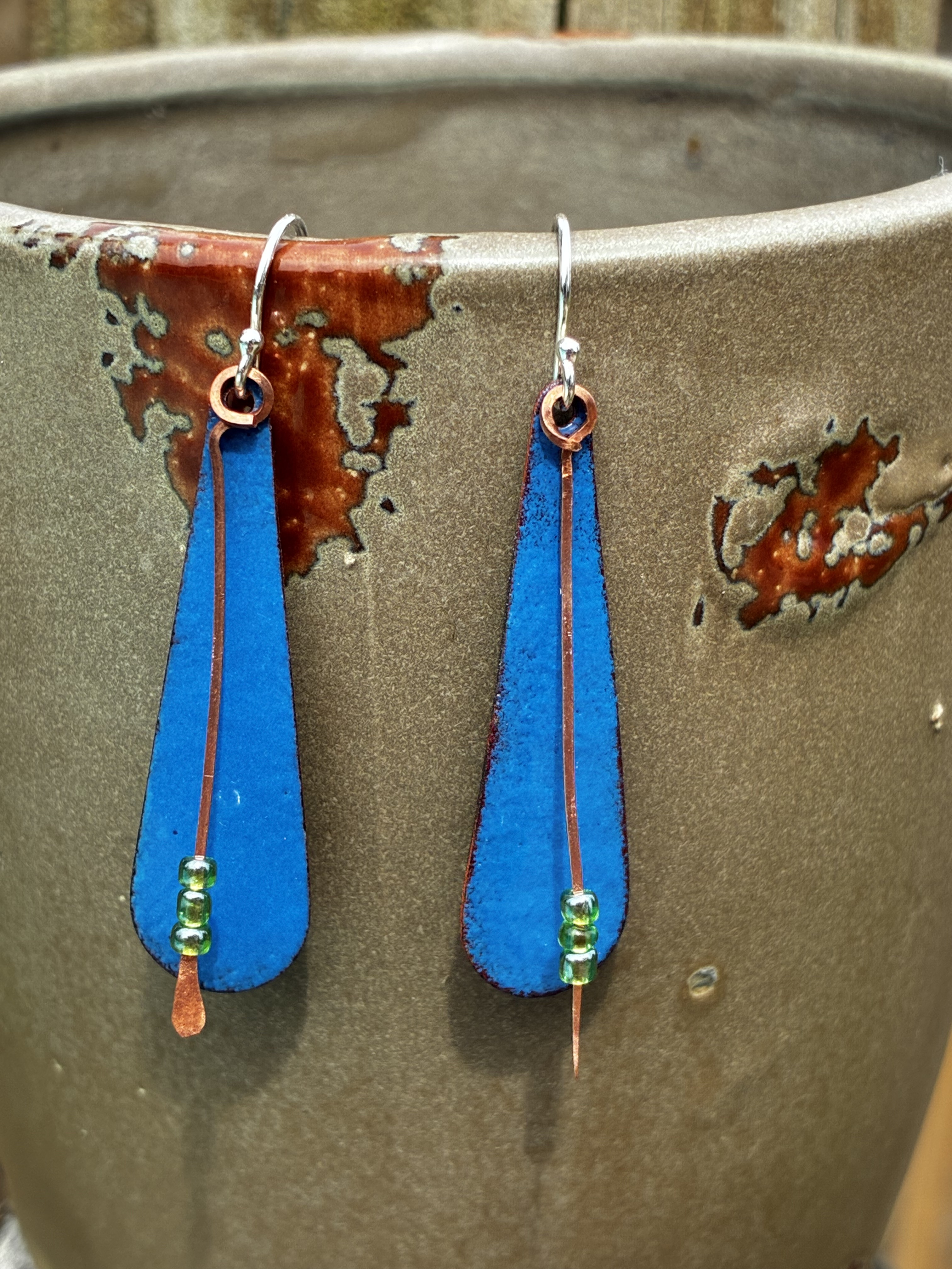 These are blue enameled earrings with copper wire holding green seed beads. The earring hooks are sterling silver Shepard's hooks.