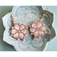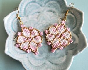 Miyuki beaded earrings are made using Miyuki beads as the primary material. Miyuki beads are high-quality, precision-cut glass beads made in Japan and are known for their consistent size and shape. The Miyuki beads are strung onto a thread and woven together using the brick stitch techniques. The beads are arranged in patterns and colors to create intricate designs, resulting in a unique and beautiful piece of jewelry.