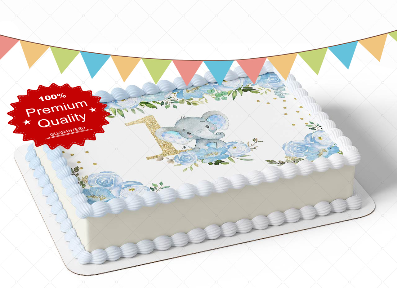 Blue Flowers Elephant 1st Year Edible Image Themed Edible Birthday Party Cake Topper Sheet Edible Sticker Decal