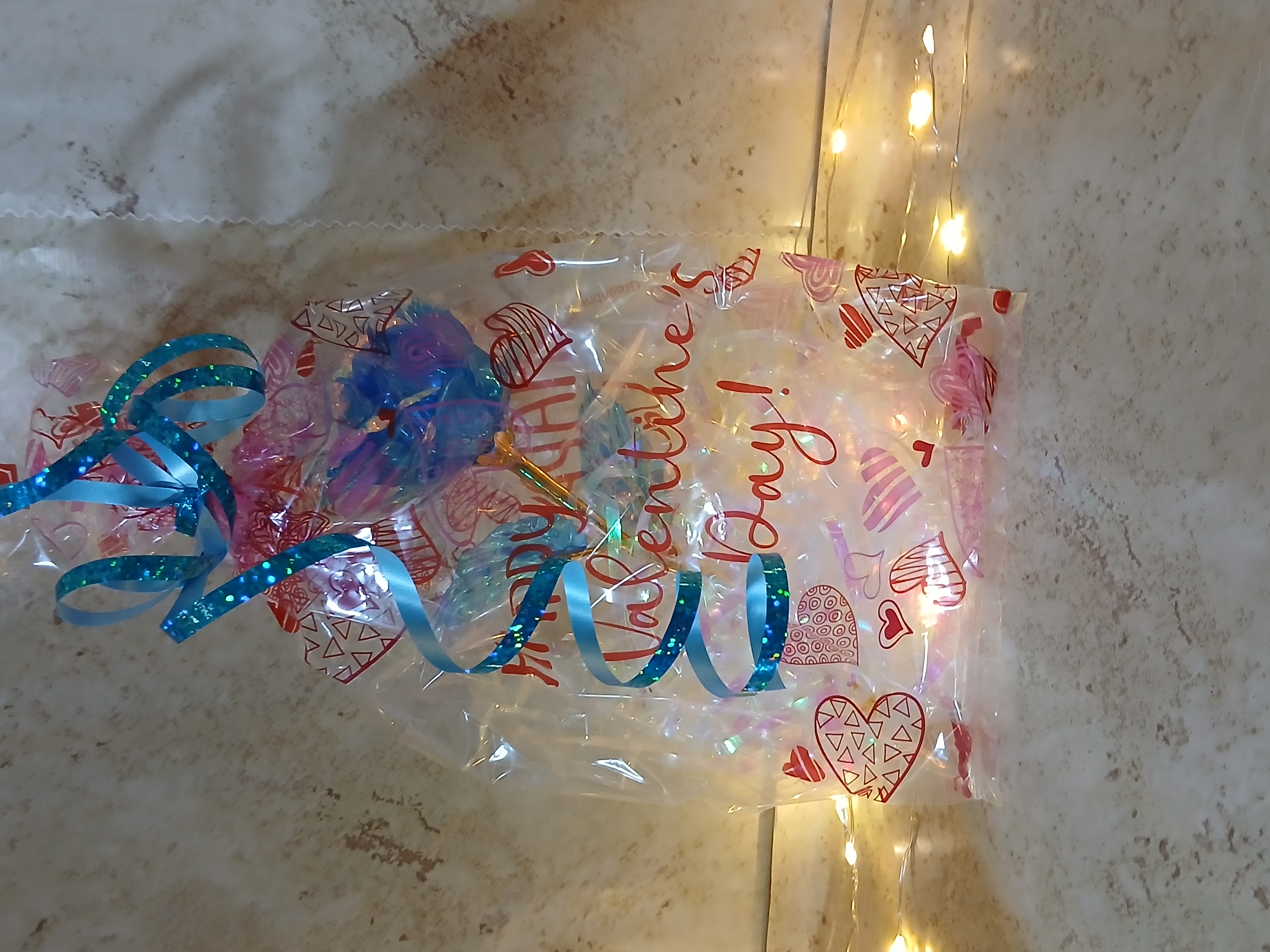 This rose is known by forever rose or galaxy roses is blue in color and is in a plastic treat bag that says Happy Valentines day and has iridescent shreds on the bottom and blue curling ribbon to top it off
