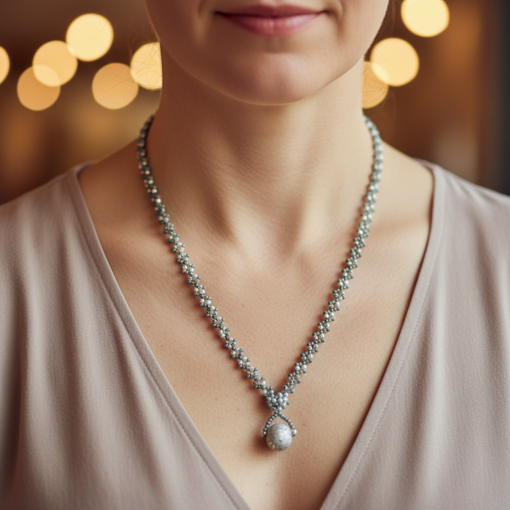 Soft blue gray and pale metallic beads are woven into a gentle spiral that draws the eye toward a textured glass pendant with a delicate, almost lunar surface.