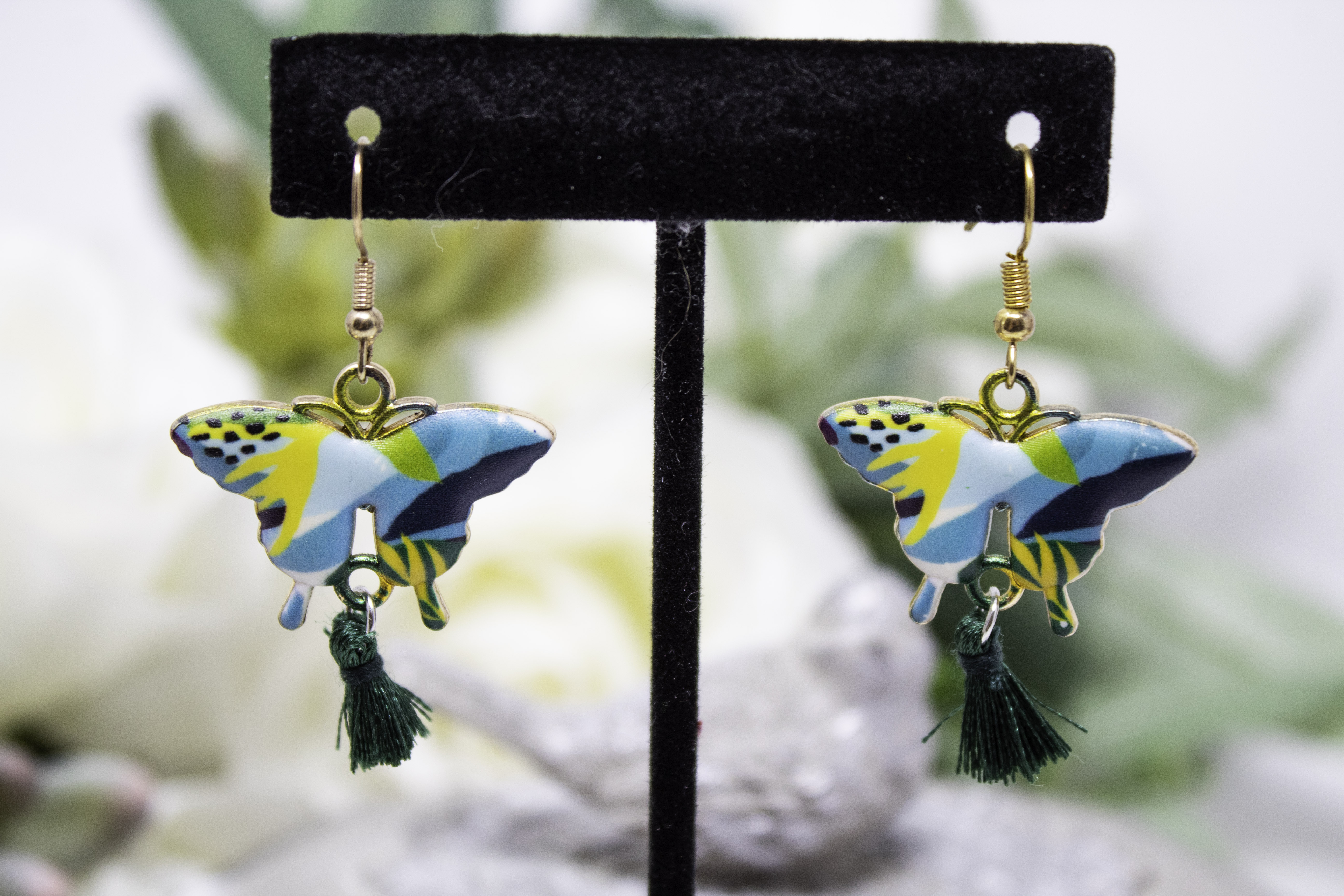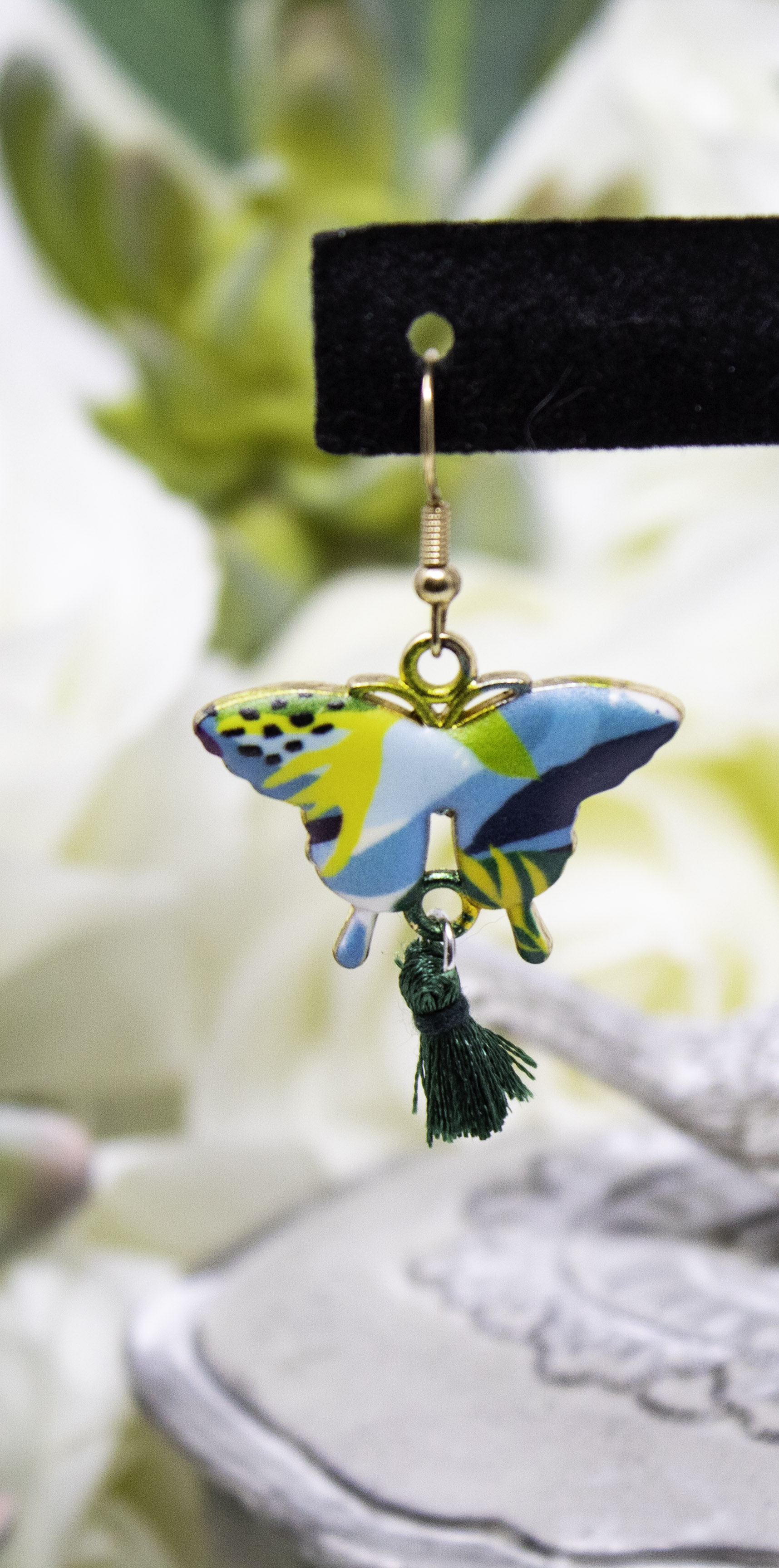 Add a playful pop of color to your day with these butterfly tassel earrings! Each earring features a vivid, multicolored enamel butterfly in shades of blue, green, yellow, and teal, accented with a dainty dark green tassel for a touch of boho charm. The gold-tone hooks add a hint of warmth and elegance, making them perfect for both casual days and bright summer outings.