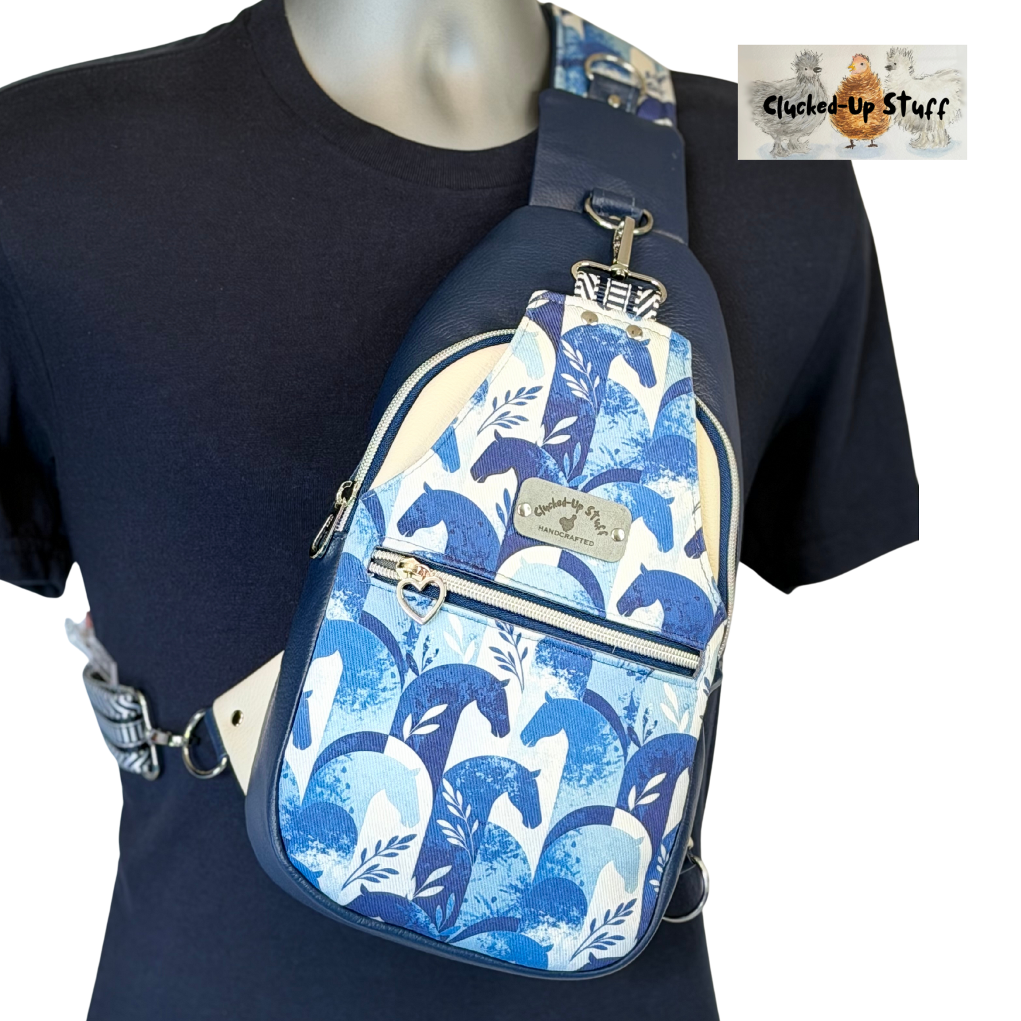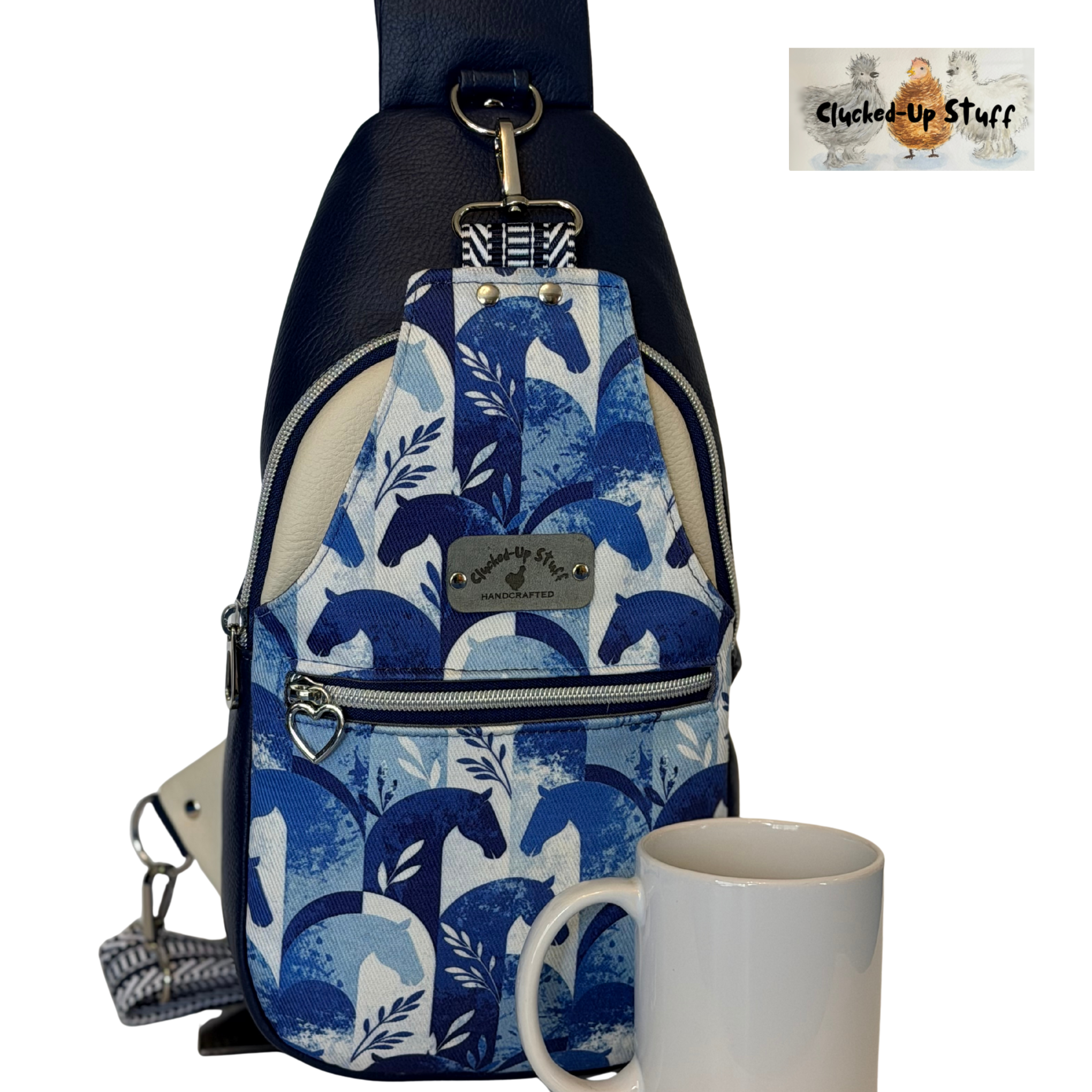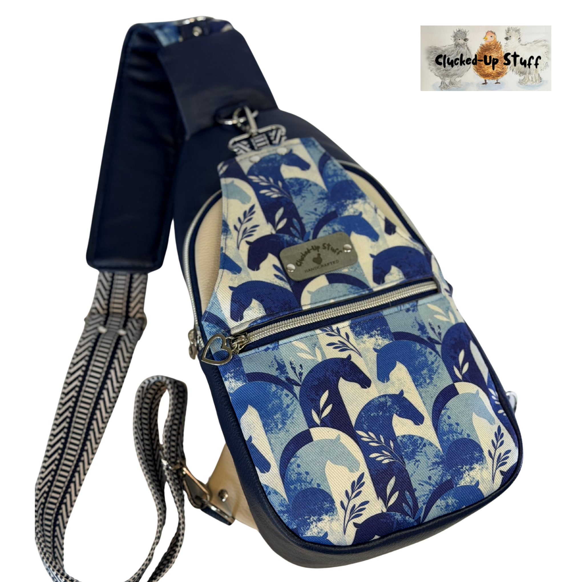 This handcrafted sling bag is a stylish and functional companion for everyday adventures. The front panel features a striking blue horse denim print paired with premium faux leather, giving the bag a bold yet elegant look. The outer materials include waterproof linen and faux leather, while the interior is fully lined with waterproof linen—making this bag as practical as it is beautiful.
