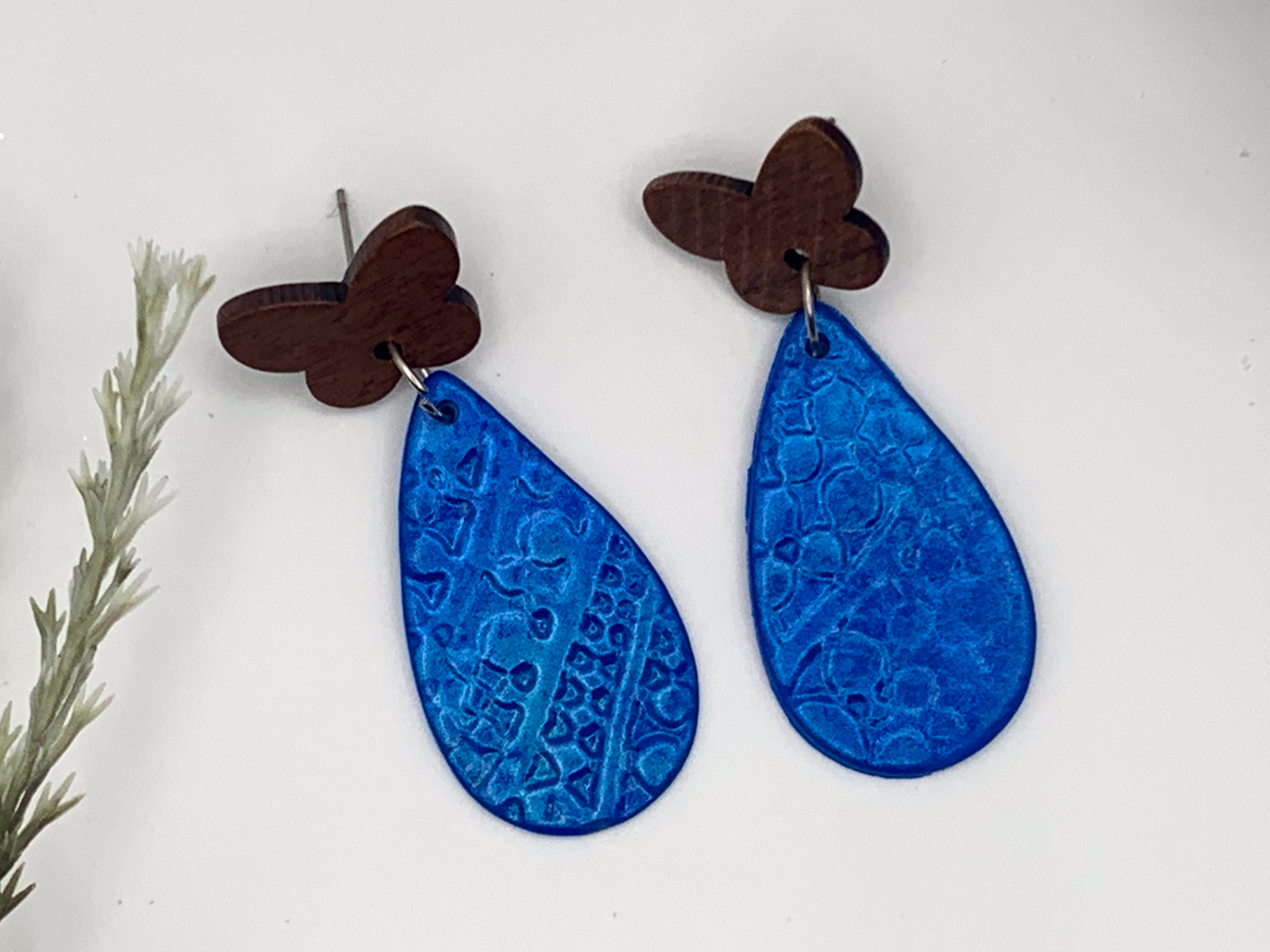 Delicate and dreamy! These teardrop-shaped earrings feature intricate embossed patterns in shimmering blue, paired with wooden butterfly studs for a nature-inspired finish.
