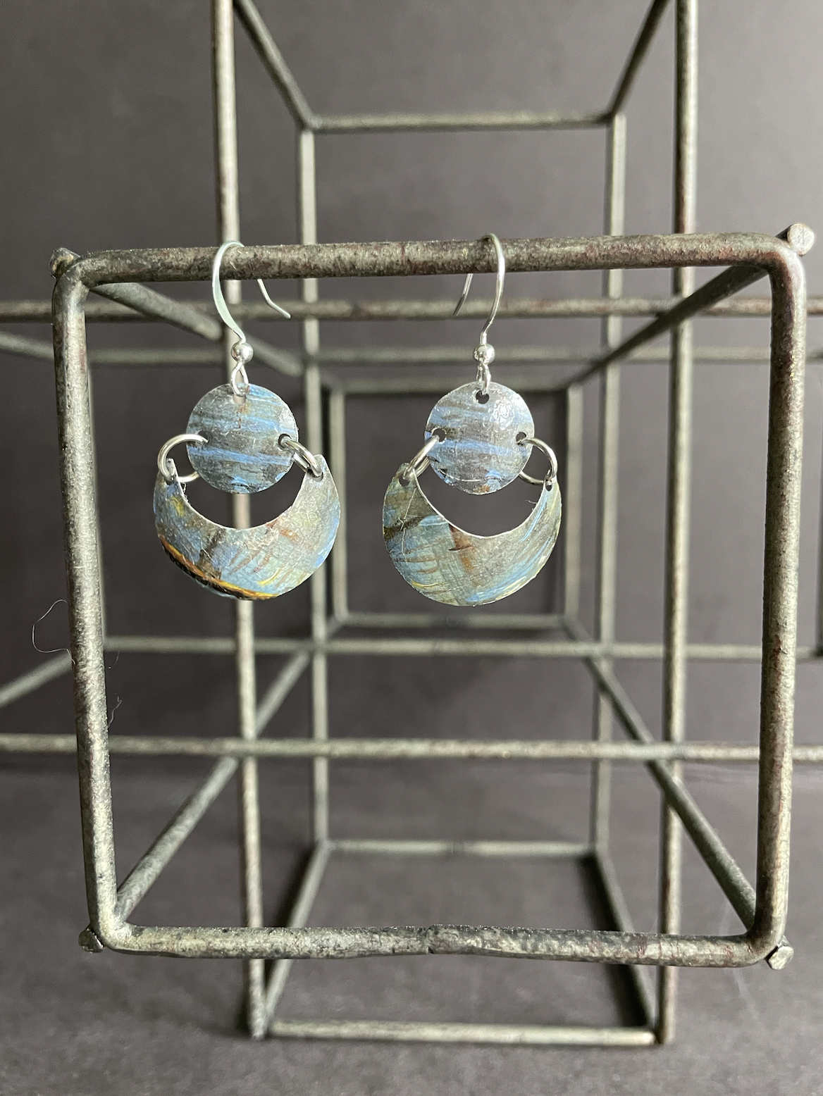 Tins are very light making them ideal for earrings as they don't weigh down your ears as the day goes on. Did you know the proper term for working with tin is "tinkering"? That made me really happy. I literally tinker in my art studio! I use old cookie tins, tea tins, and the like, break them down, and hand cut them into shapes and hand-hammer them into the 3-D shape I want them to be, finish and polish them, before putting them together like any other jewelry.