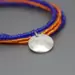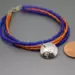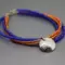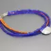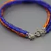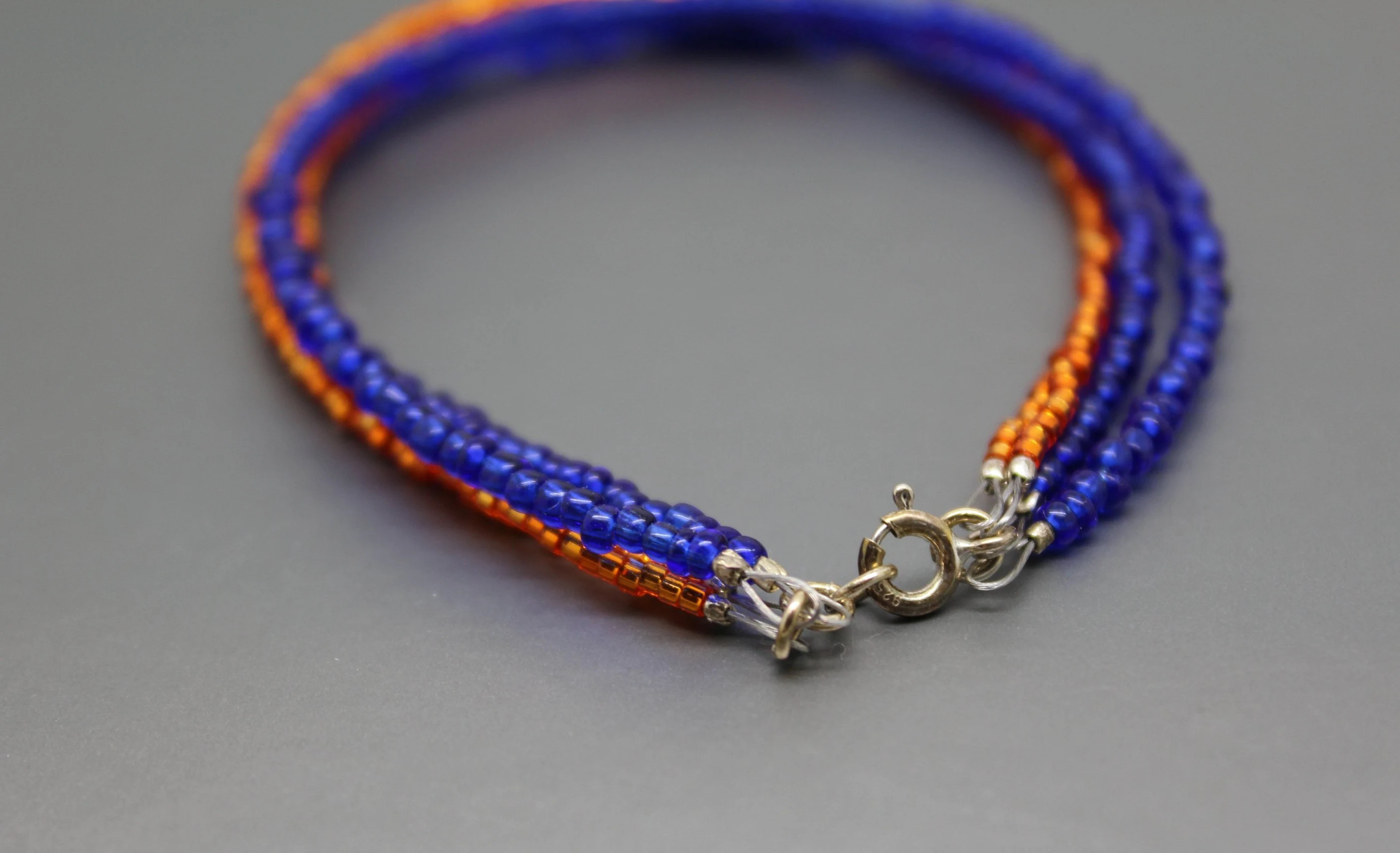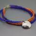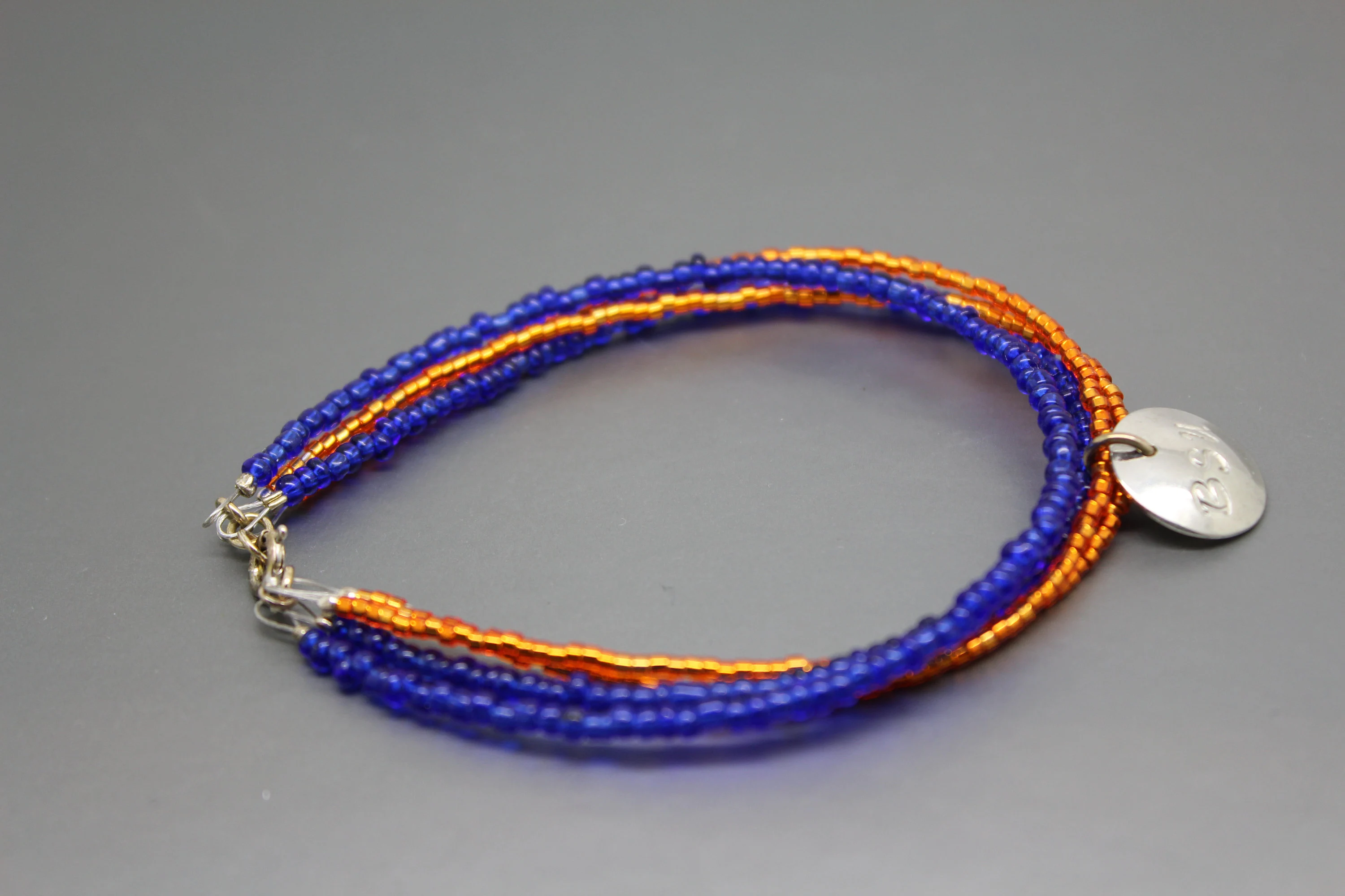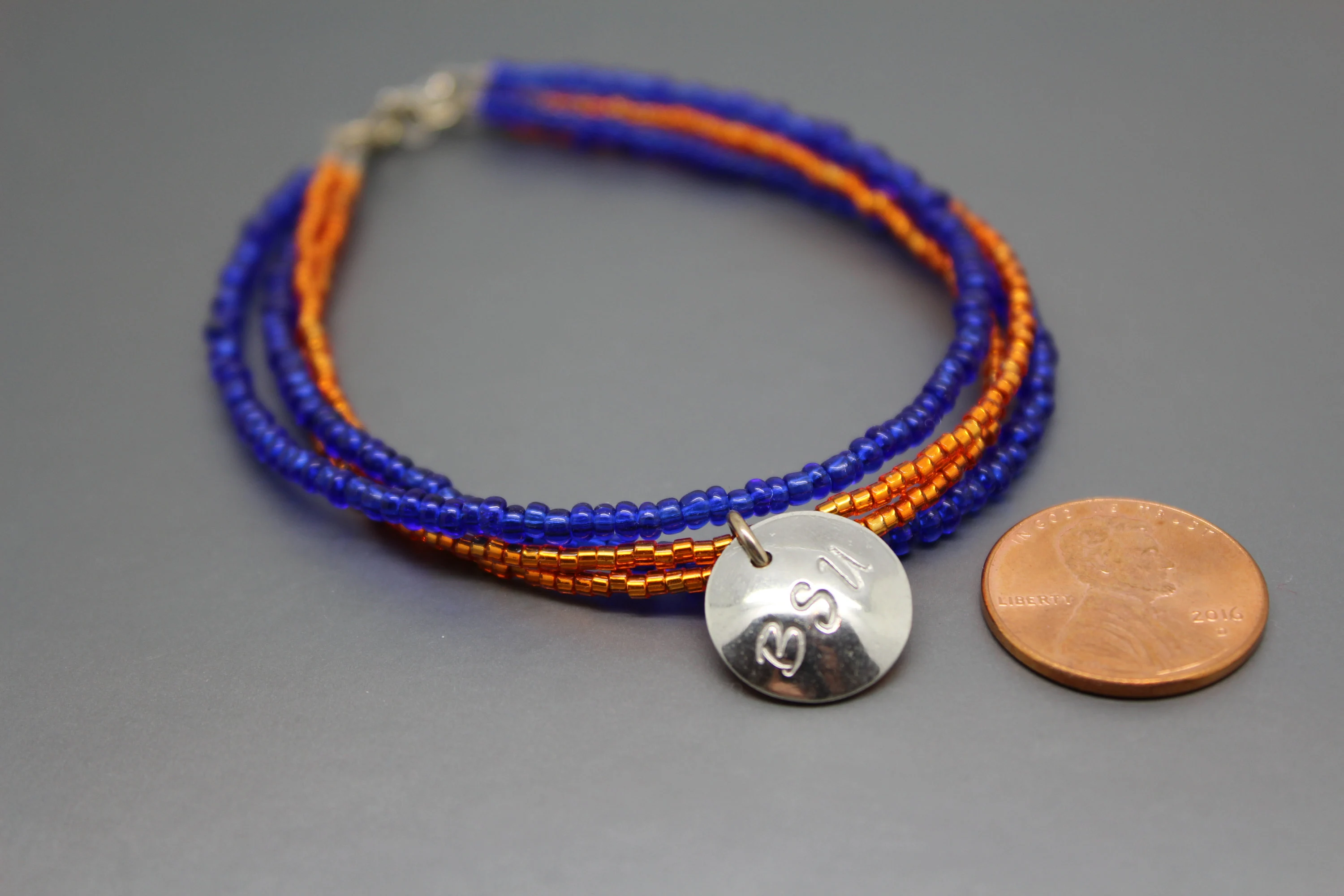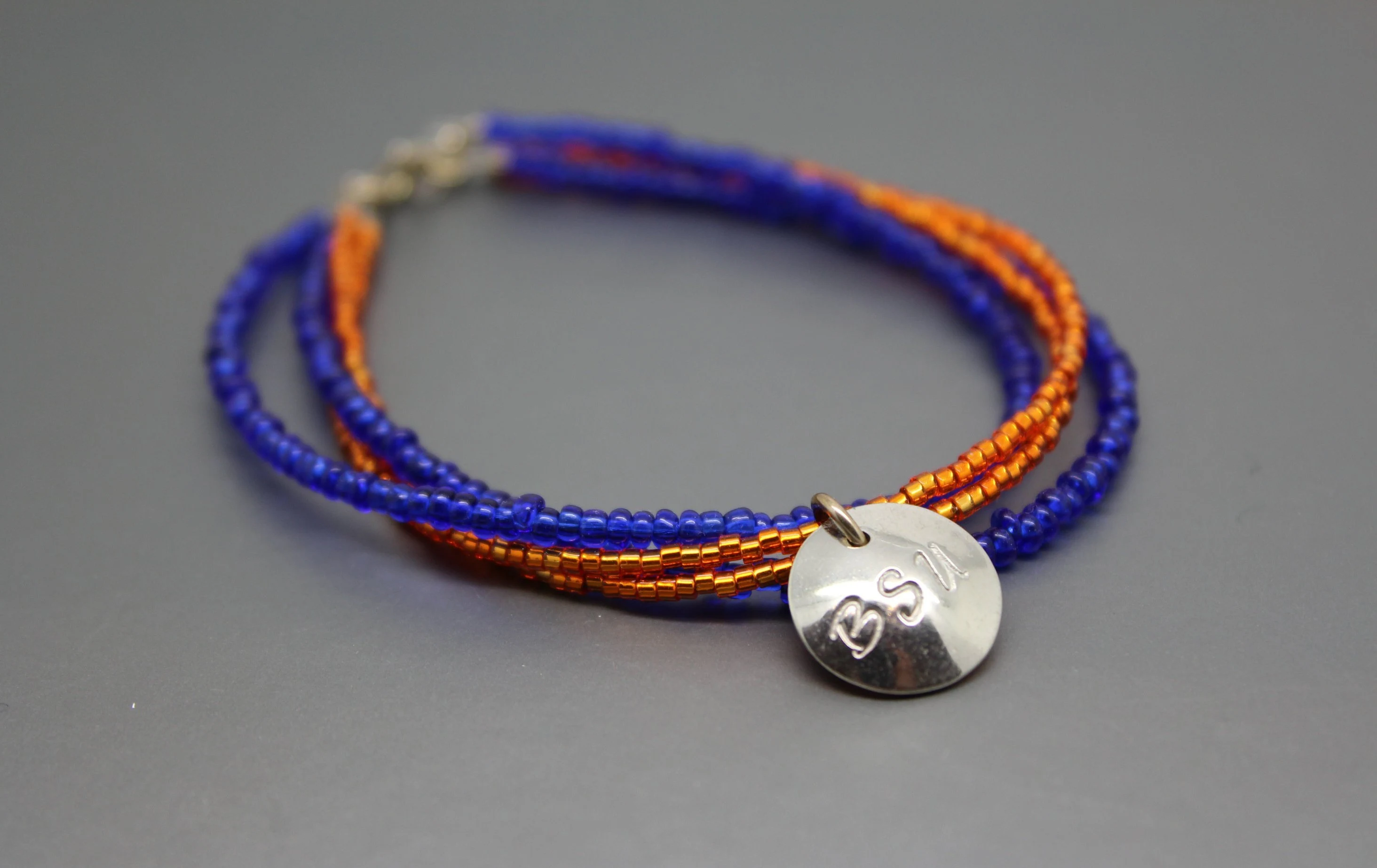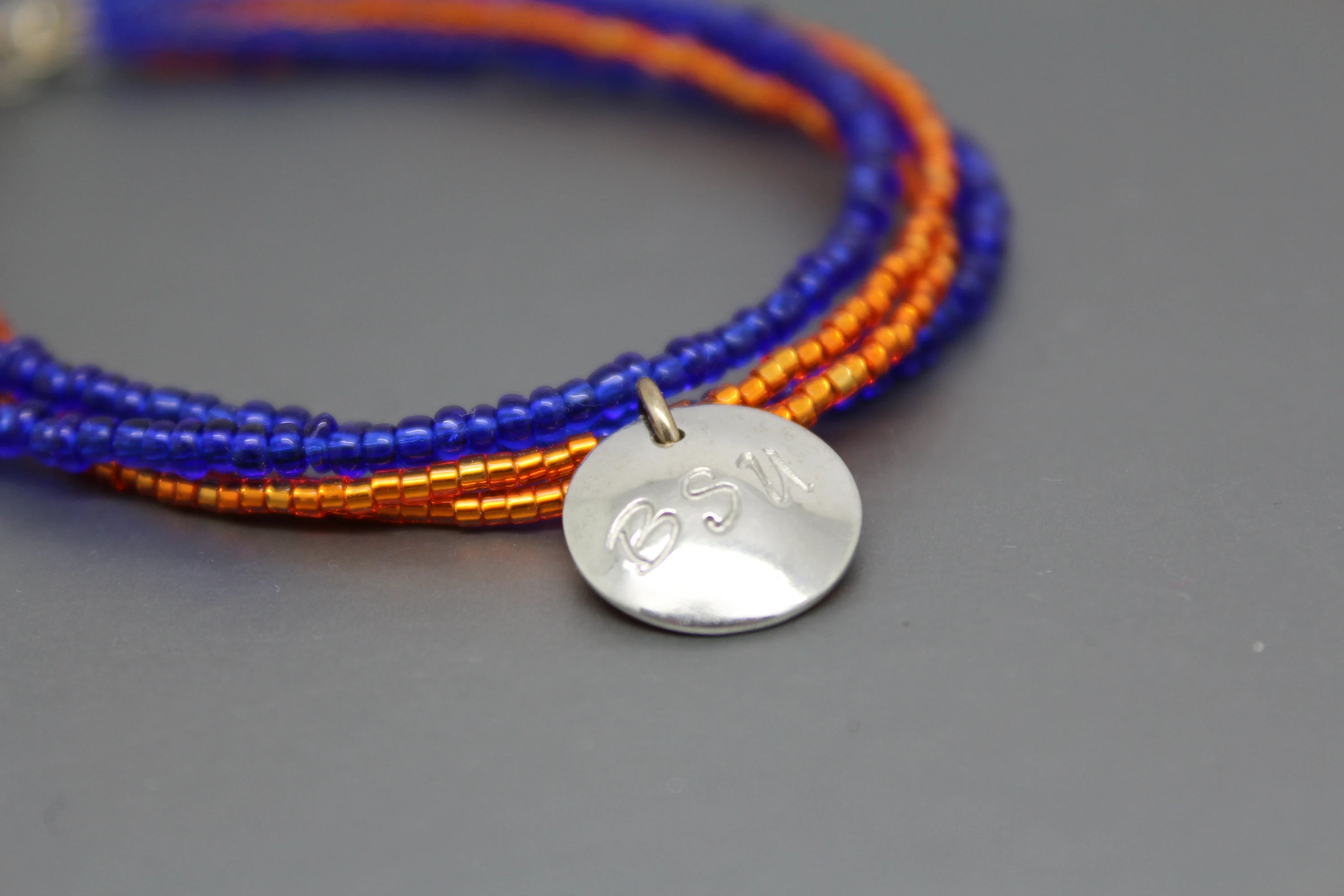 This blue and orange bracelet can be a fun way to show your game day spirit. This bracelet has four strands of seed beads, two strands of blue and two of orange. A hand cut pewter charm stamped with BSU hangs from the orange strands. The bracelet ends are finished with sterling silver jump rings and a sterling silver spring ring clasp. This blue and orange bracelet is shiny and measures approximately 8" in length including the clasp.
