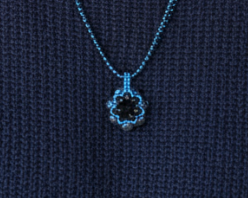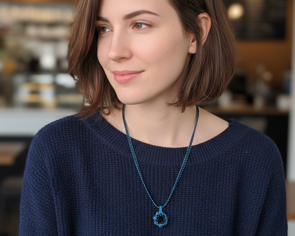 Handwoven from glass seed beads in contrasting blue and blackr, this pendant captures the light in subtle, shifting tones. The balanced geometry of the design gives it a modern edge, while its handcrafted detail keeps it grounded in artisan charm.
