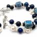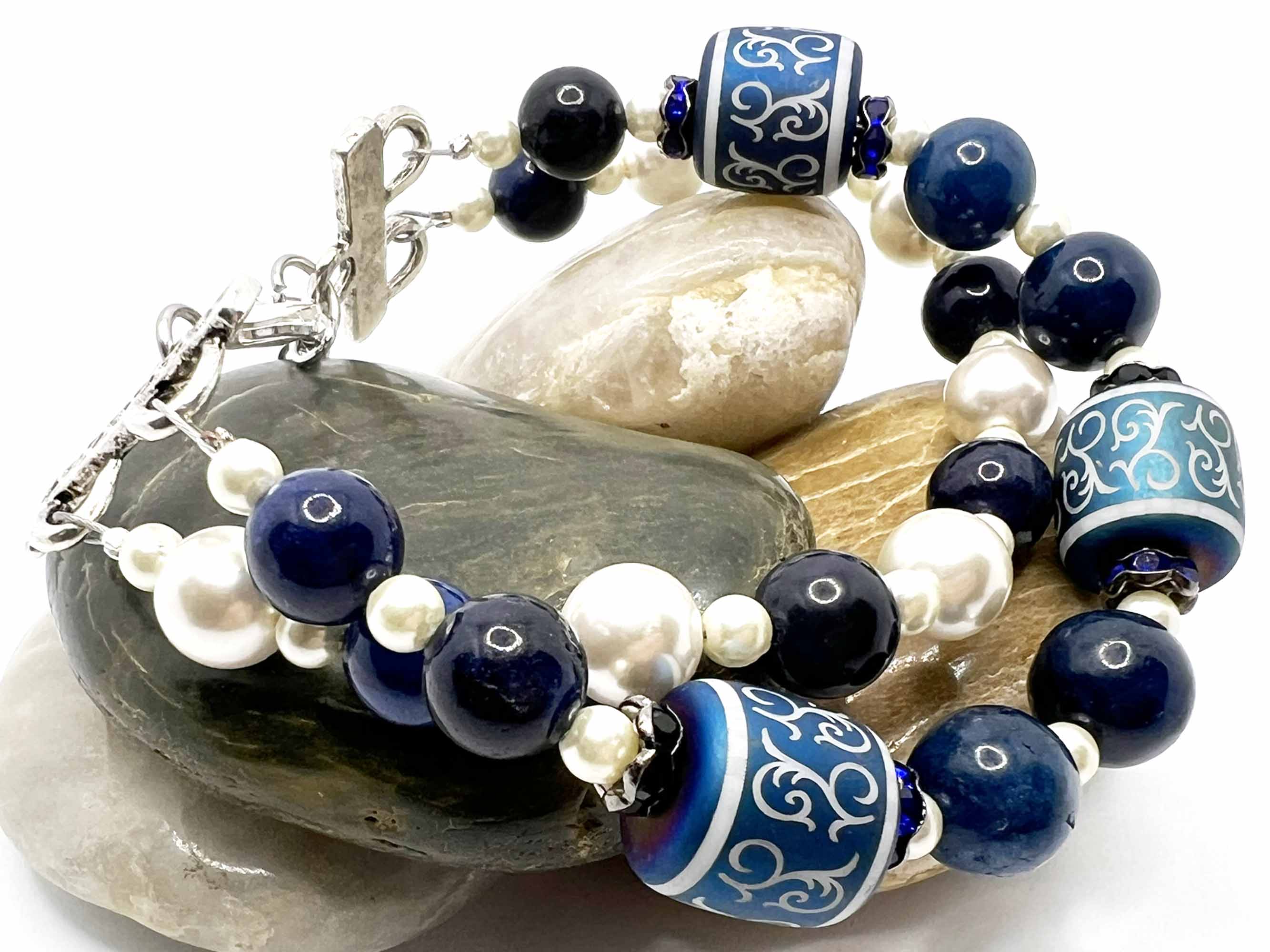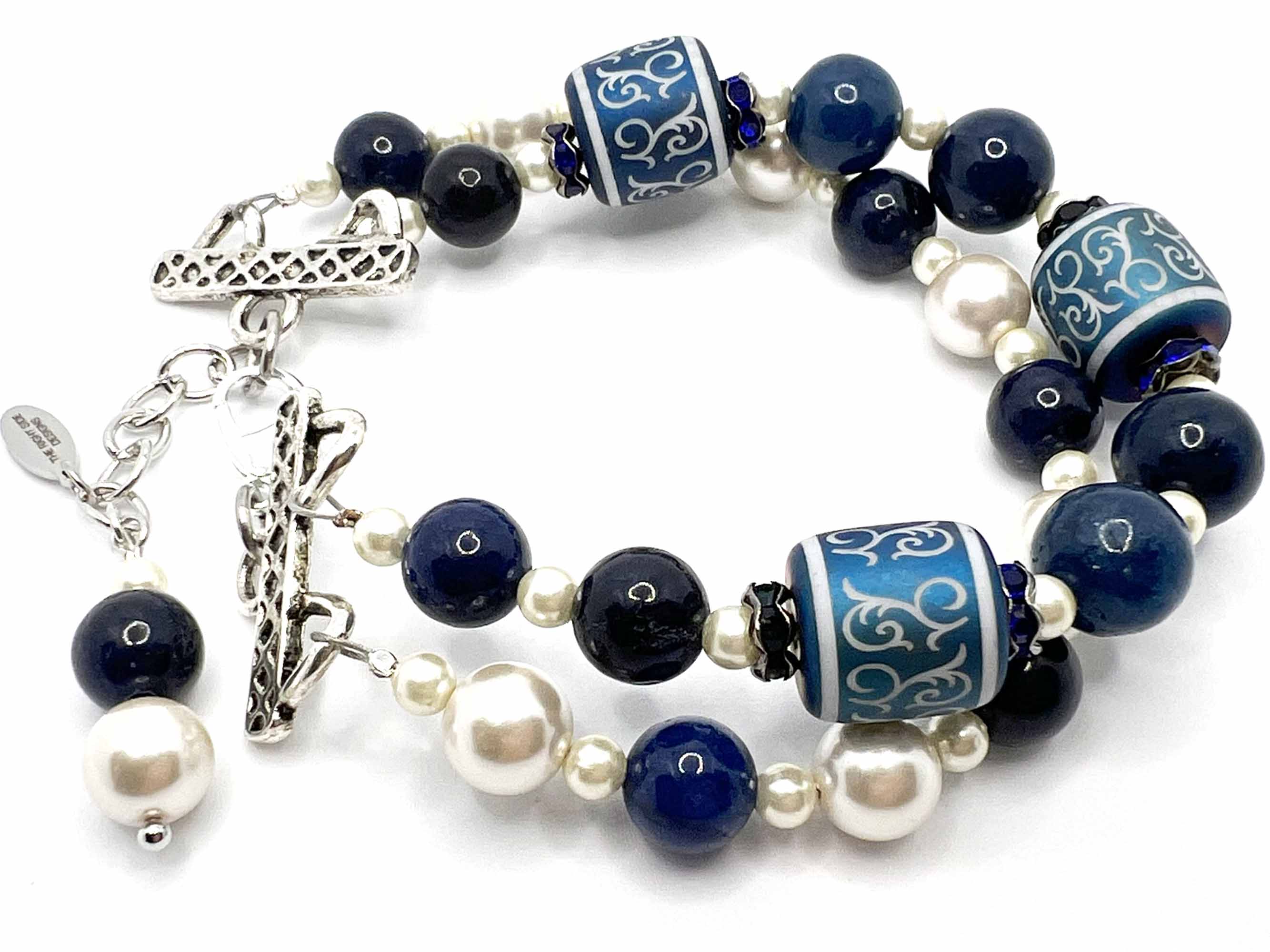 Elegant and timeless, this double-strand bracelet blends rich shades of blue with classic pearlescent tones. The design features 12mm cylinder clay beads adorned with delicate scroll patterns, accented by blue rhinestone rondelle spacers for a subtle sparkle.