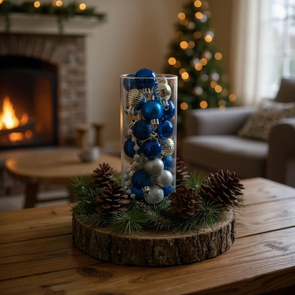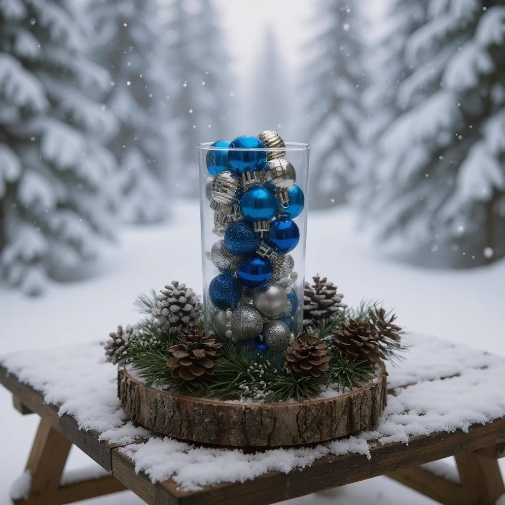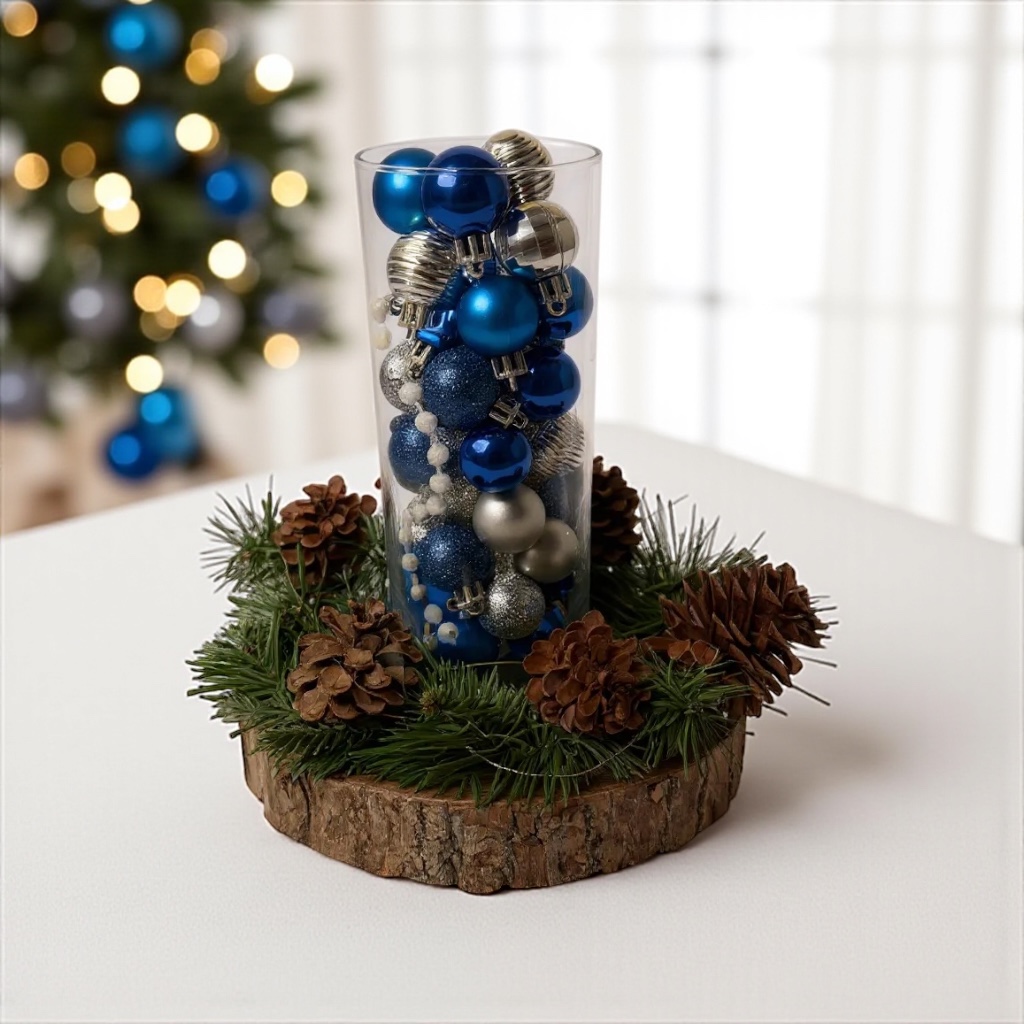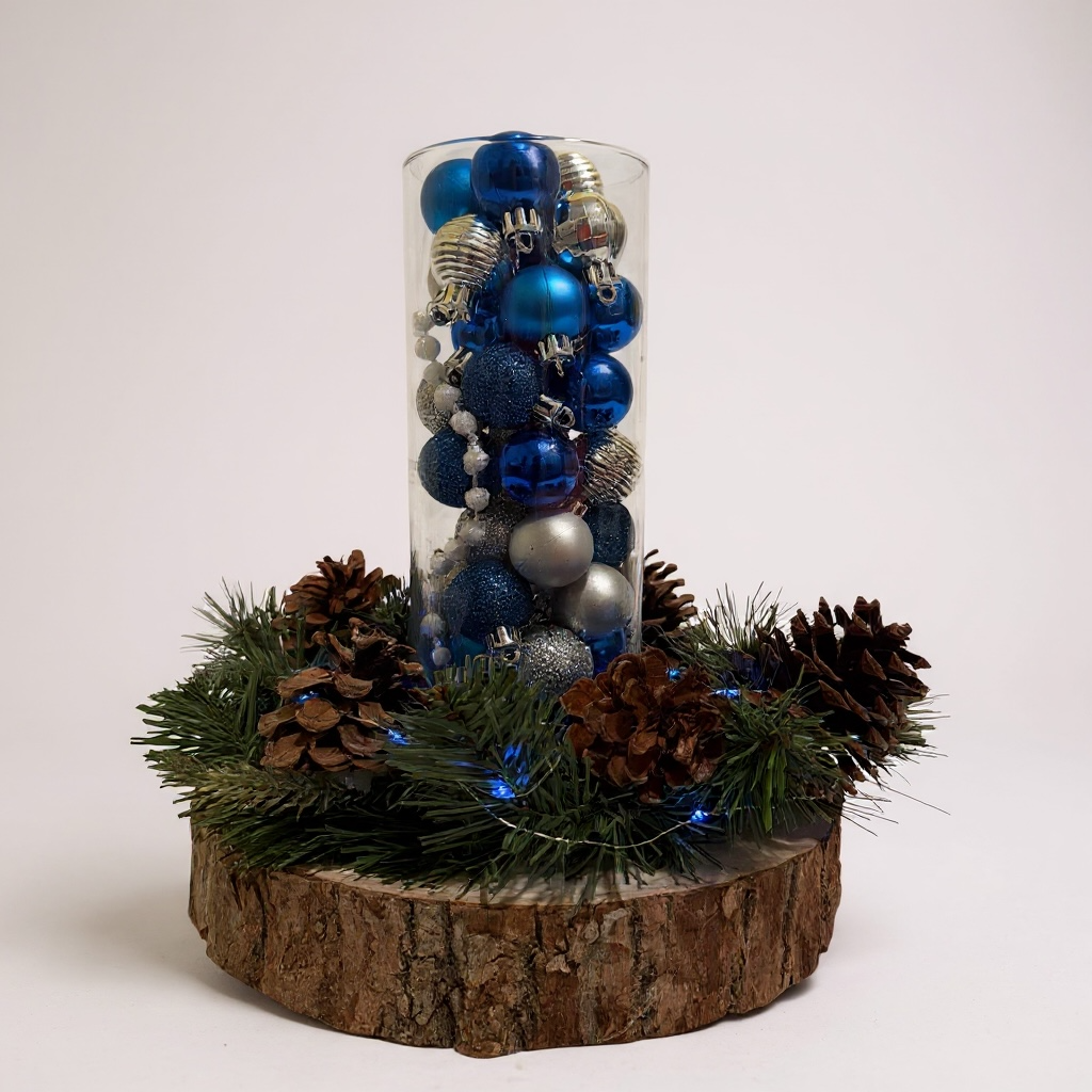 Celebrate the season with a handcrafted holiday centerpiece designed to bring warmth, tradition, and beauty into your home. Each piece is lovingly made with a rustic wood slice base, natural pinecones, evergreen greenery, and a glass vase filled with shimmering blue & white ornaments.