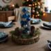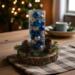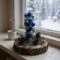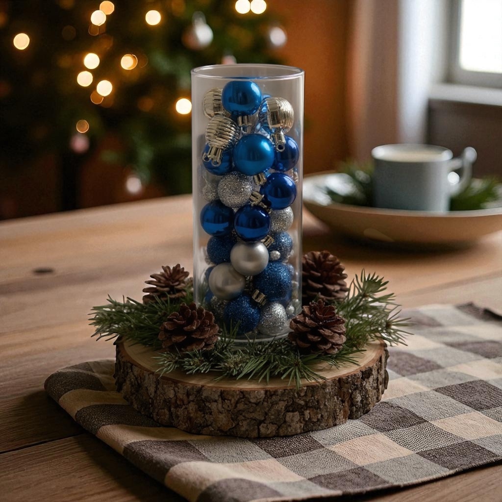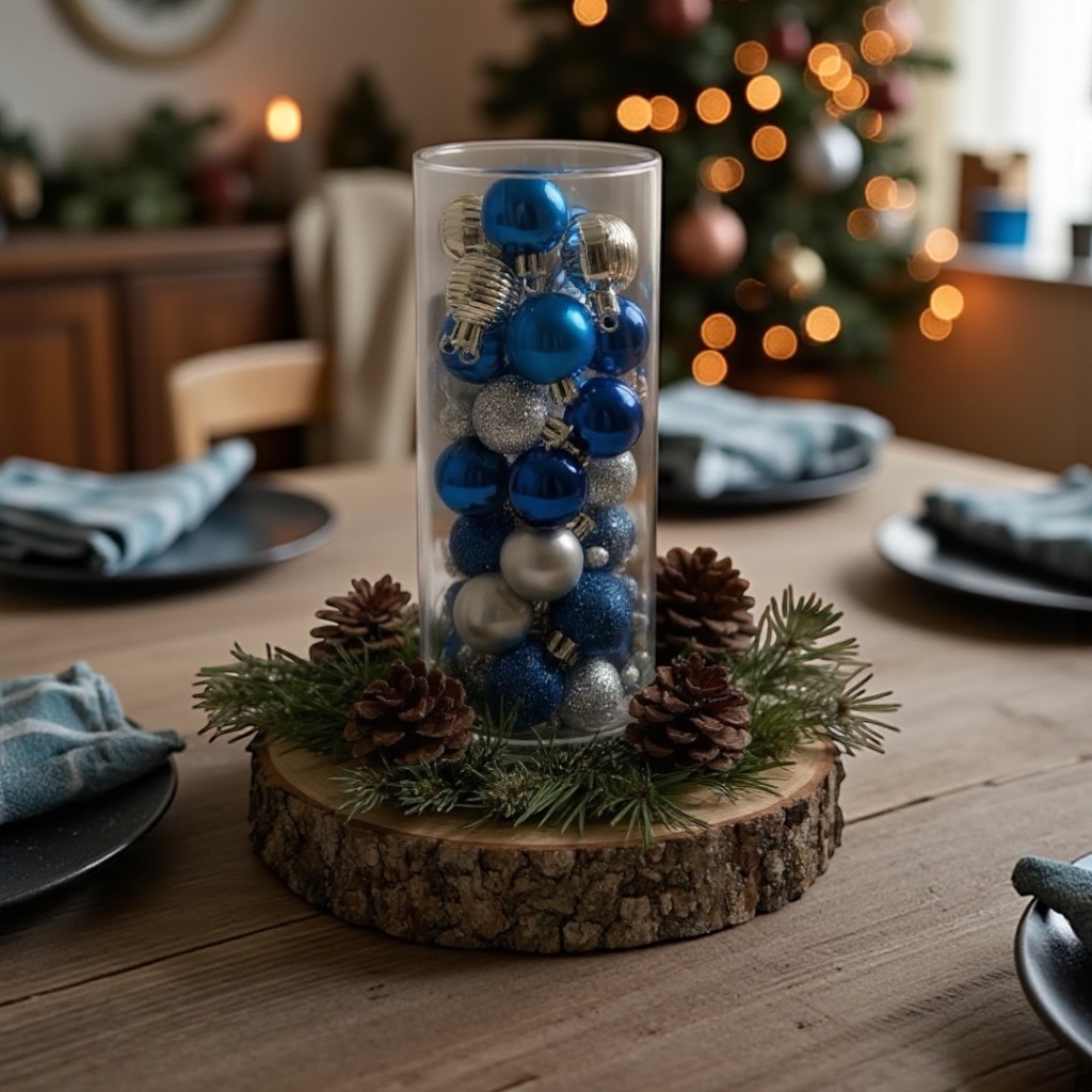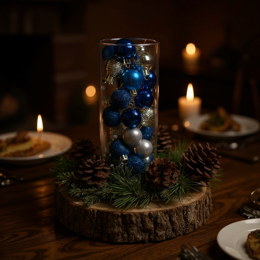 Celebrate the season with a handcrafted holiday centerpiece designed to bring warmth, tradition, and beauty into your home. Each piece is lovingly made with a rustic wood slice base, natural pinecones, evergreen greenery, and a glass vase filled with shimmering blue & white ornaments.