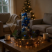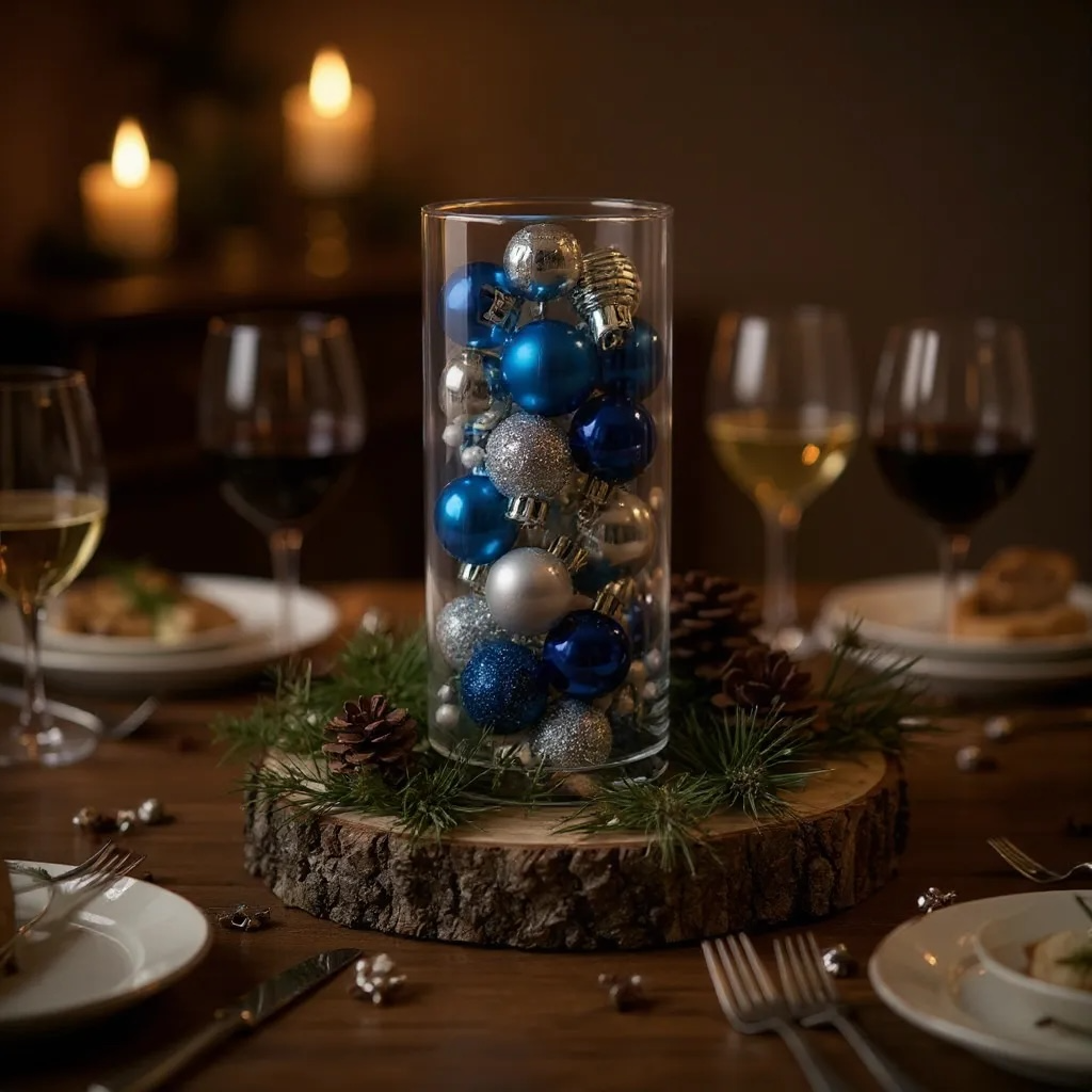 • Glass vase filled with blue & white ornaments for seasonal sparkle