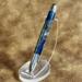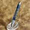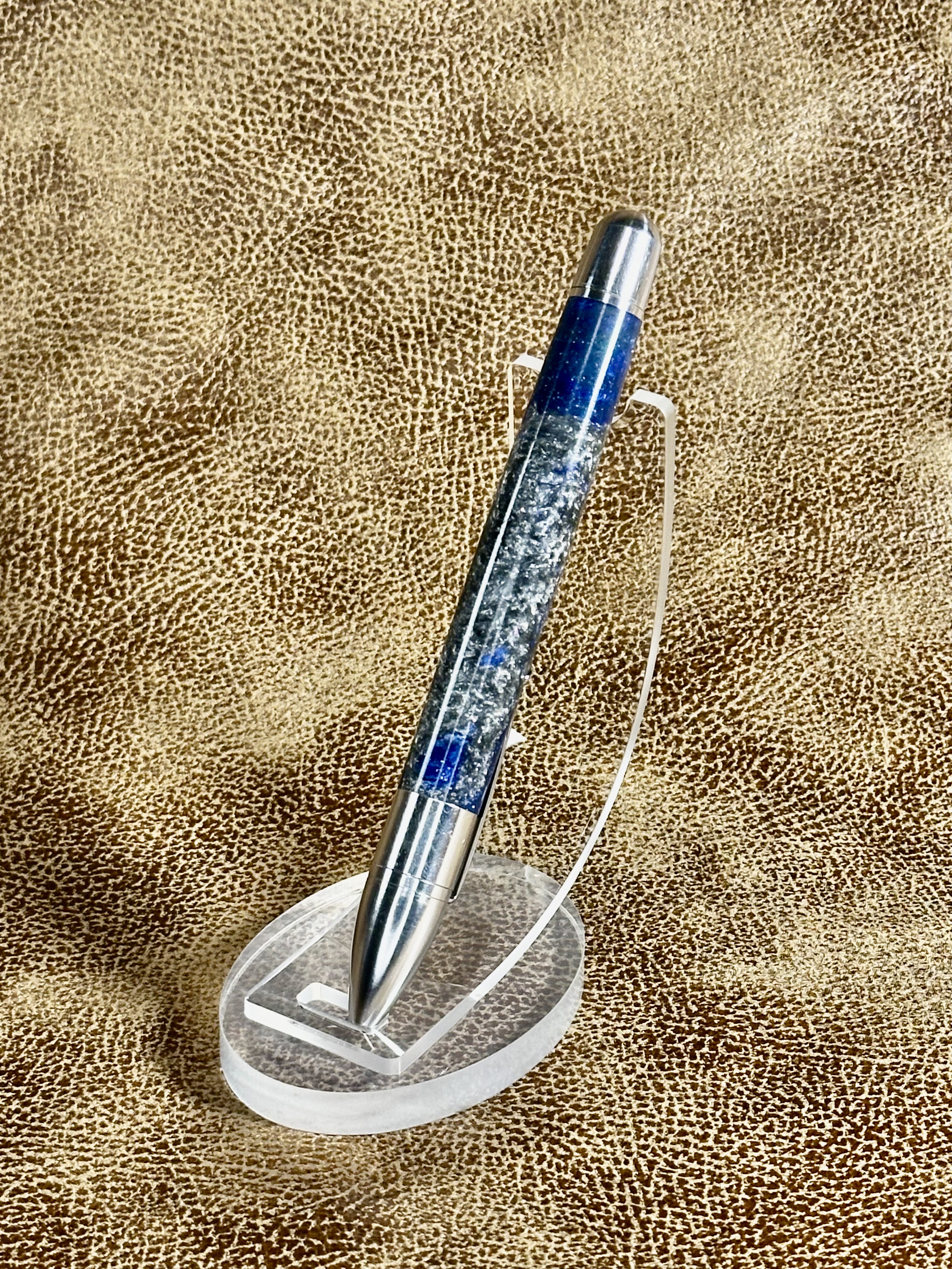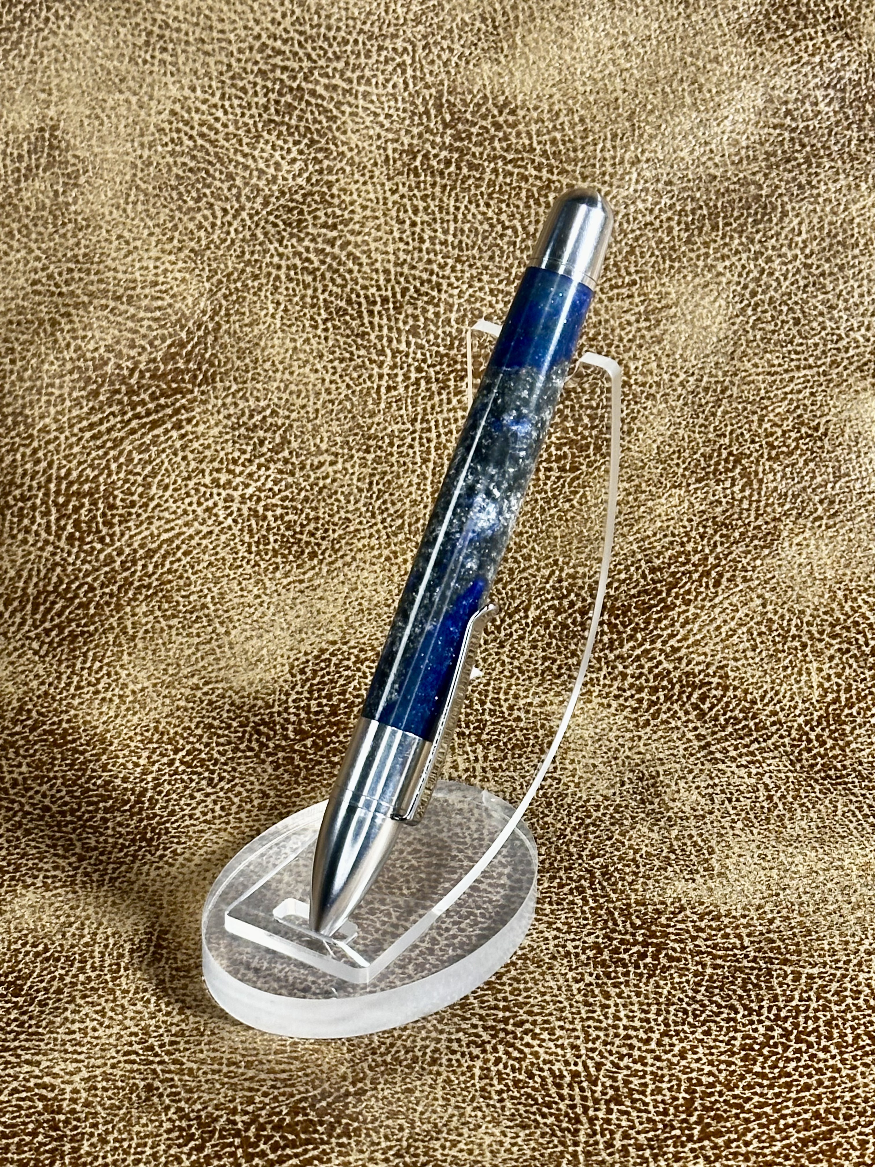 This pen is designed to evoke the night sky—deep blue tones layered with shimmering silver accents that resemble distant stars suspended in space. The crushed stone-style inclusions create a sense of depth and motion, giving the appearance of a miniature galaxy captured within the body of the pen.