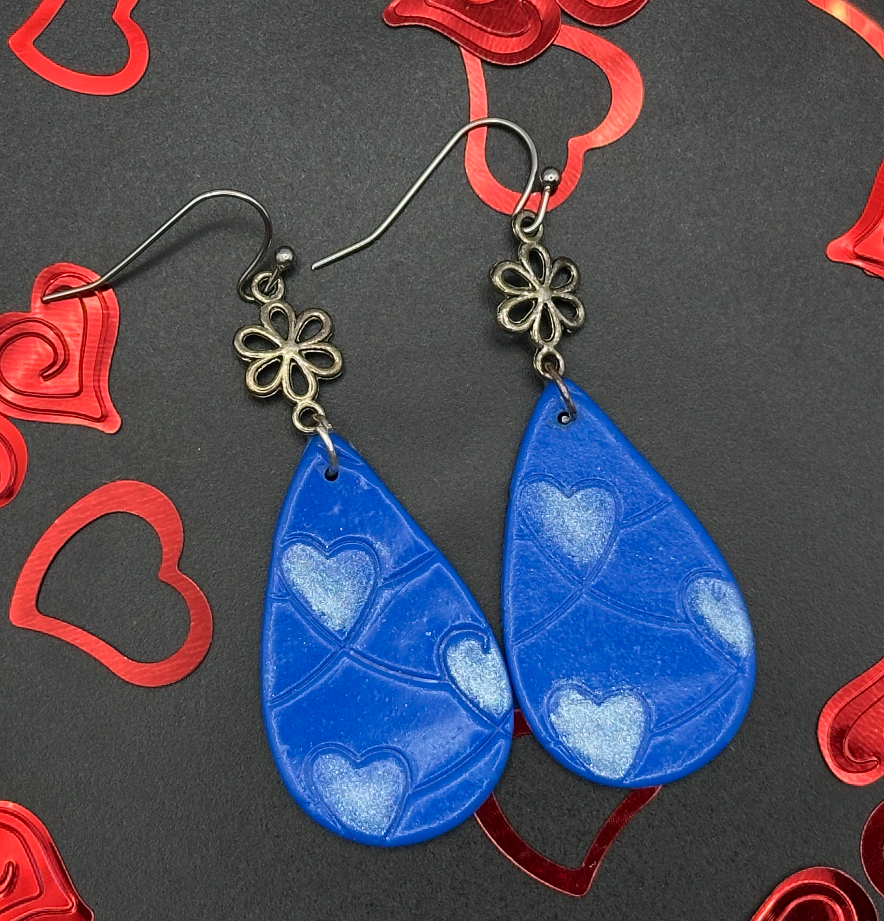 These bold blue teardrop earrings with embossed hearts and floral accents are a stunning mix of elegance and fun. Perfect for anyone who loves unique statement pieces!