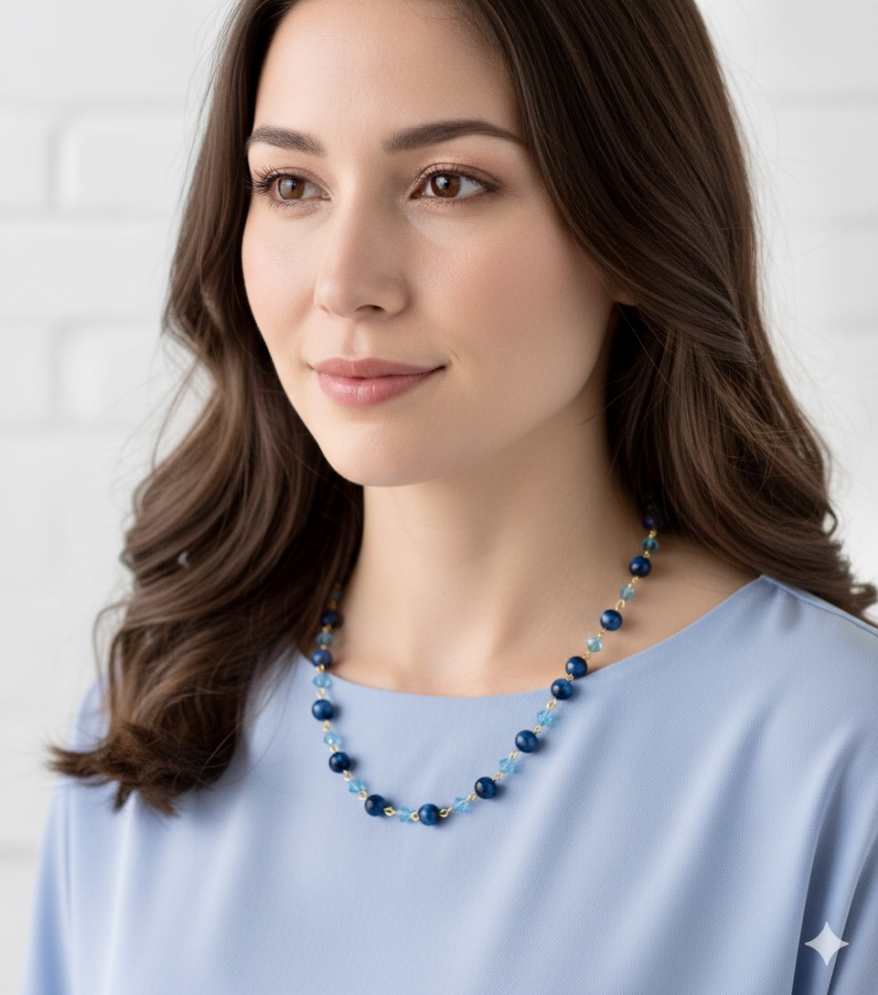 These rich, dark blue gemstones are beautifully complemented by the brilliant facets of the smaller aqua crystals, which add a touch of sparkle and lightness, reminiscent of shimmering clear waters. Every bead is joined with gold-tone links, creating a durable and elegant link chain that drapes gracefully around the neckline.