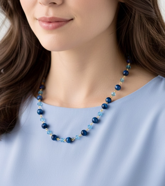 This versatile necklace is perfect for adding a touch of sophisticated color to both casual and more formal ensembles. Whether you're looking for a unique piece to express your personal style or a thoughtful gift for someone special, its tranquil blue hues and subtle sparkle make it an ideal choice for any occasion.