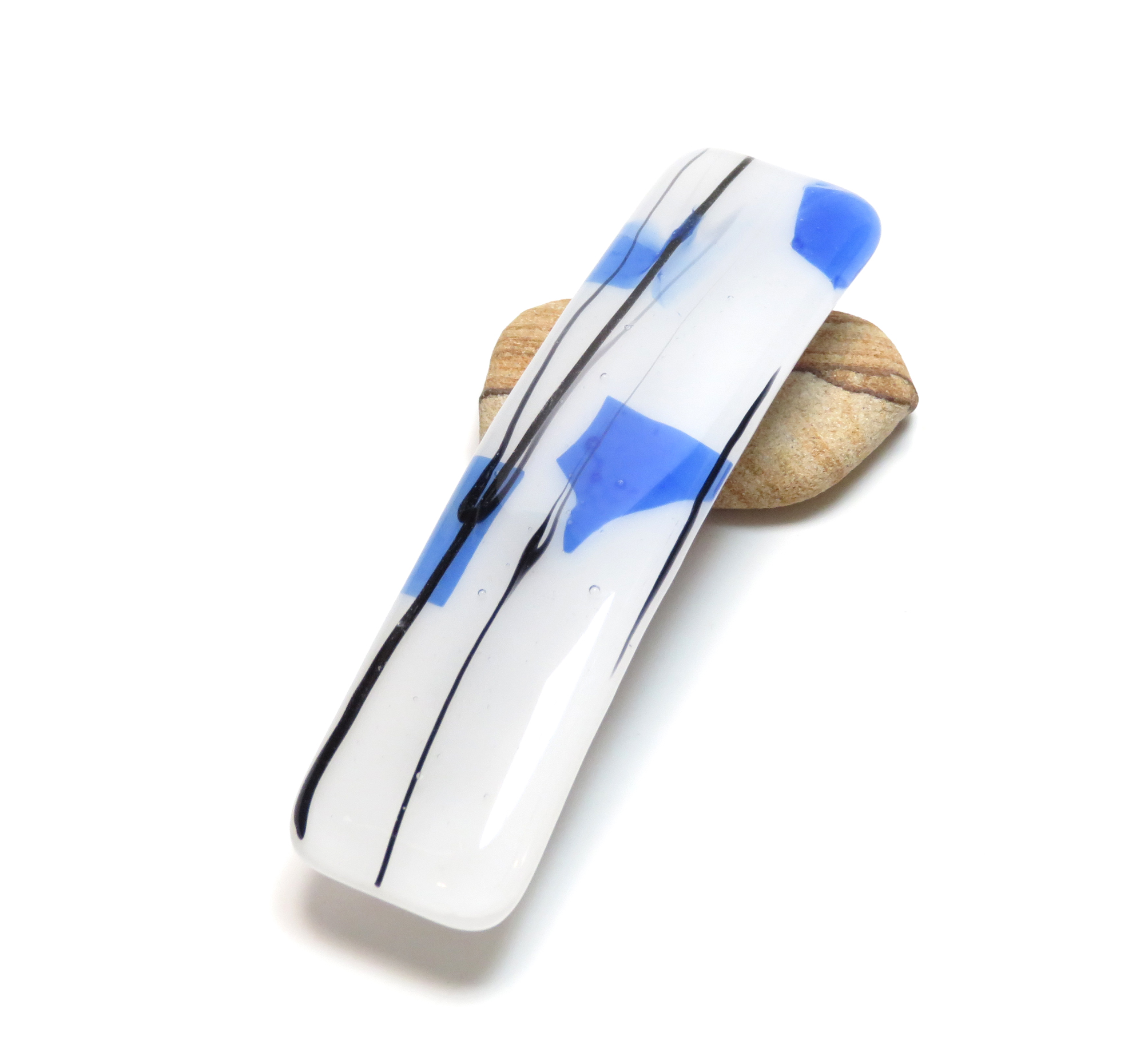 Bring modern elegance to your everyday style with this handcrafted blue and white fused glass barrette, designed specifically for thick hair. Kiln-fired in my Minnesota studio, this 4-inch glass hair clip features crisp geometric blues, soft white glass, and artistic black stringer lines for a clean, contemporary look.