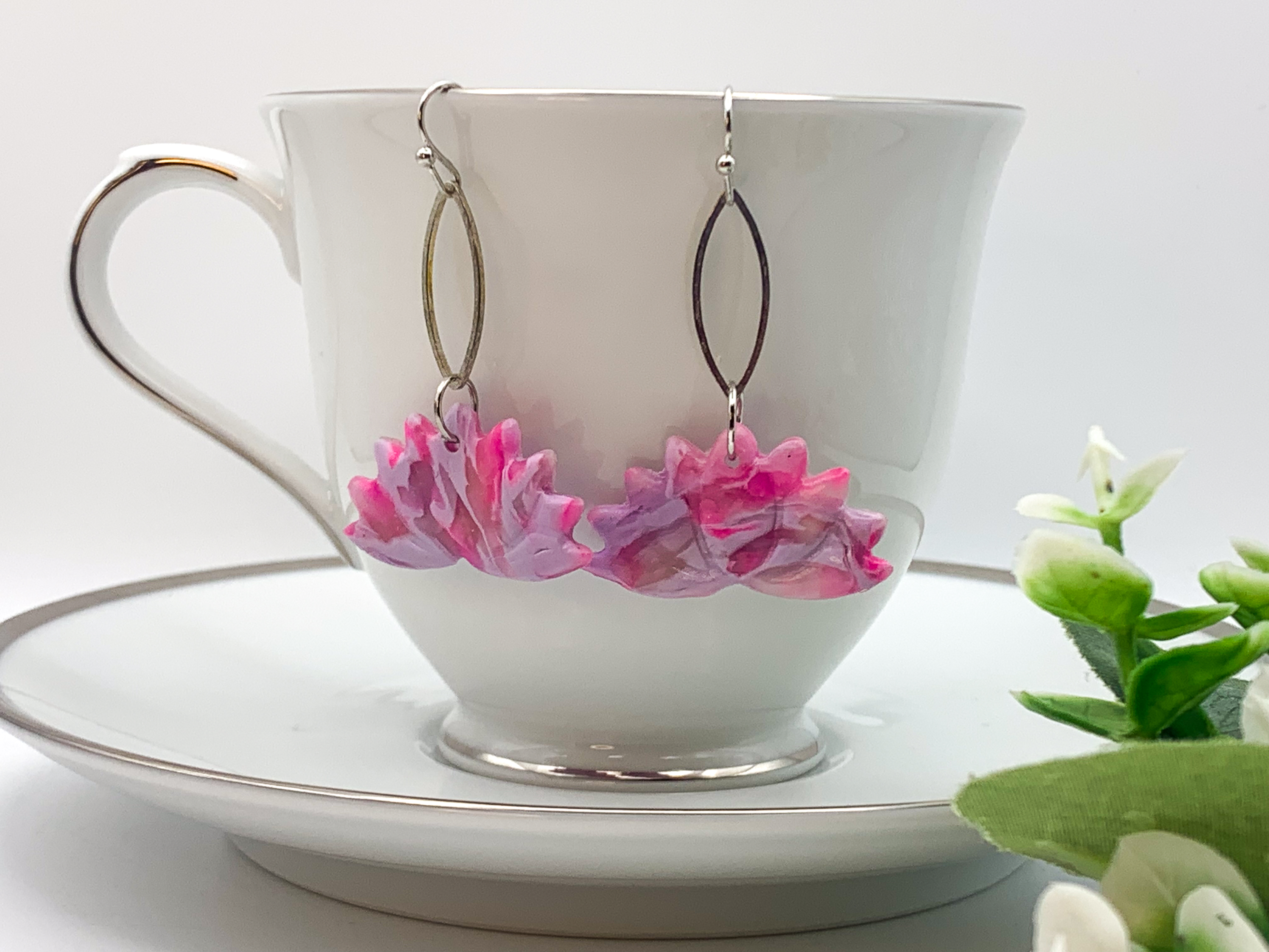 Soft pink marbling and delicate floral shapes make these earrings a romantic accessory for any occasion. ?