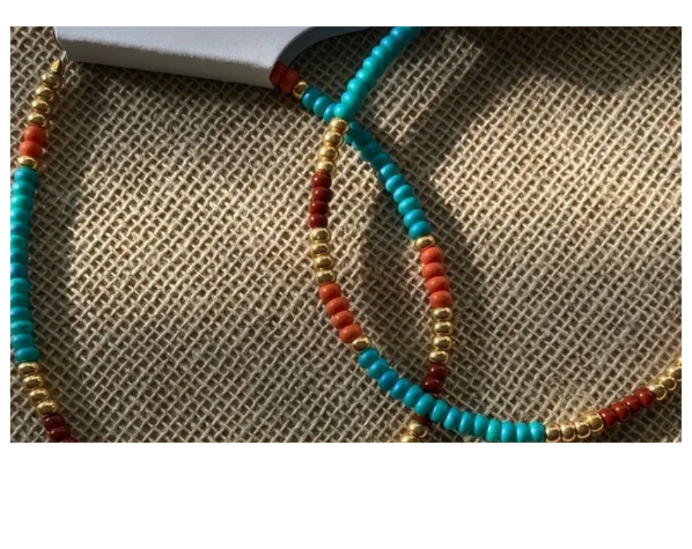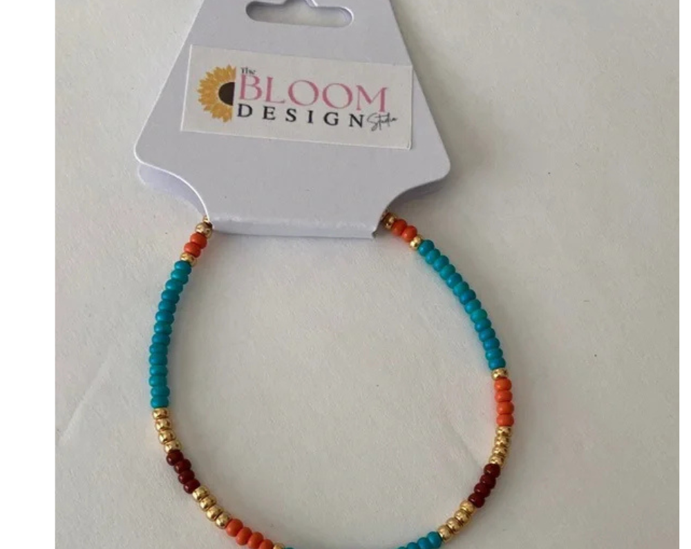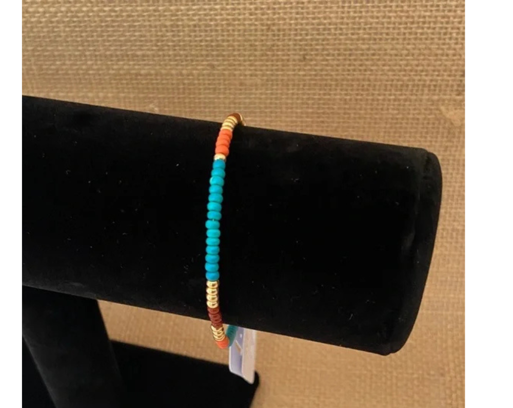 Chic bracelet with vibrant beads. Features a mix of blue, orange, and gold tones. Ideal for any style.