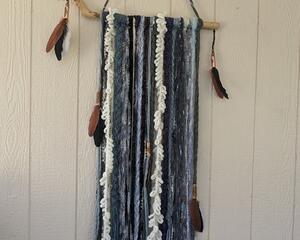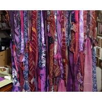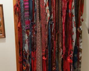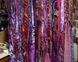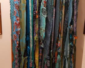 This piece, named Subtle Vibe, is a compilation of some of the most beautiful scarves I could find, with materials including silk, rayon, gauzy polyester and acetate - any material with all the "feels". Running your hand through the strands is like a soft and feminine caress. The wind blowing through these curtains is mesmerizing. These works of art can be used as either curtains or in doorways, as headboards, behind a favorite chair or even as a large deck flag. Their bright beautiful colors will enchant you and bring a true Boho vibe to any room in your home.