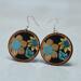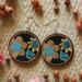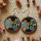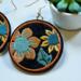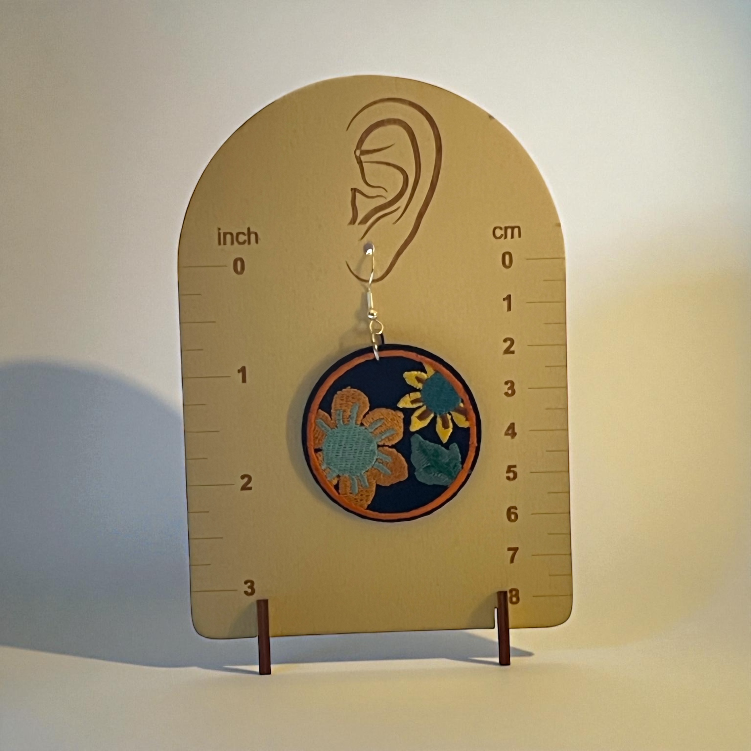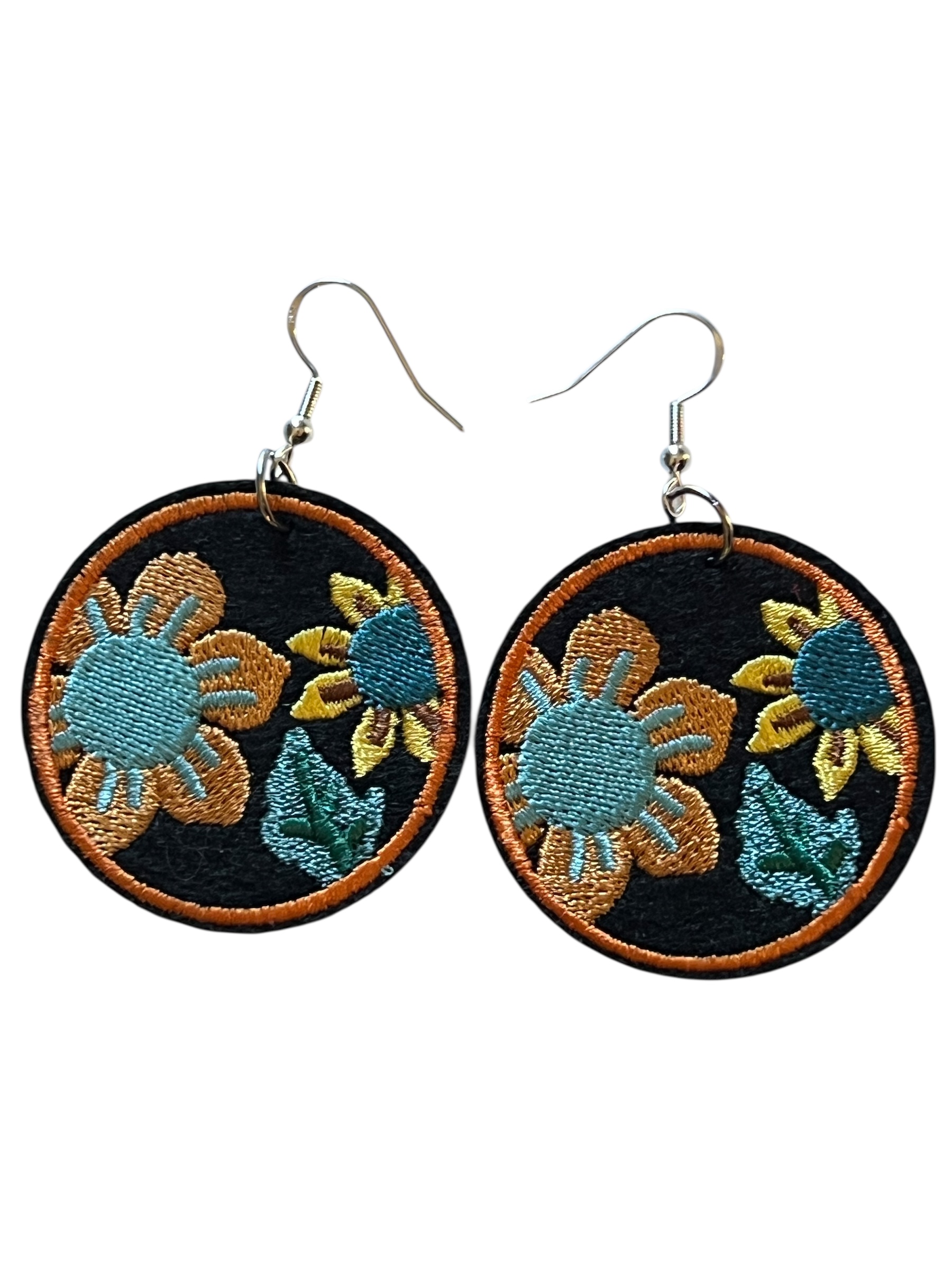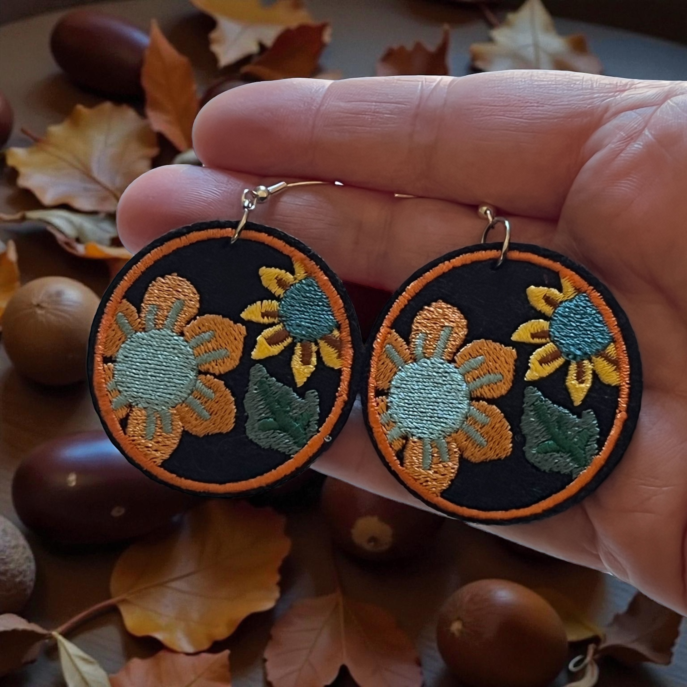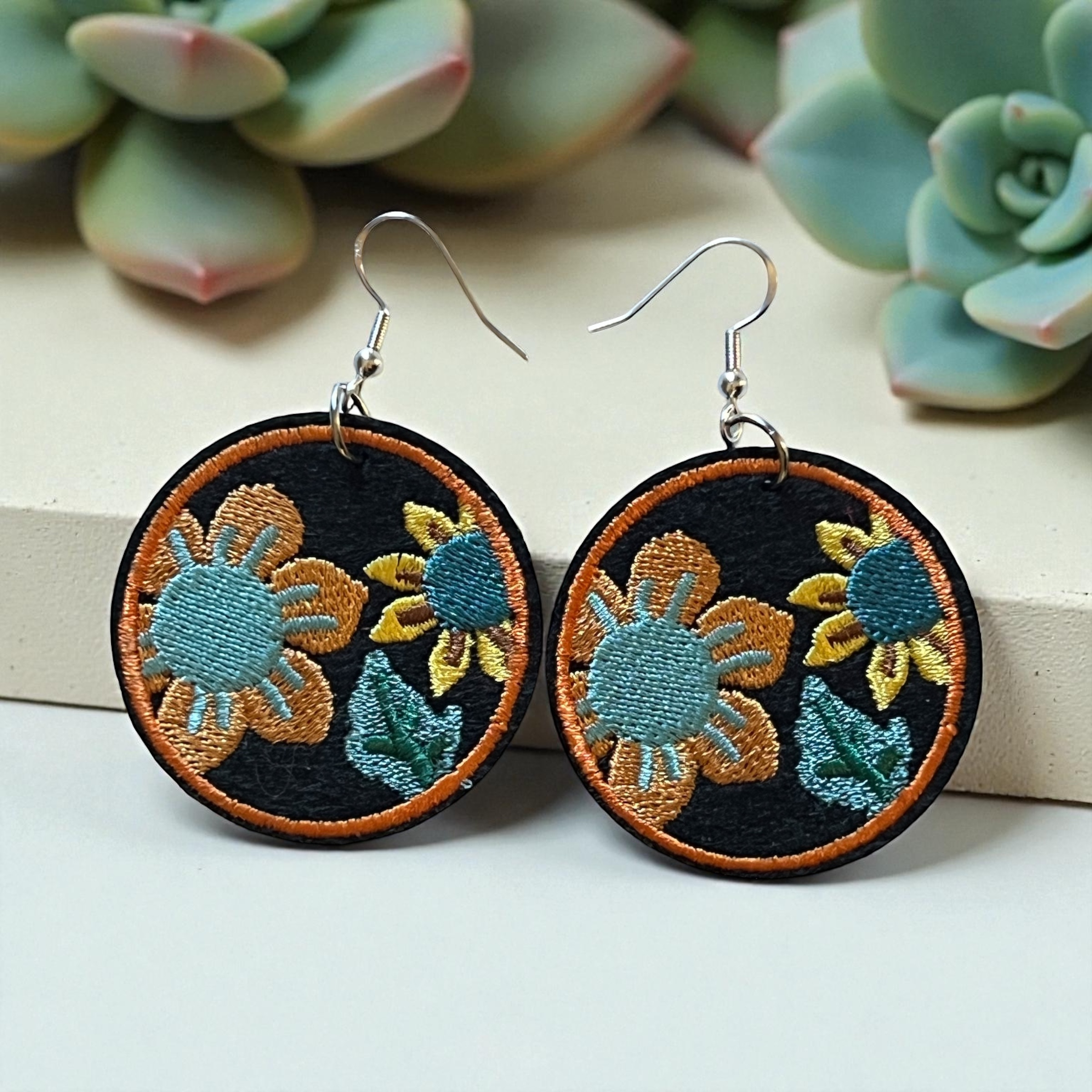These boho embroidered floral earrings bring sunny, nature-inspired charm to your outfits. Teal and mustard sunflower-style blooms with a green leaf pop against a deep black background, framed by a warm orange border. The round embroidered discs make a bold statement while staying surprisingly lightweight, and S925 sterling silver hooks add a comfortable, polished finish.