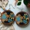 • Design: Round embroidered floral discs with teal and mustard blooms and a green leaf on black