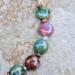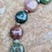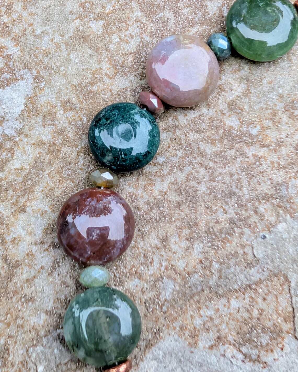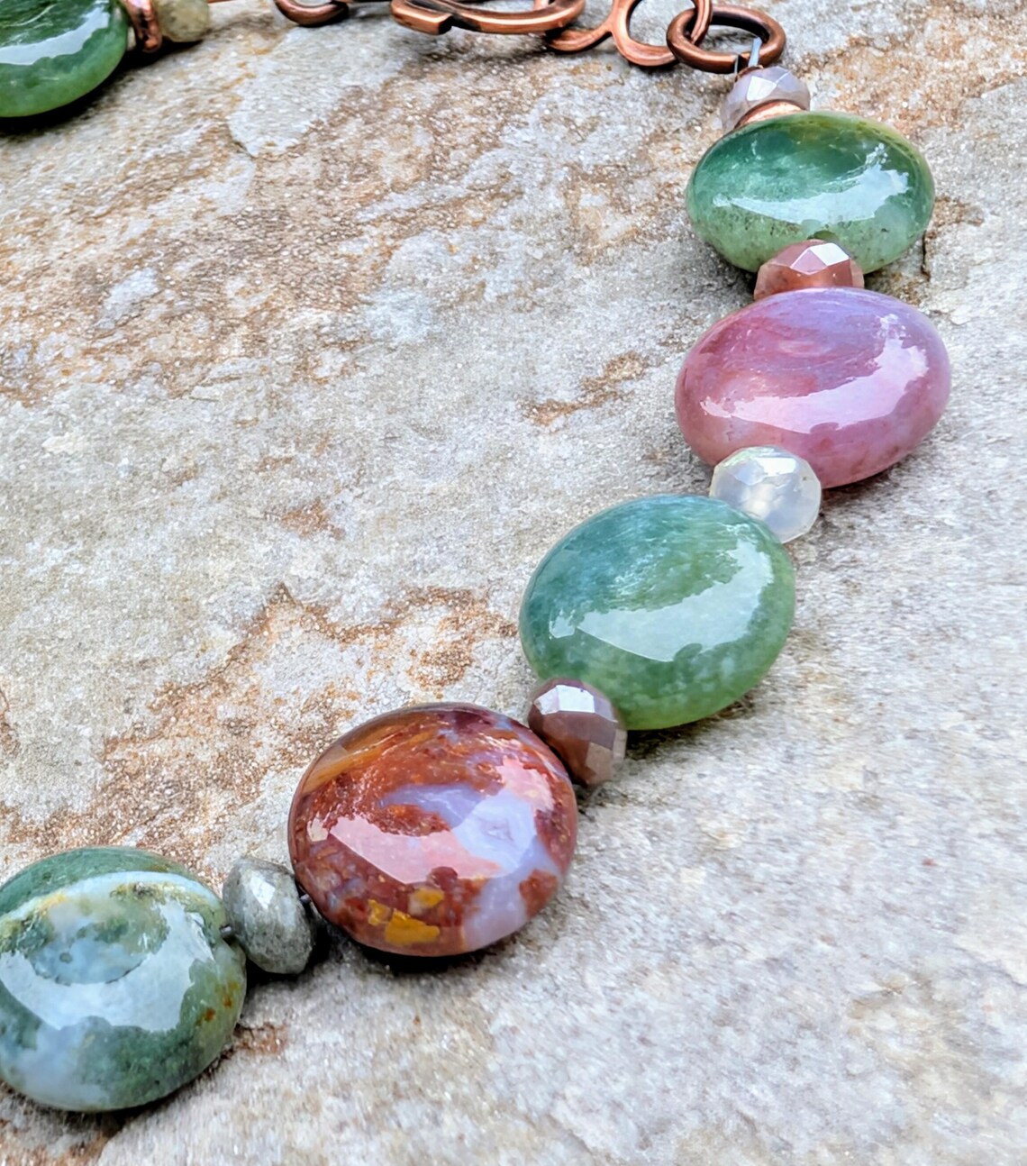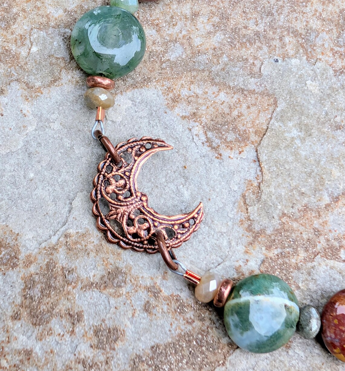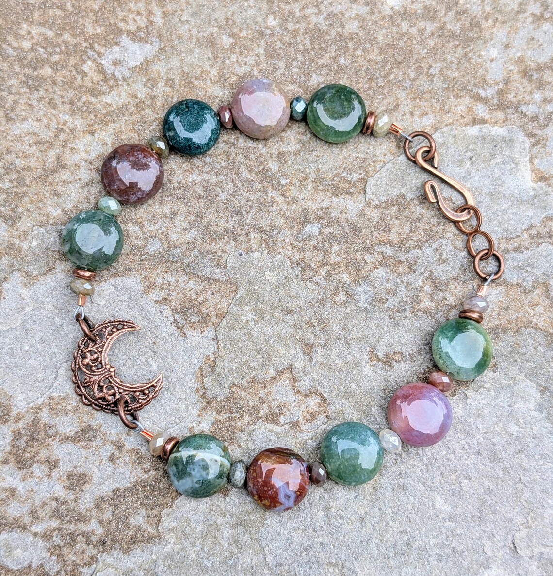 Handmade boho style crescent moon bracelet, featuring 10mm smooth fancy jasper coin gemstone beads, with 3x4mm fancy jasper faceted rondelle beads in between. An antiqued copper filigree crescent moon sits in the center of the beaded bracelet.