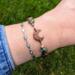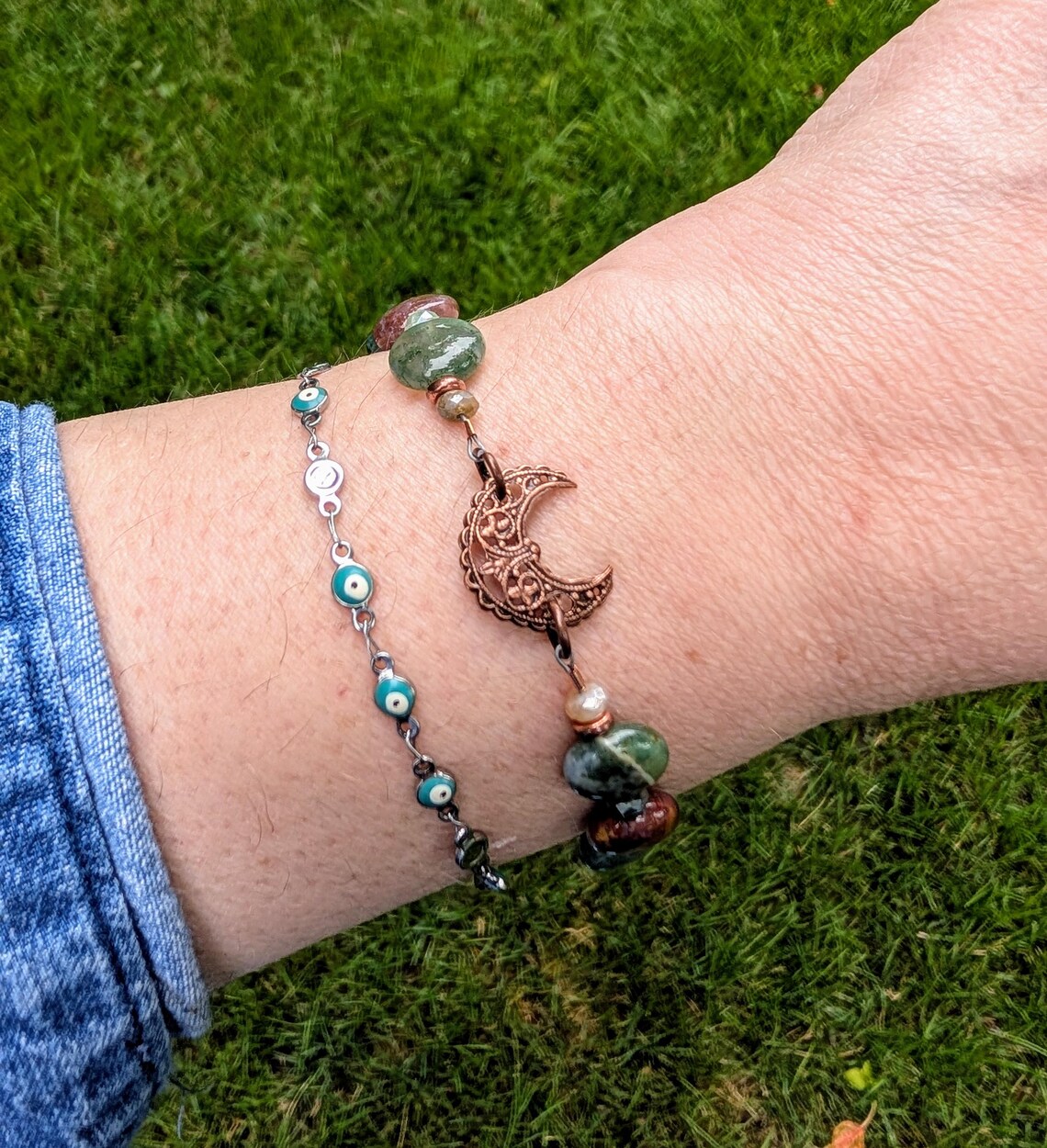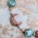 The crescent moon measures about 3/4 inch tall/wide. An antiqued copper hook and eye clasp finishes off the bracelet.