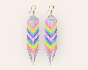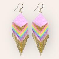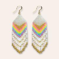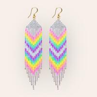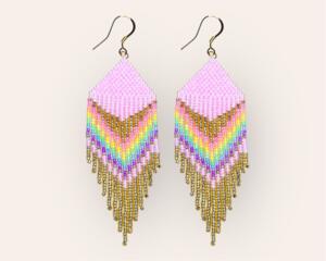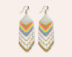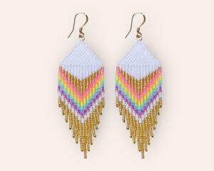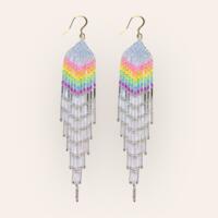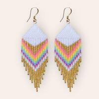 These radiant beaded fringe earrings are handmade with a smooth ombré rainbow gradient that cascades from soft white down to dreamy lilac, finished with golden tips that catch the light beautifully. Lightweight and full of movement, they’re the perfect statement for sunny days, joyful hearts, and anyone who believes in color magic.
