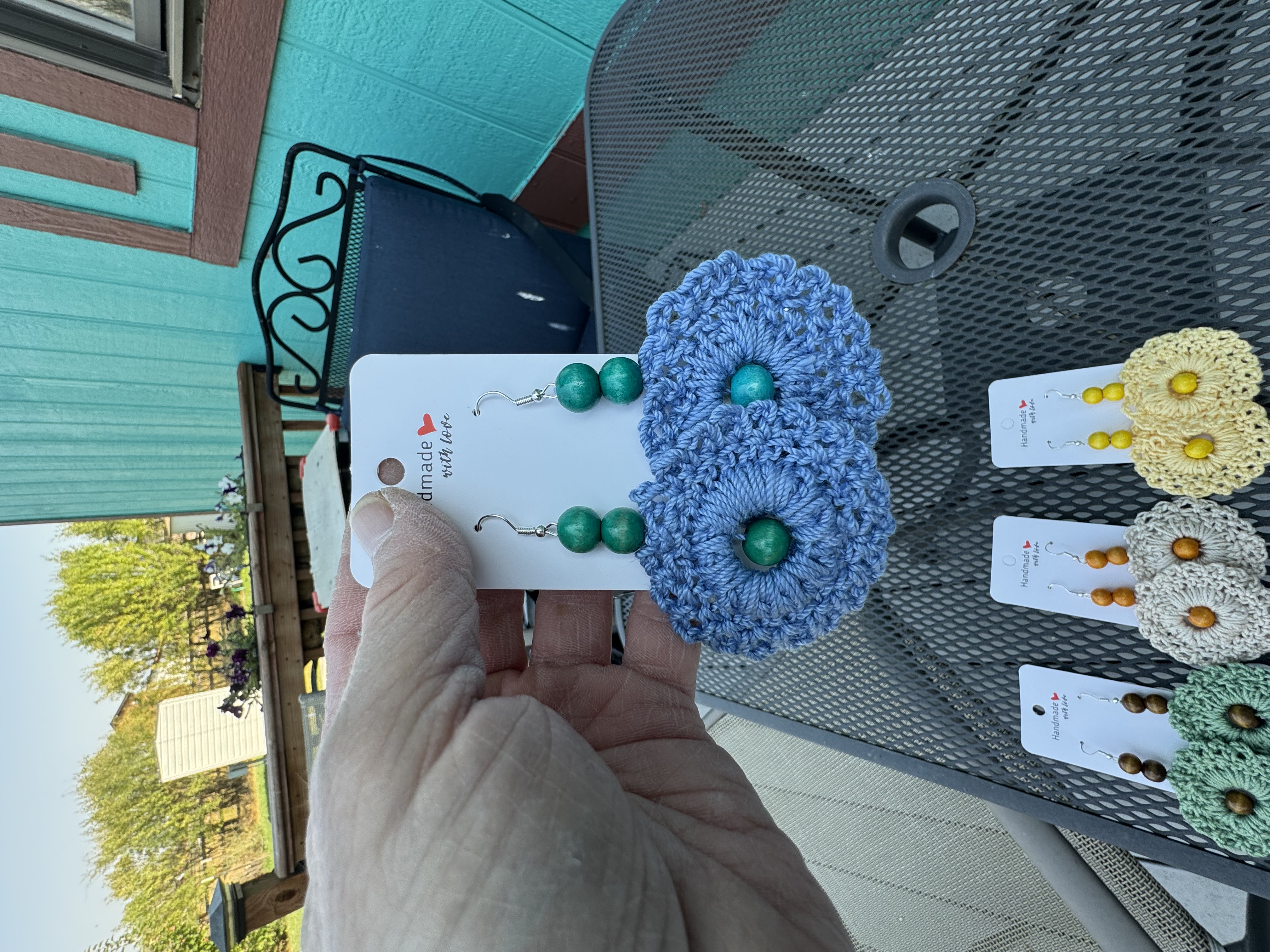 I made these earrings with a small 2 mm crochet hook and some size 3 cotton thread which is a fine weight making them a lightweight. I used simple basic stitches, the pattern concept I got from a gal on YouTube @andiscrochet. I’m going to probably be adding more colors as I get more thread. I really like this one and the wood beads I have with it really adds the right touch to them. They are made with fish style hooks.