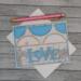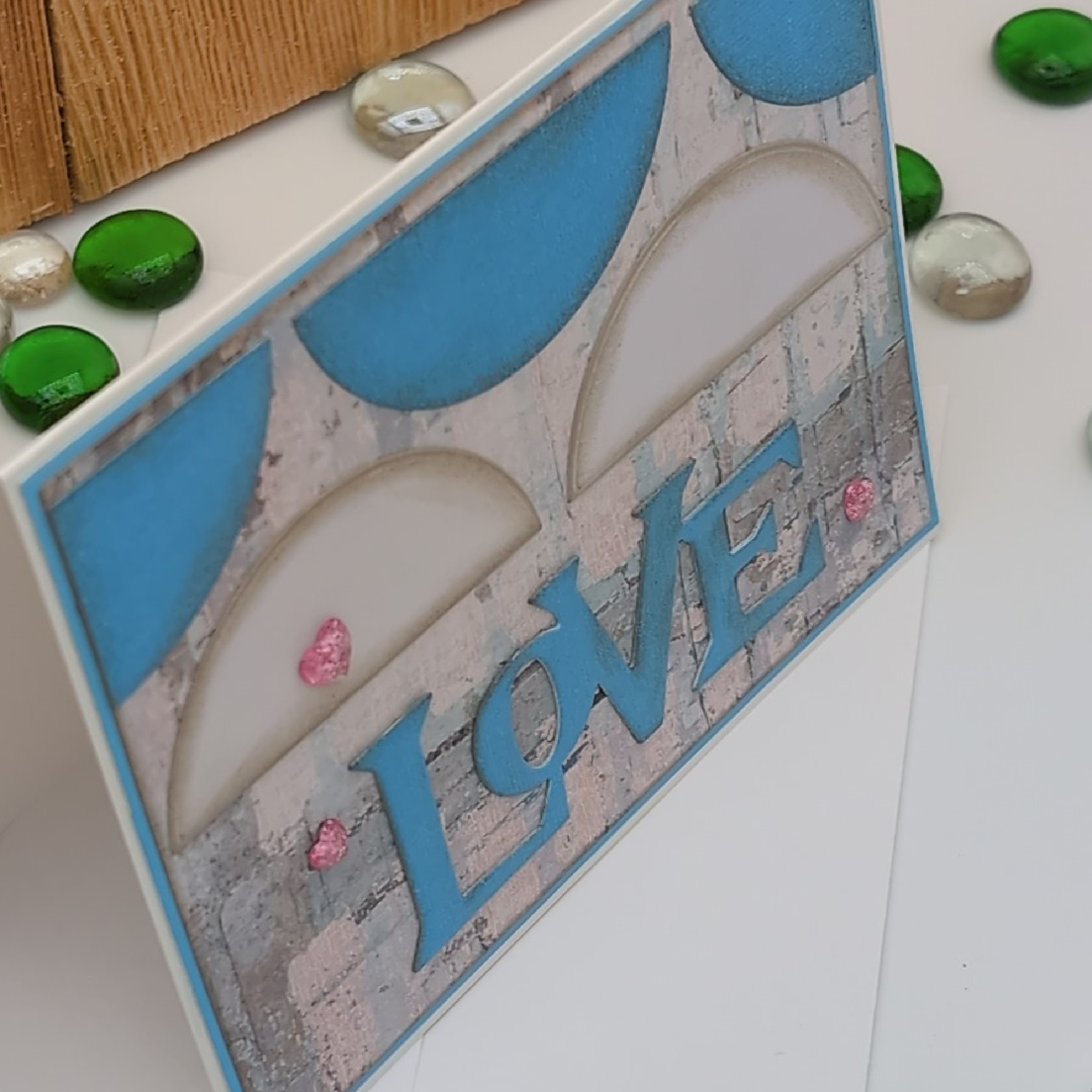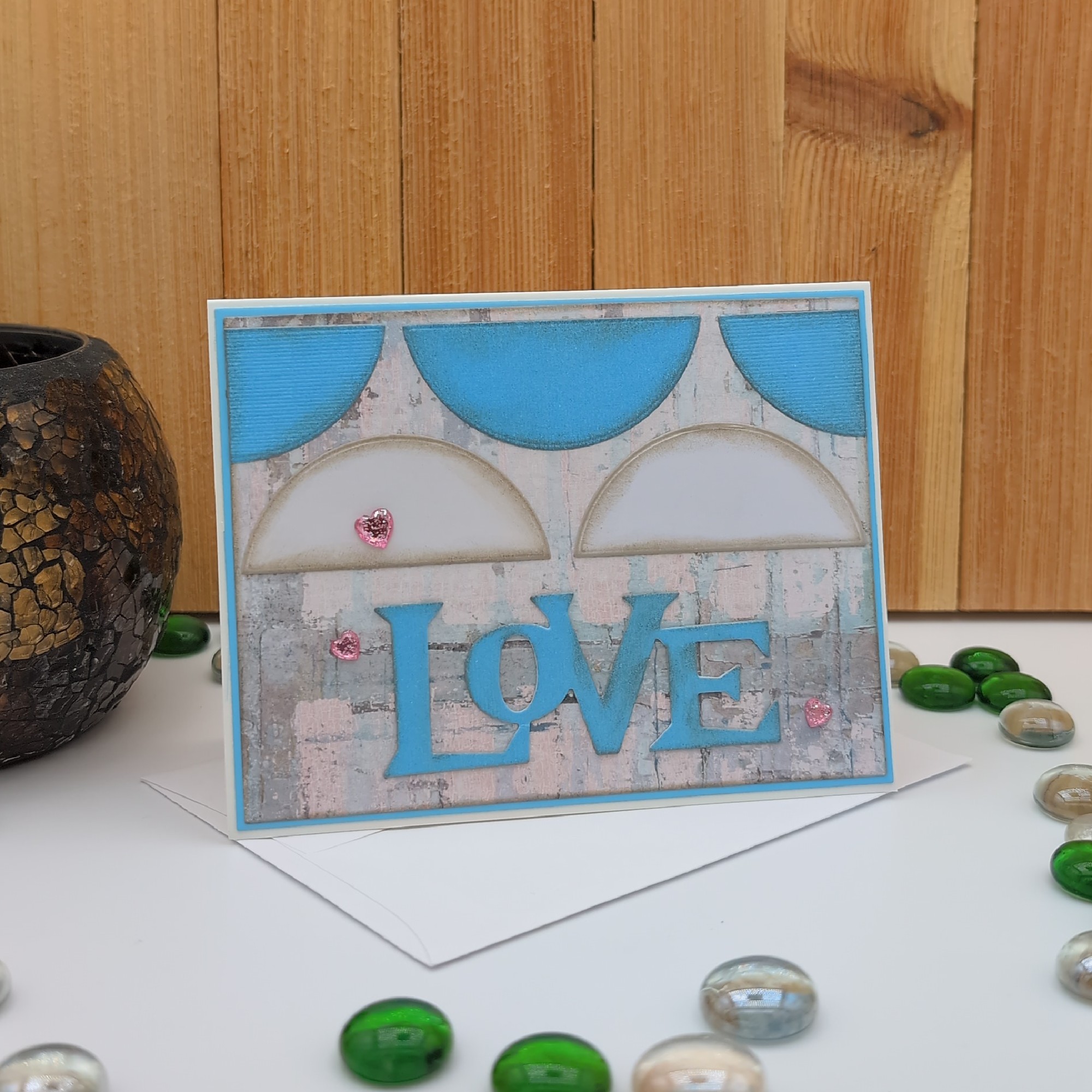 This handmade greeting card showcases the word “LOVE” in bold blue letters against a pastel brick-textured background, accented by glittery pink hearts and layered semi-circles. Blank inside for your heartfelt message, it’s ideal for Valentine’s Day, weddings, anniversaries, or simply reminding someone they’re loved. A painterly, dimensional design that speaks volumes without saying a word.