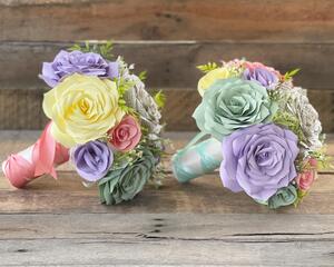 We cut each petal from a pattern specifically created for the style of flower we use in each piece. Each petal is then dipped in a color and hung on a line with clothespins to dry. We then attach each petal individually to its stem. Each flower will be styled and curled petal by petal to create a beautiful handmade paper rose. We use coffee filter paper to achieve a more realistic flower.