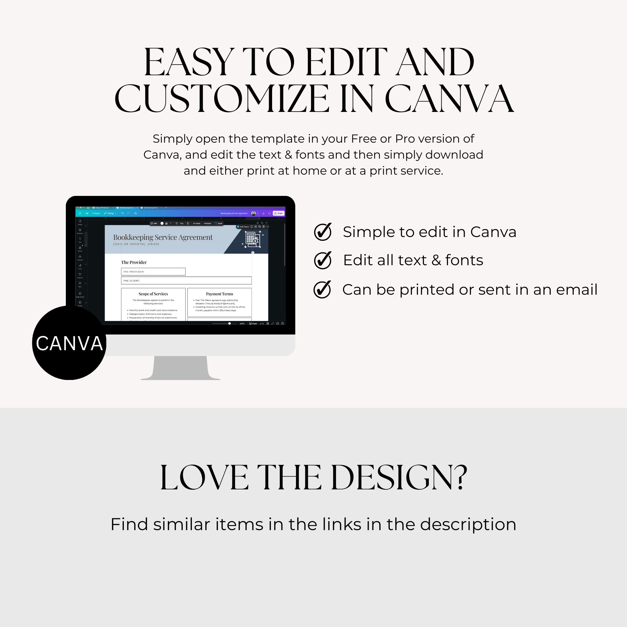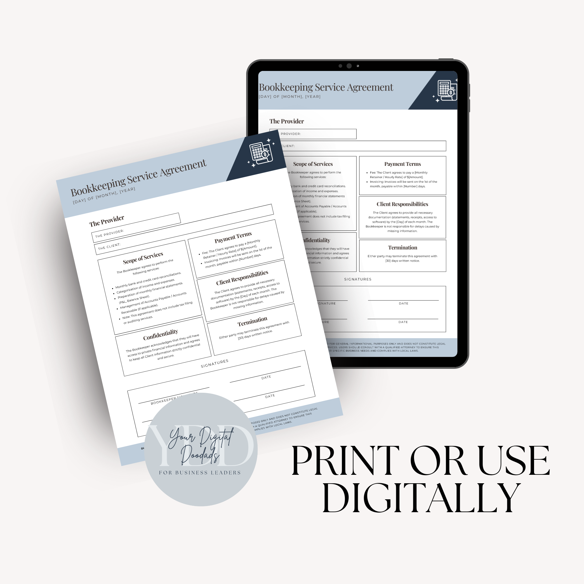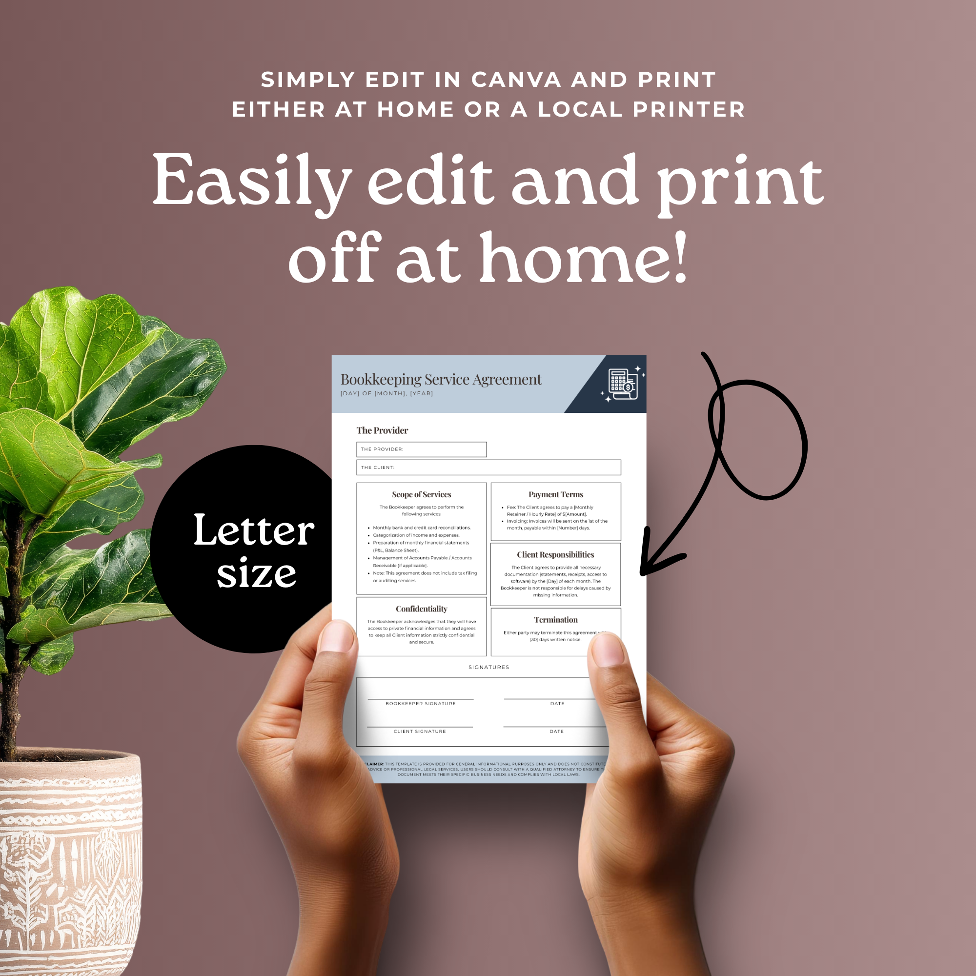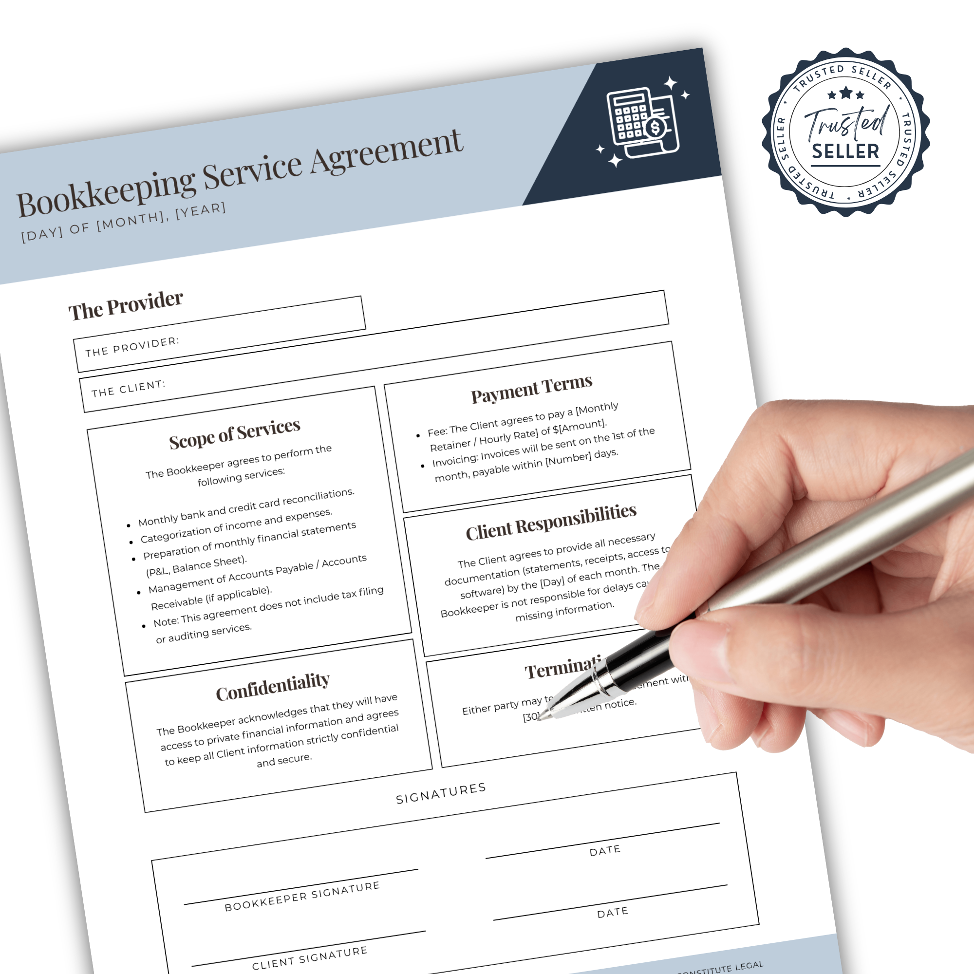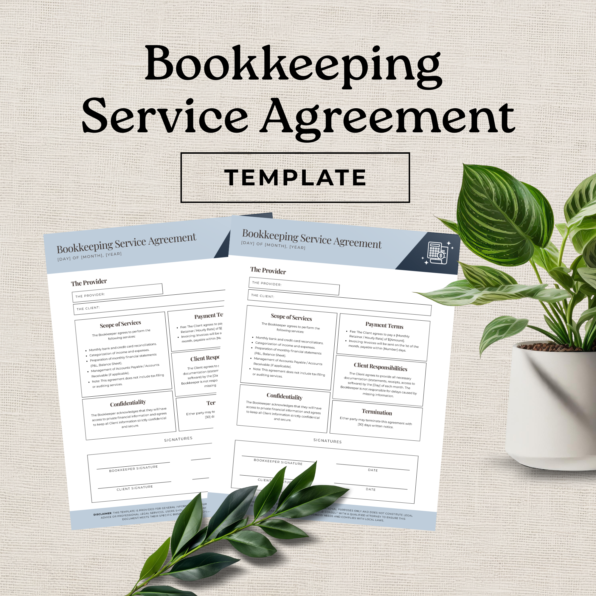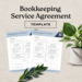 This template is ideal for freelance and virtual bookkeeping businesses who need a ready-to-use form that outlines service terms, payment terms, client responsibilities, confidentiality, and termination details—all in one clean page.
