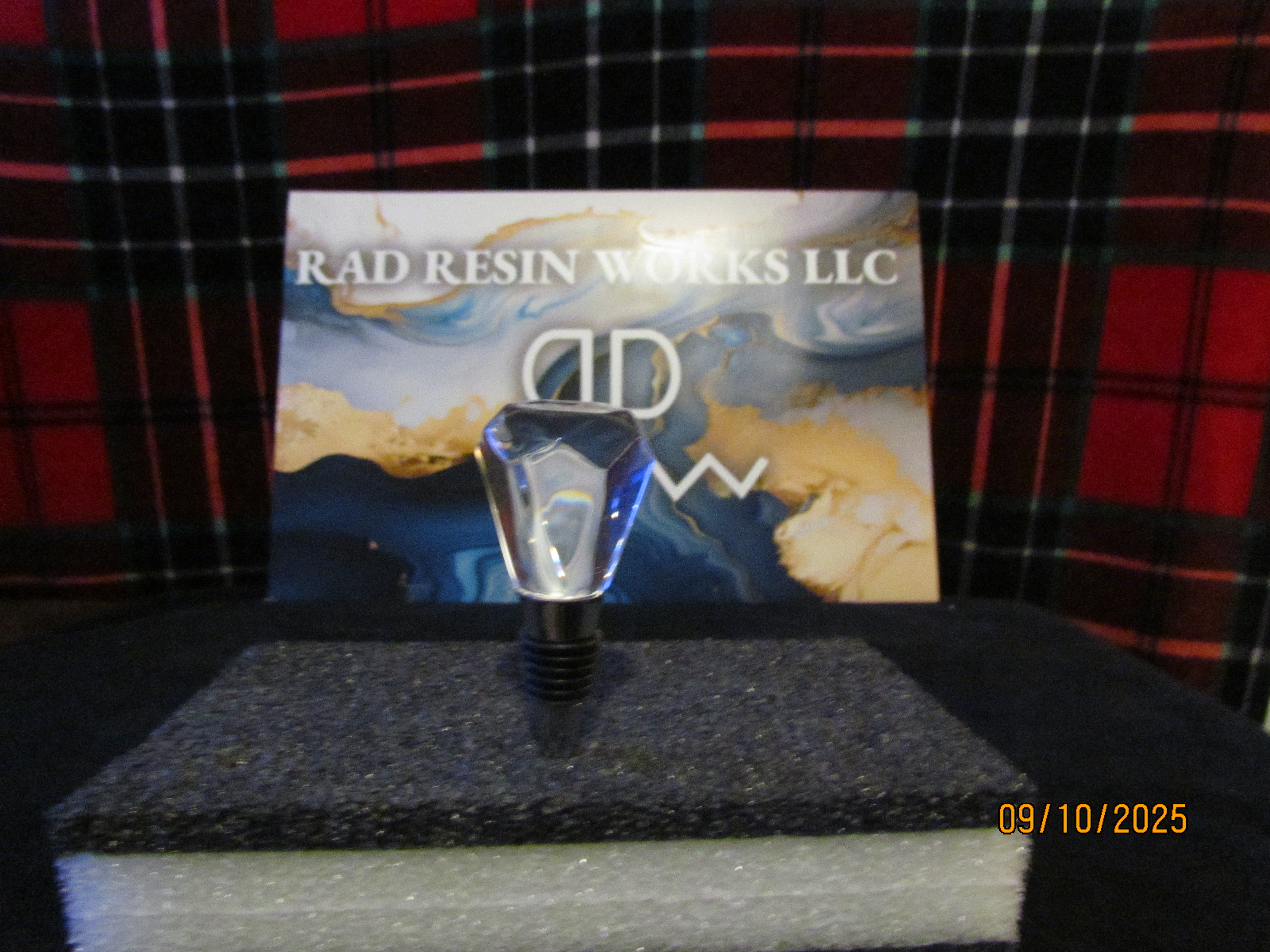 this bottle stopper is crystal shaped. it has blue swirls inside of it.