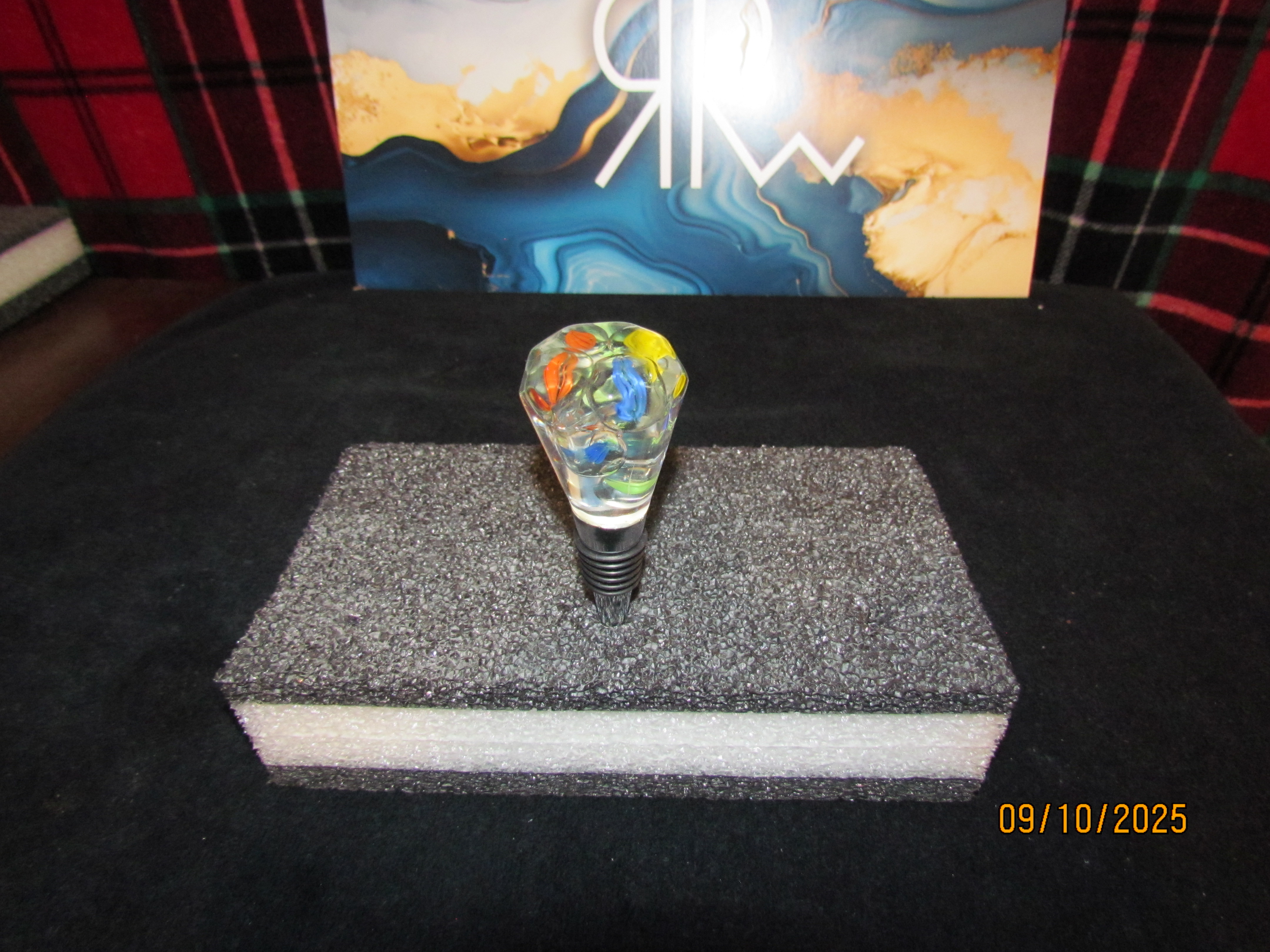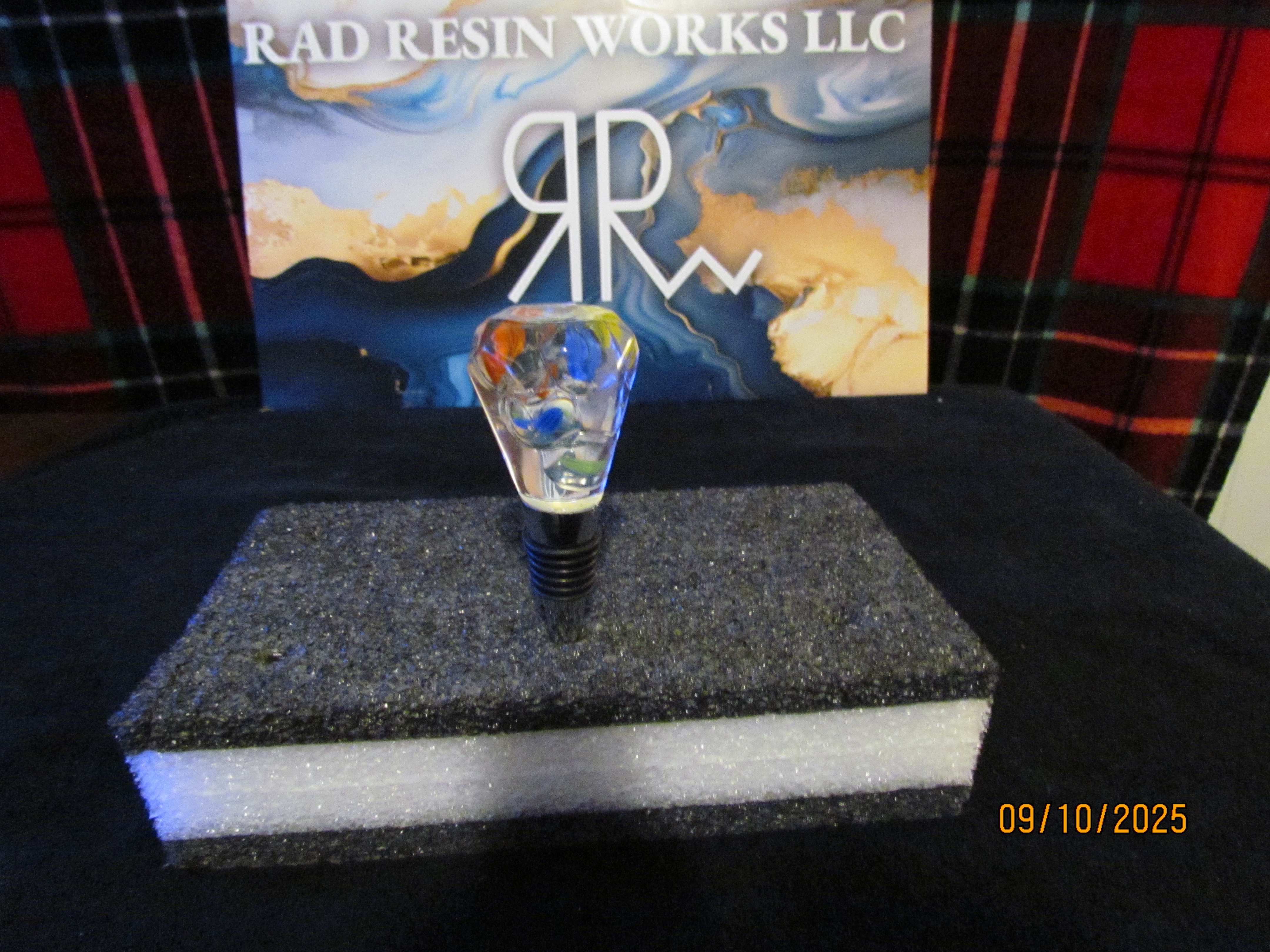 this bottle stopper id diamond shaped with marbles inside of clear resin
