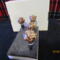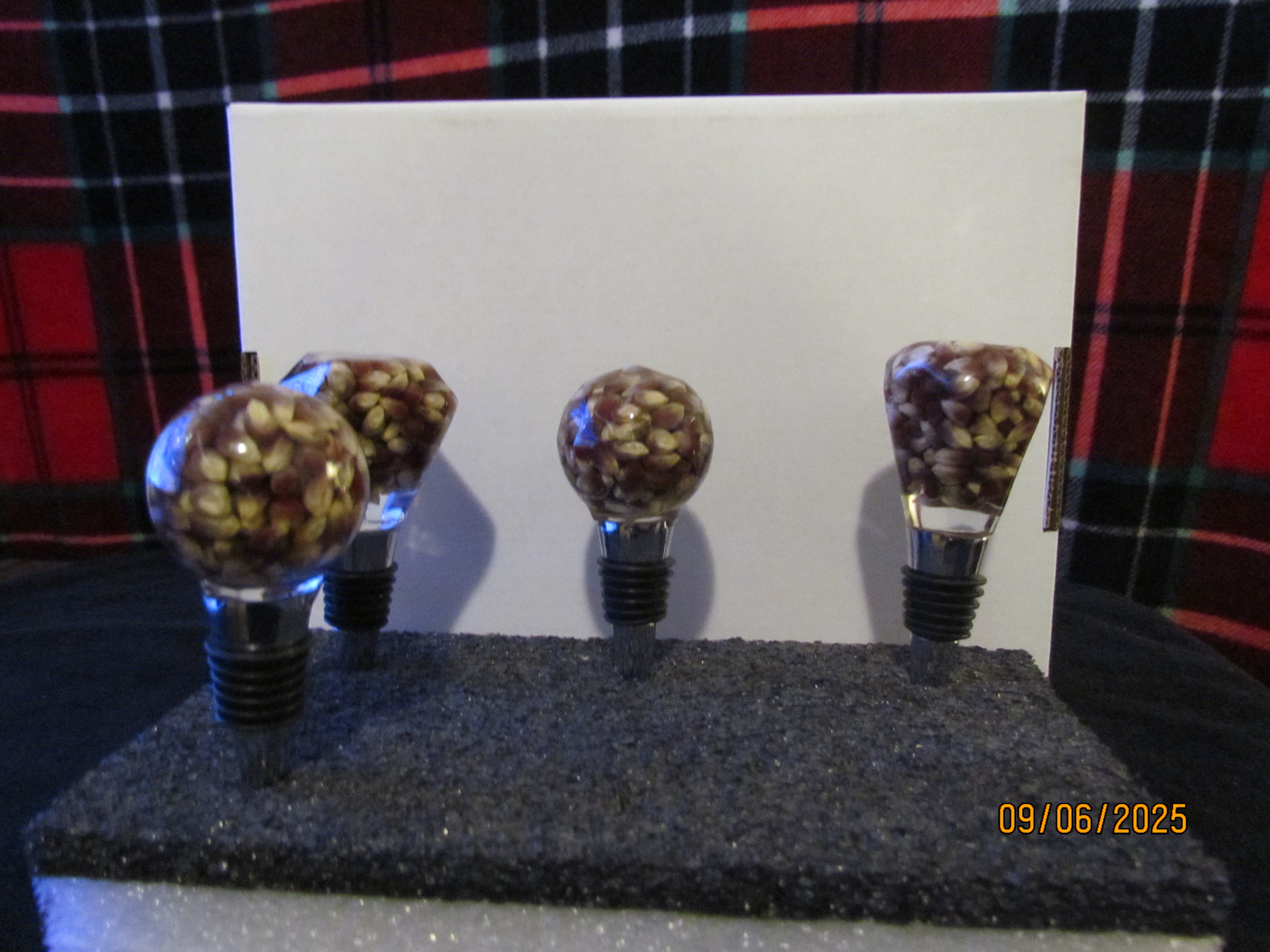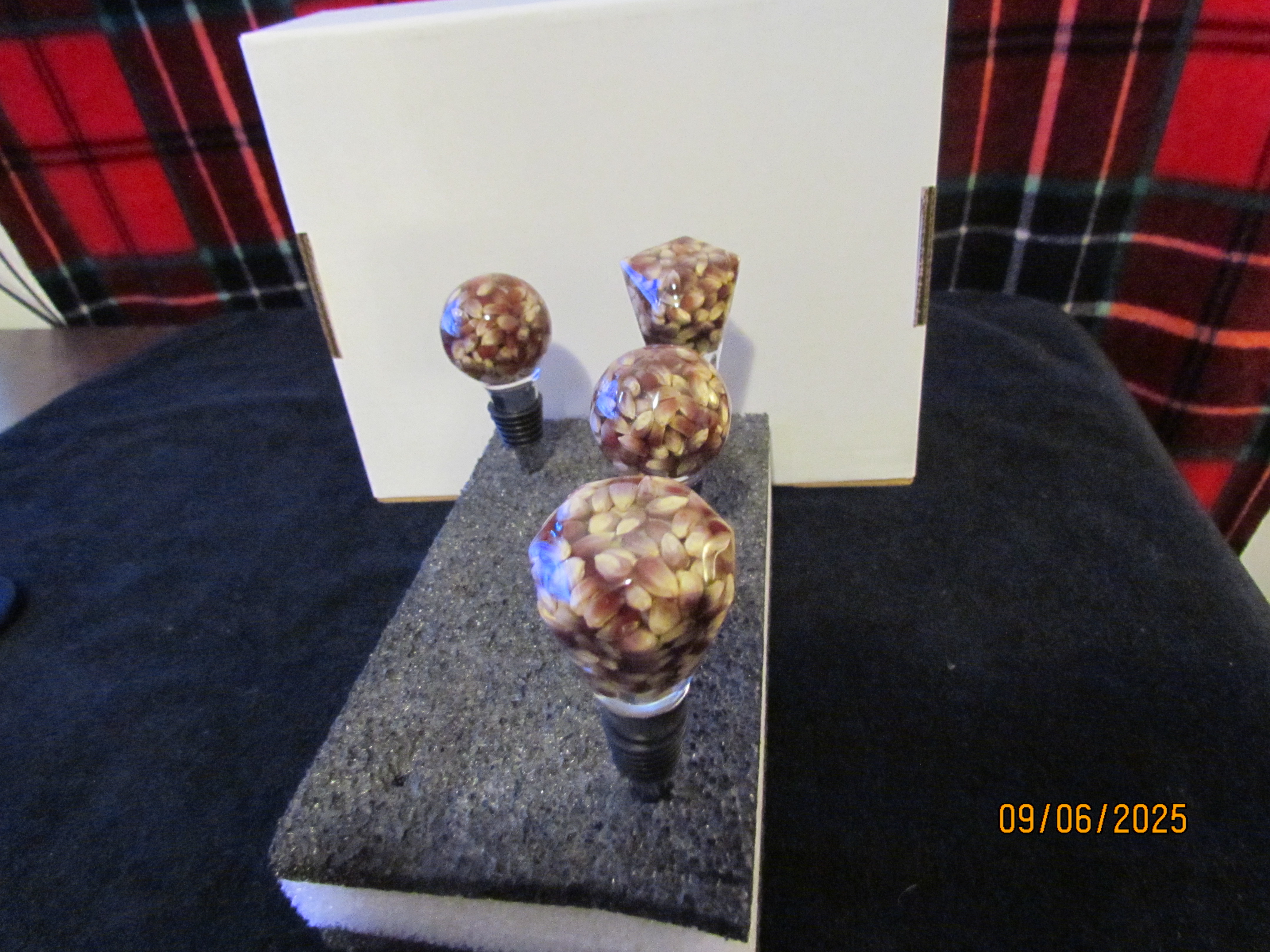 this bottle stopper is clear with popcorn inside of it. it is cylinder shaped.
