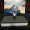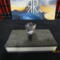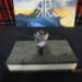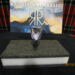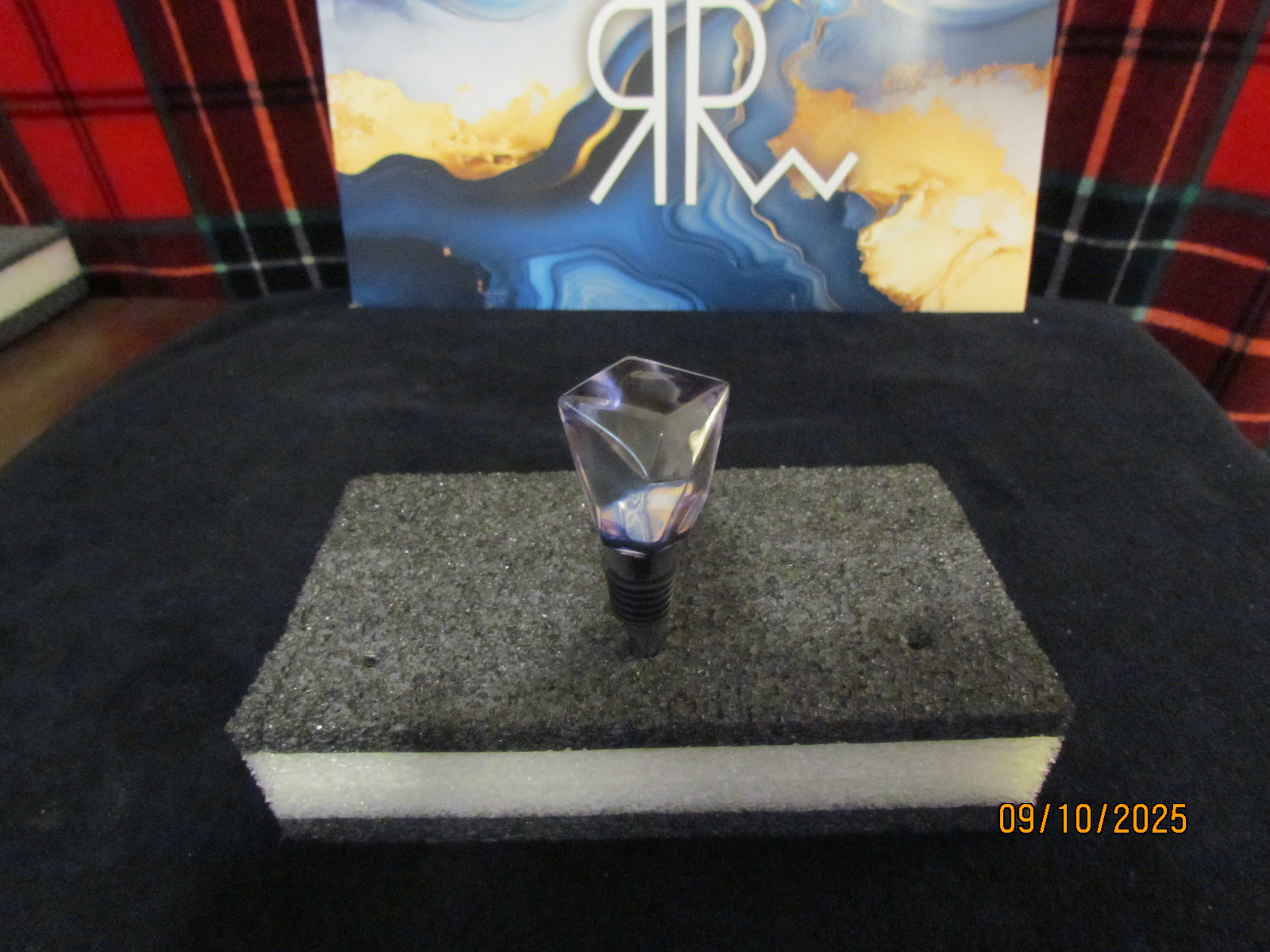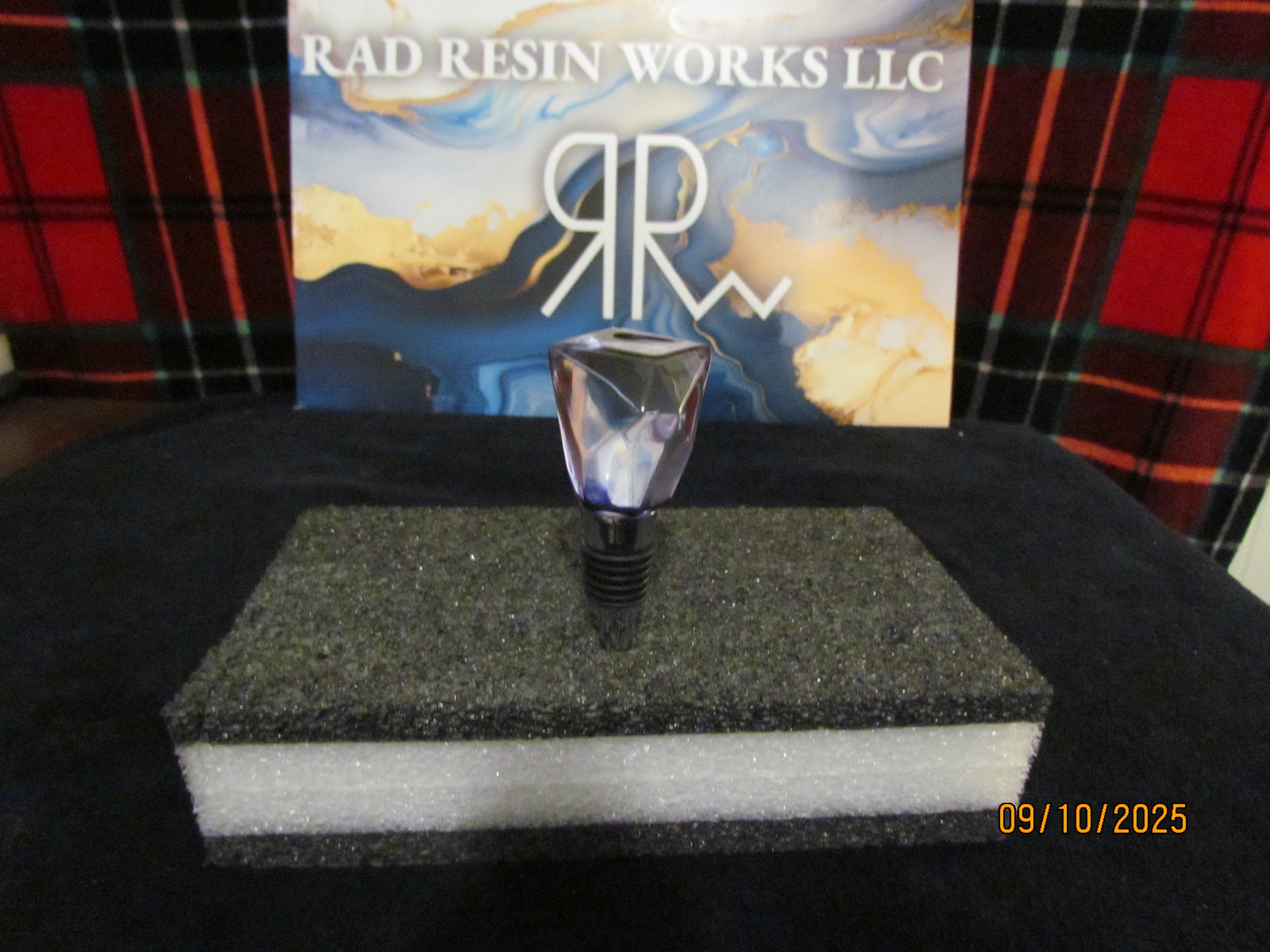 this bottle stopper is clear with purple swirls inside. its shaped like a diamond.