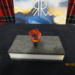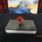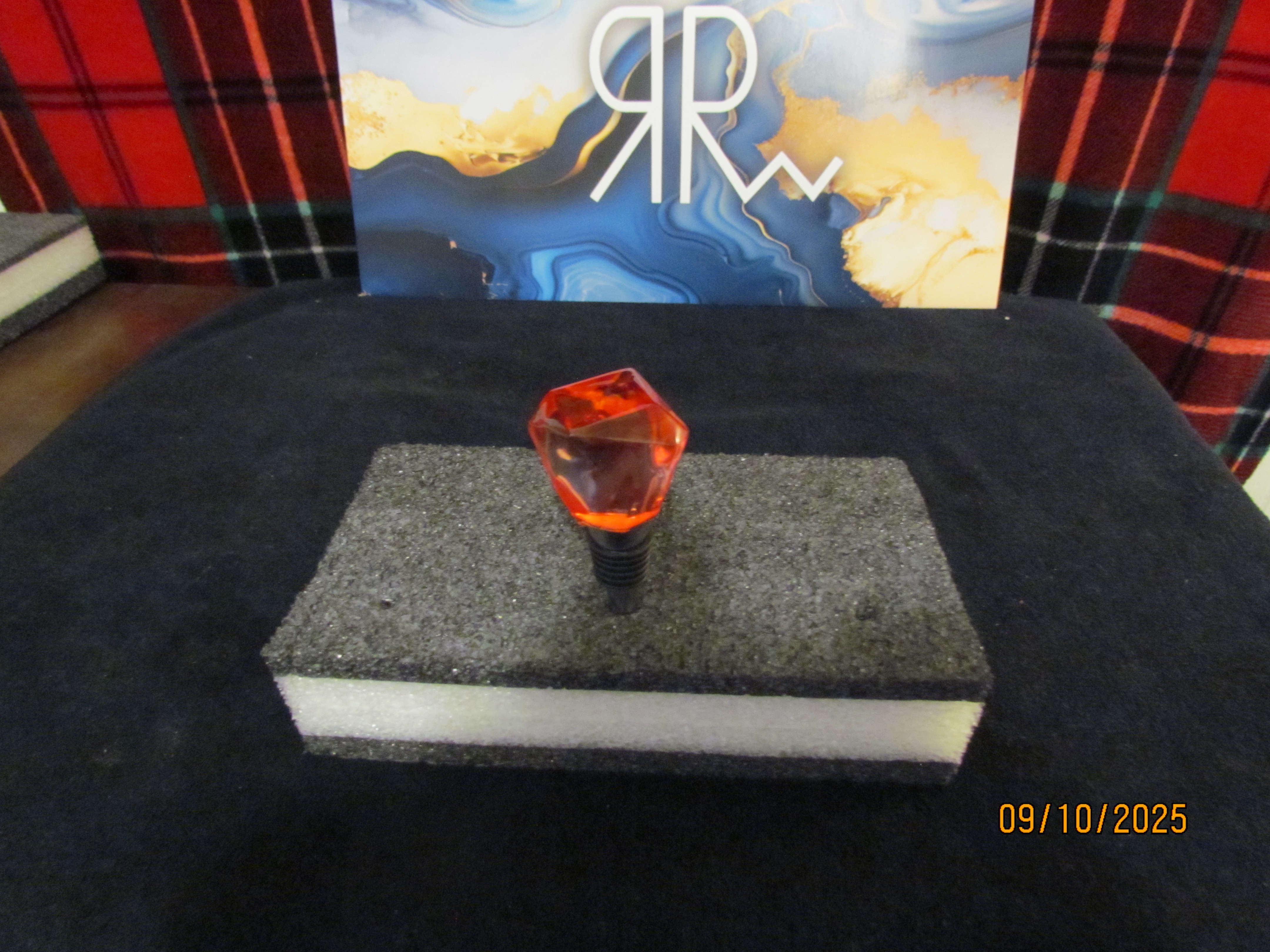 this bottle stopper is clear with red swirls inside, it is shaped like a crystal.