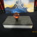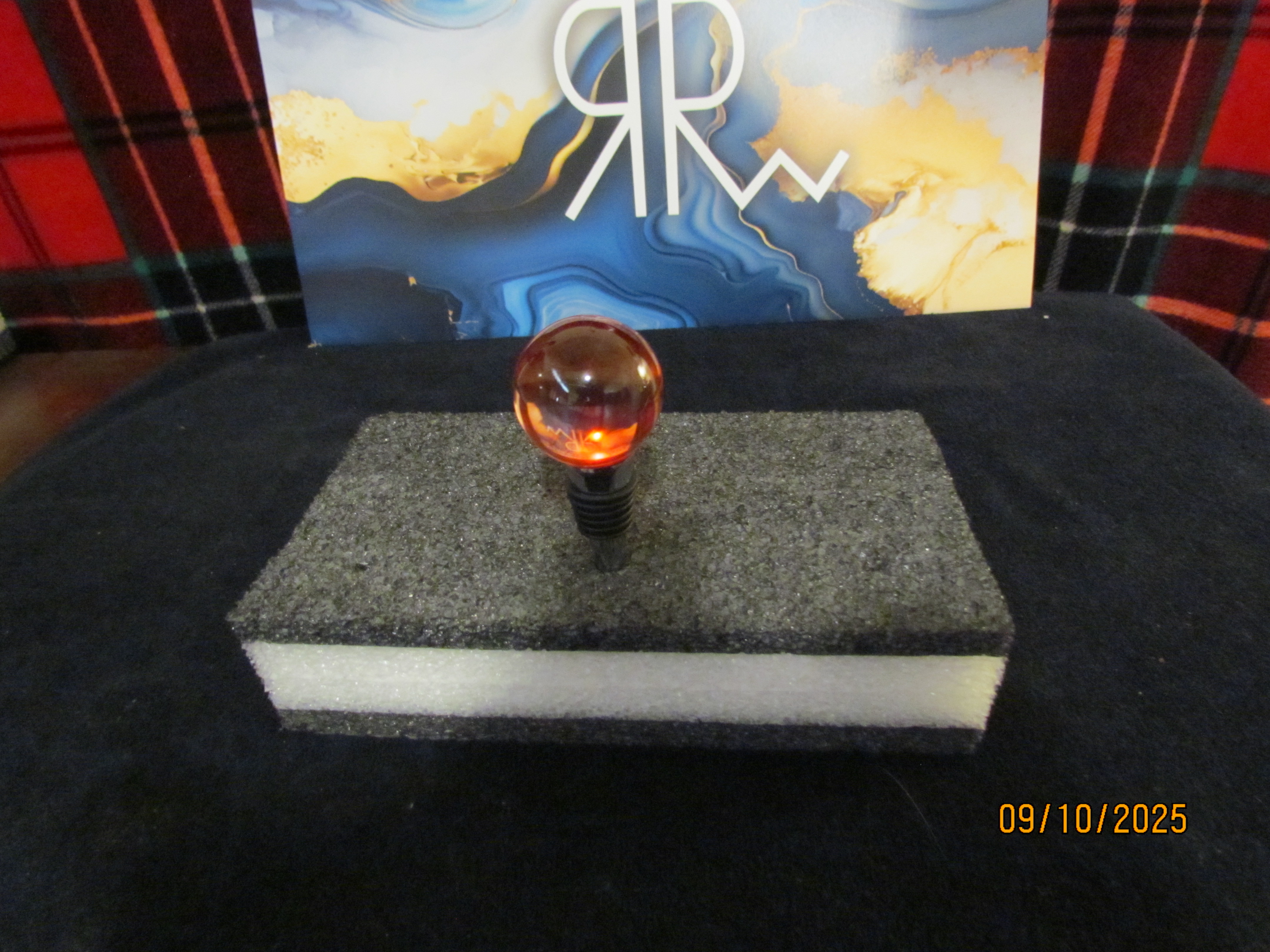 this bottle stopper is clear with red swirls inside. it is golf ball shaped.