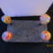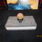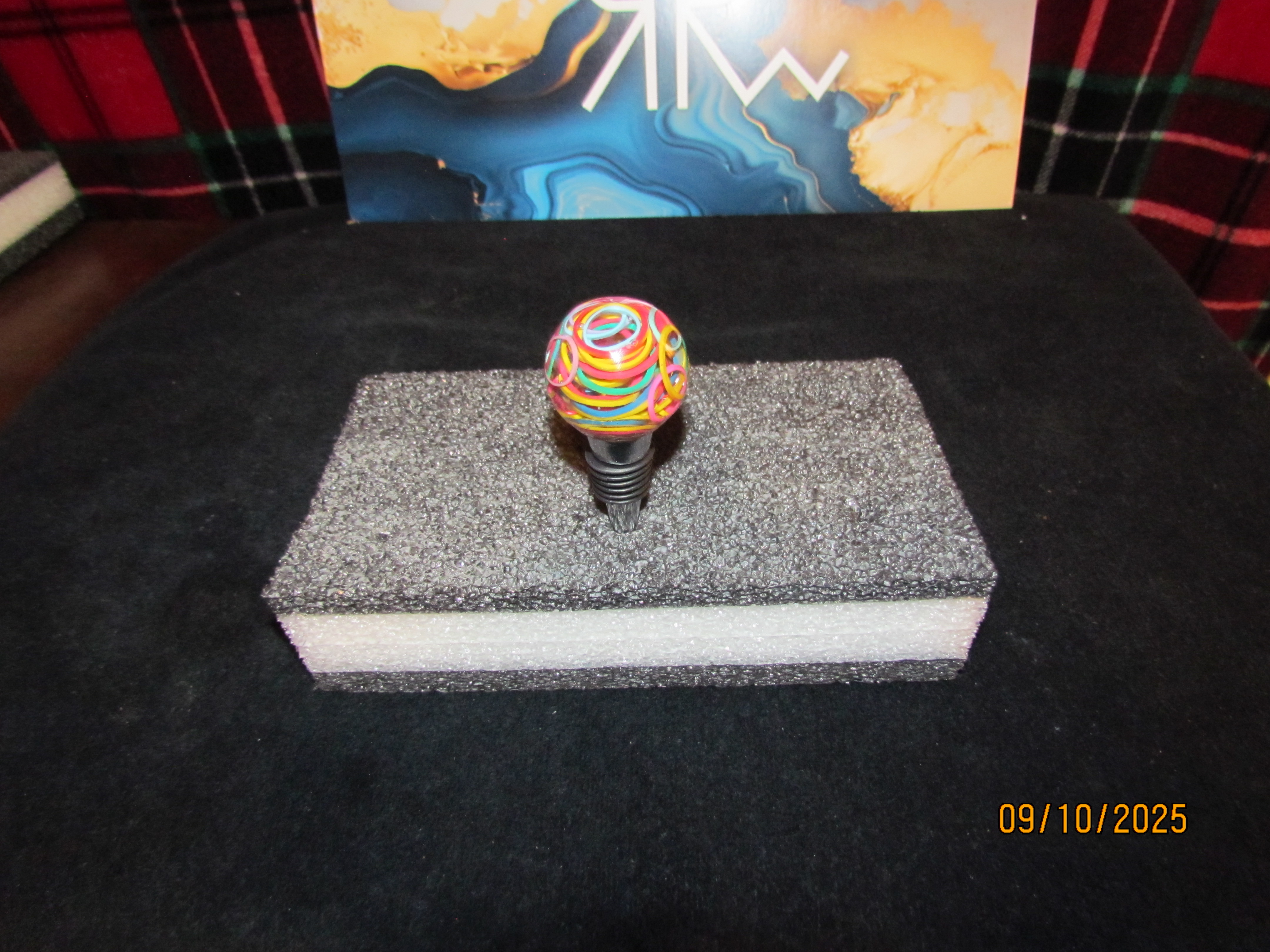 this bottle stopper is clear with rubber bands inside of it. it is golf ball shaped.